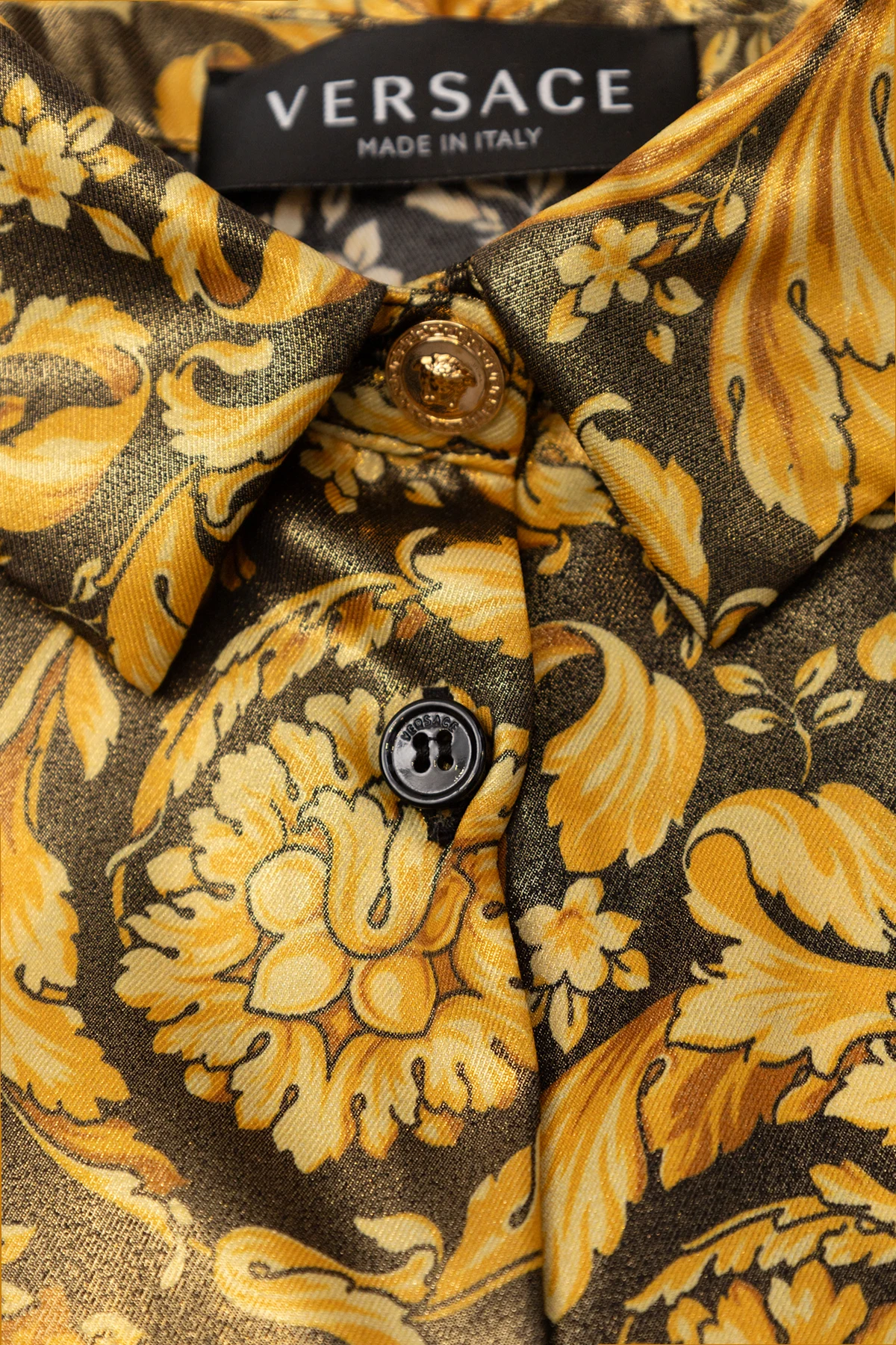 Black dress from Versace Kids. Made of shiny fabric, this design features buttons, the brand's signature Barocco pattern in yellow and brown as well as long sleeve with buttoned cuffs.