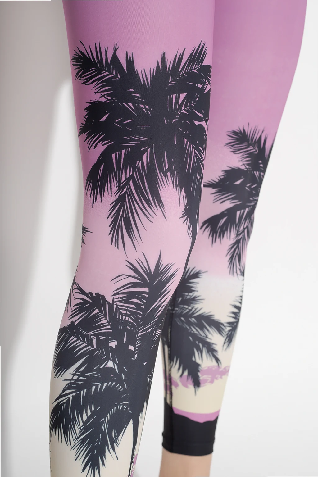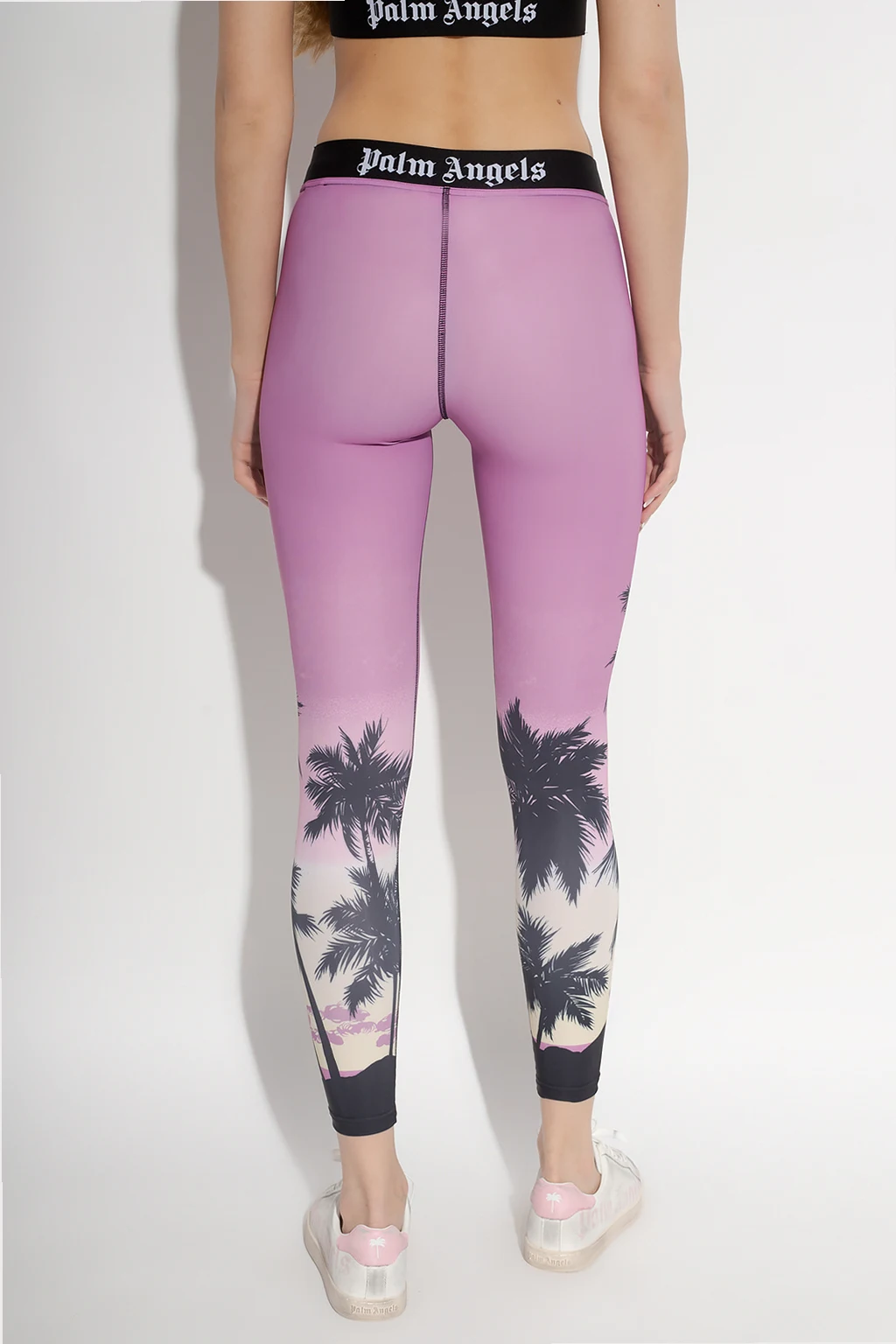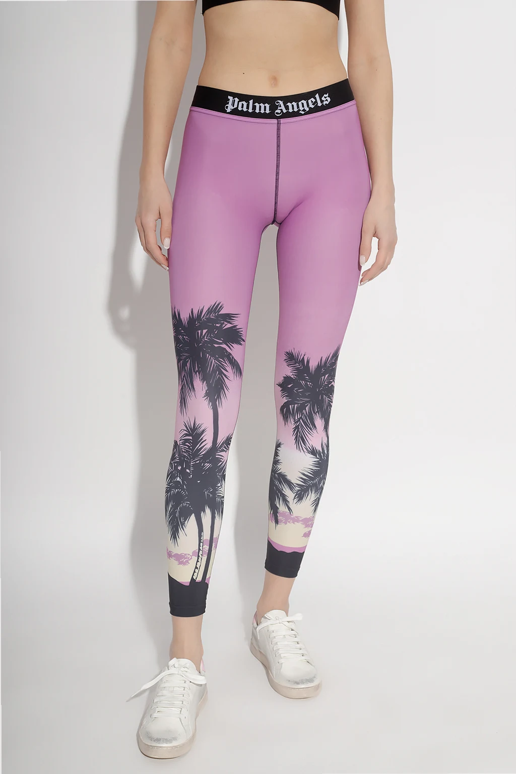 Purple leggings from Palm Angels. This pair features a logo-embroidered elastic waistband in black as well as a multicolored floral print.