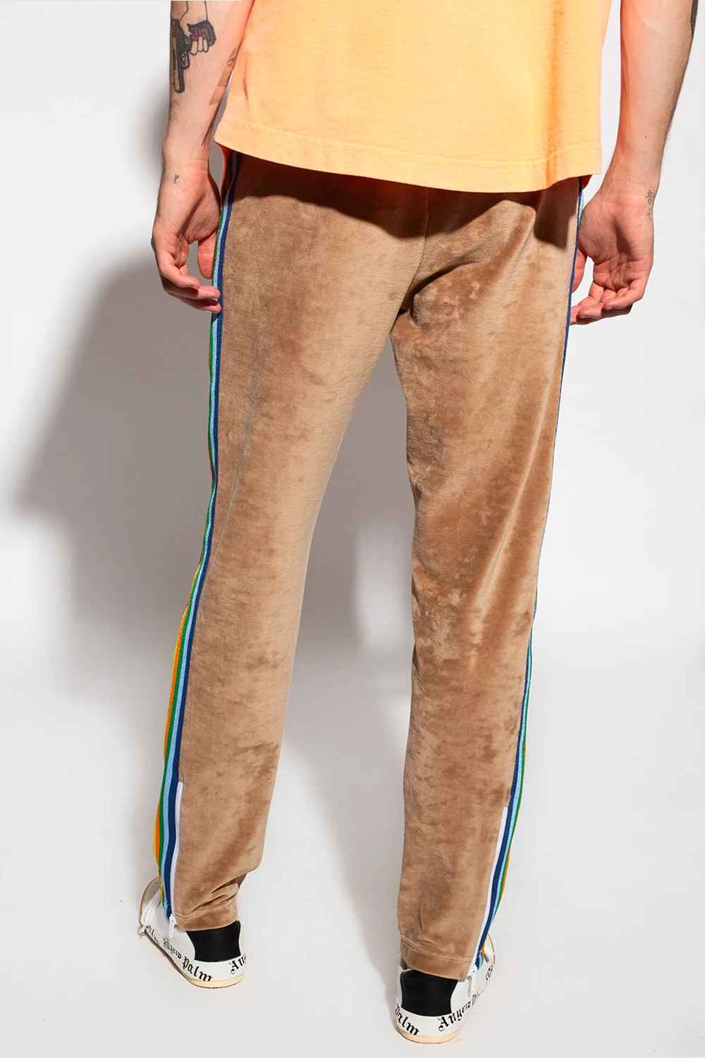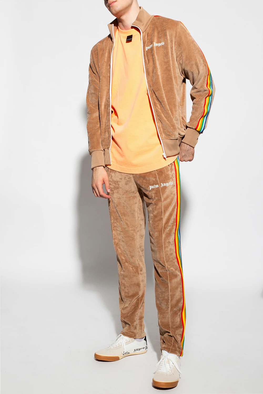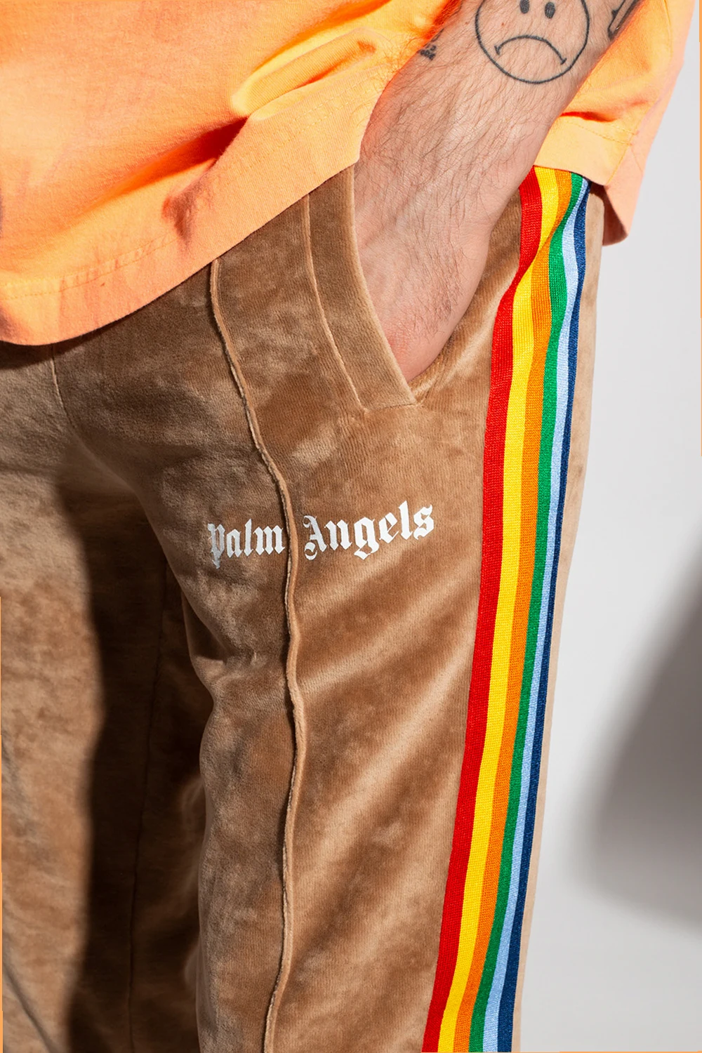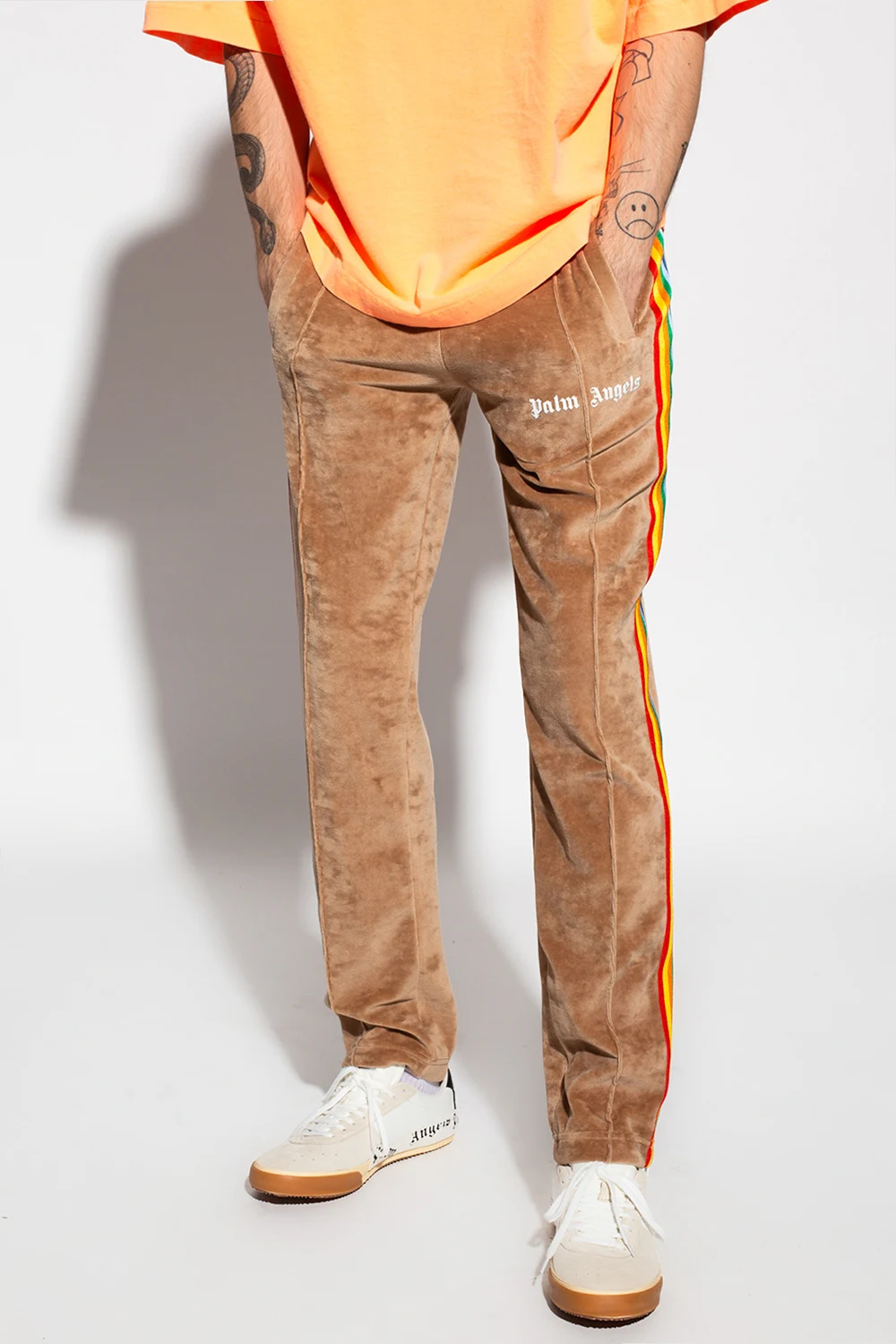 Light brown trousers from Palm Angels. Crafted from velour, this pair features an elastic waistband, logo detail, multicolored side stripes, vertical stitching details, two slip pockets and zip details.