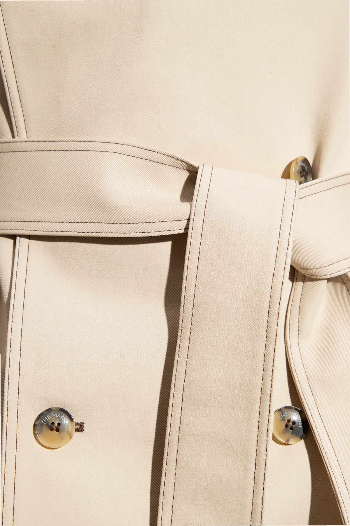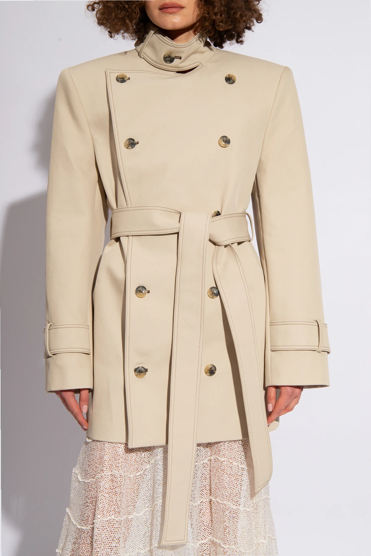 Beige ‘Stockholm’ coat from The Mannei. Crafted from a linen blend, this cropped design features buttons, a waist belt, padded shoulders, sequin stripe pattern, two slip pockets, stand collar with a buckle strap and long sleeves.