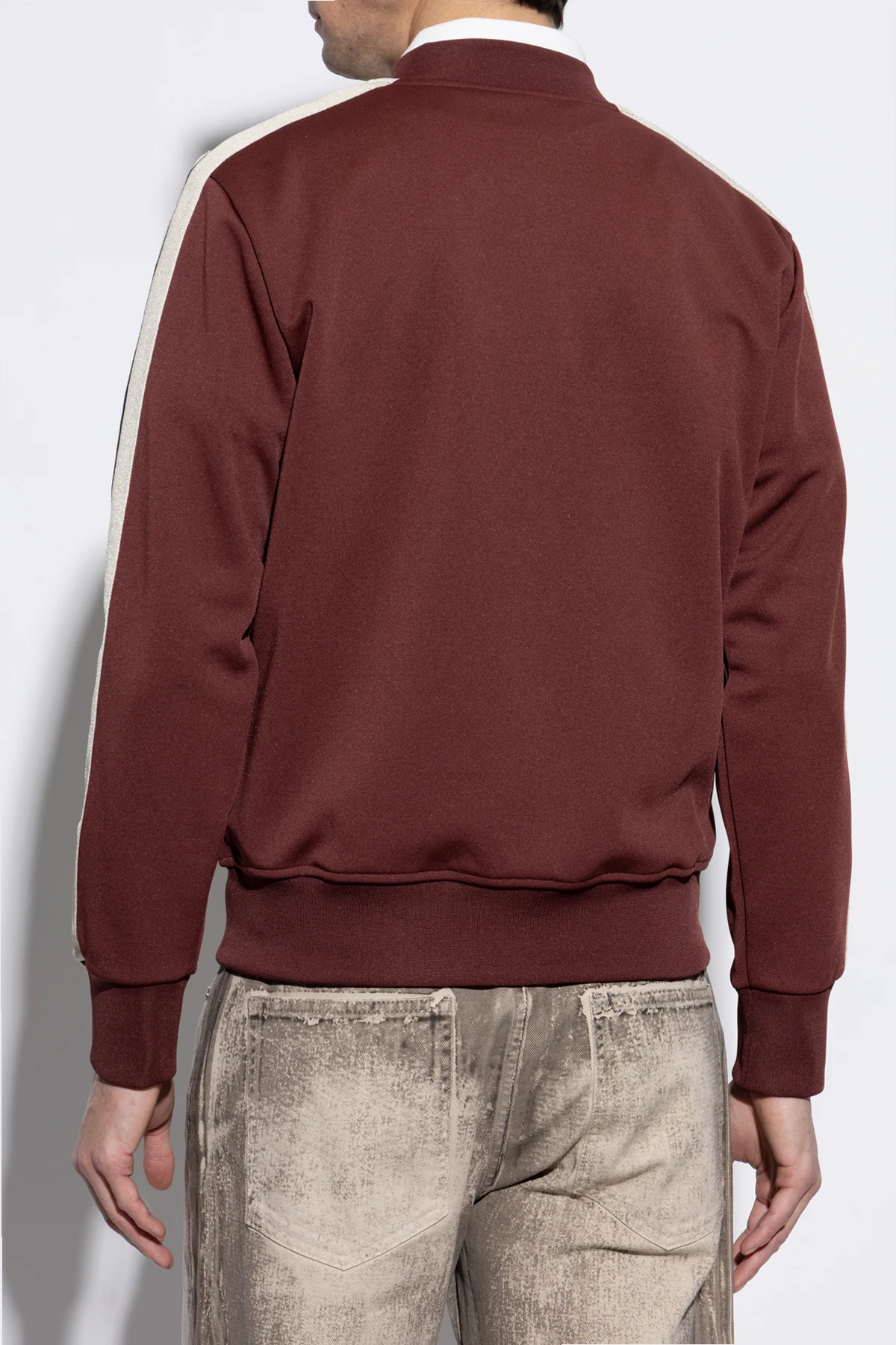 Exklusives Logo-Sweatshirt der renommierten Marke Palm Angels ist die Essenz von Luxus, kombiniert mit Streetstyle. Hergestellt aus hochwertigstem Polyester, präsentiert es sich in einem edlen bordeauxroten Farbton, der sich hervorragend mit den weißen Streifen entlang der Ärmel kombiniert und sportlichen Charakter verleiht.