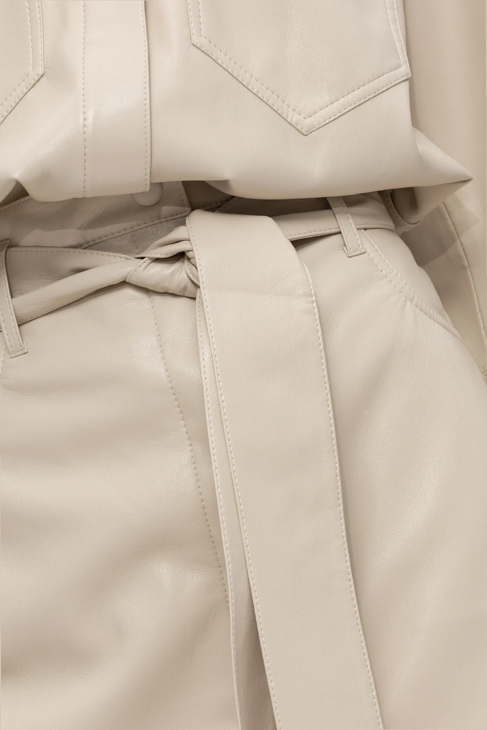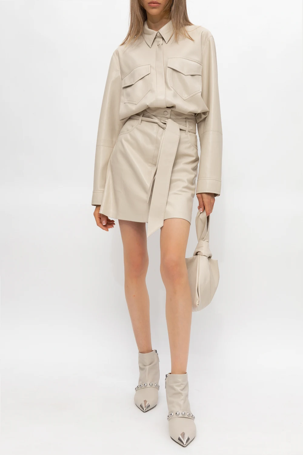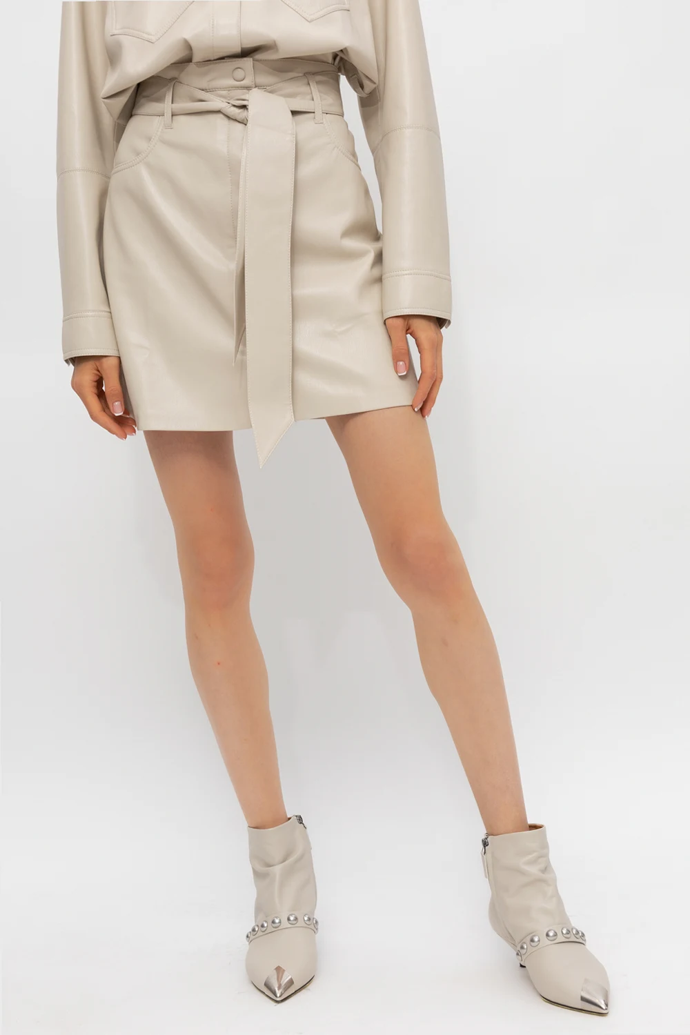 Cream ‘Meda’ mini skirt from Nanushka. Crafted from the brand's signature OKOBOR™ vegan leather, this style features an attached waist-cinching belt, a snap closure with concealed buttons, and four slip pockets.