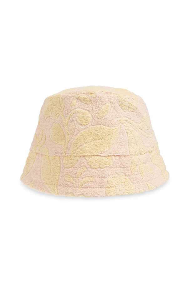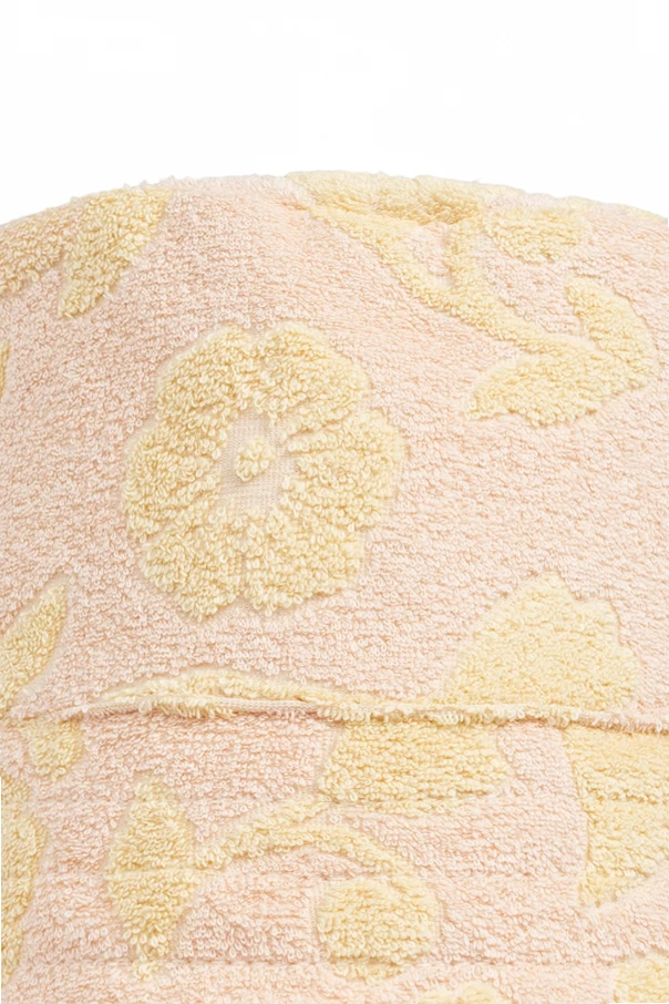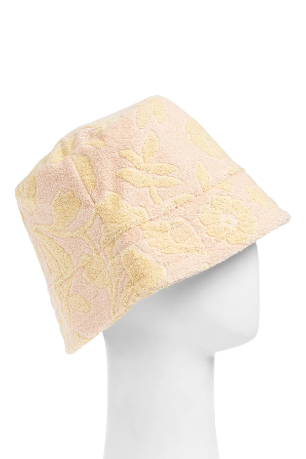 Frottee-Baumwollhut ist die Quintessenz subtiler Eleganz und Leichtigkeit bei Kinderaccessoires. Die außergewöhnliche Schlingenstruktur des Frottee-Baumwollgewebes begeistert mit besonderer Weichheit und bietet hervorragende Saugfähigkeit, wodurch der Hut äußerst angenehm im Griff ist. Die klassische Form des Bucket Hat mit leicht nach unten geschwungener Krempe harmoniert perfekt mit dem zarten, gelben floralen Motiv, das den pastellfarbenen Hintergrund dezent ziert. Die Kunst des Details zeigt sich in der sorgfältigen Verarbeitung – keine abstehenden Fäden und verdeckte Nähte unterstreichen die handwerkliche Präzision der Marke Chloé Kids. Die seitlich aufgestickte Schriftzug ist eine dezente Besonderheit des Produkts.