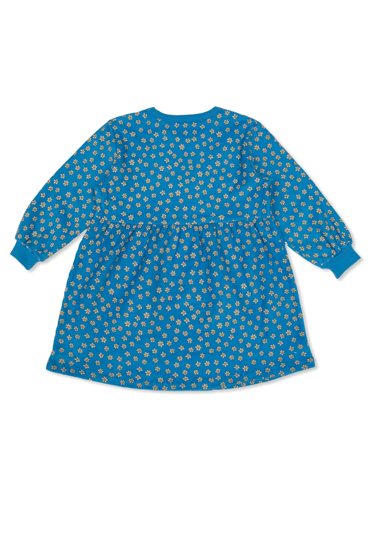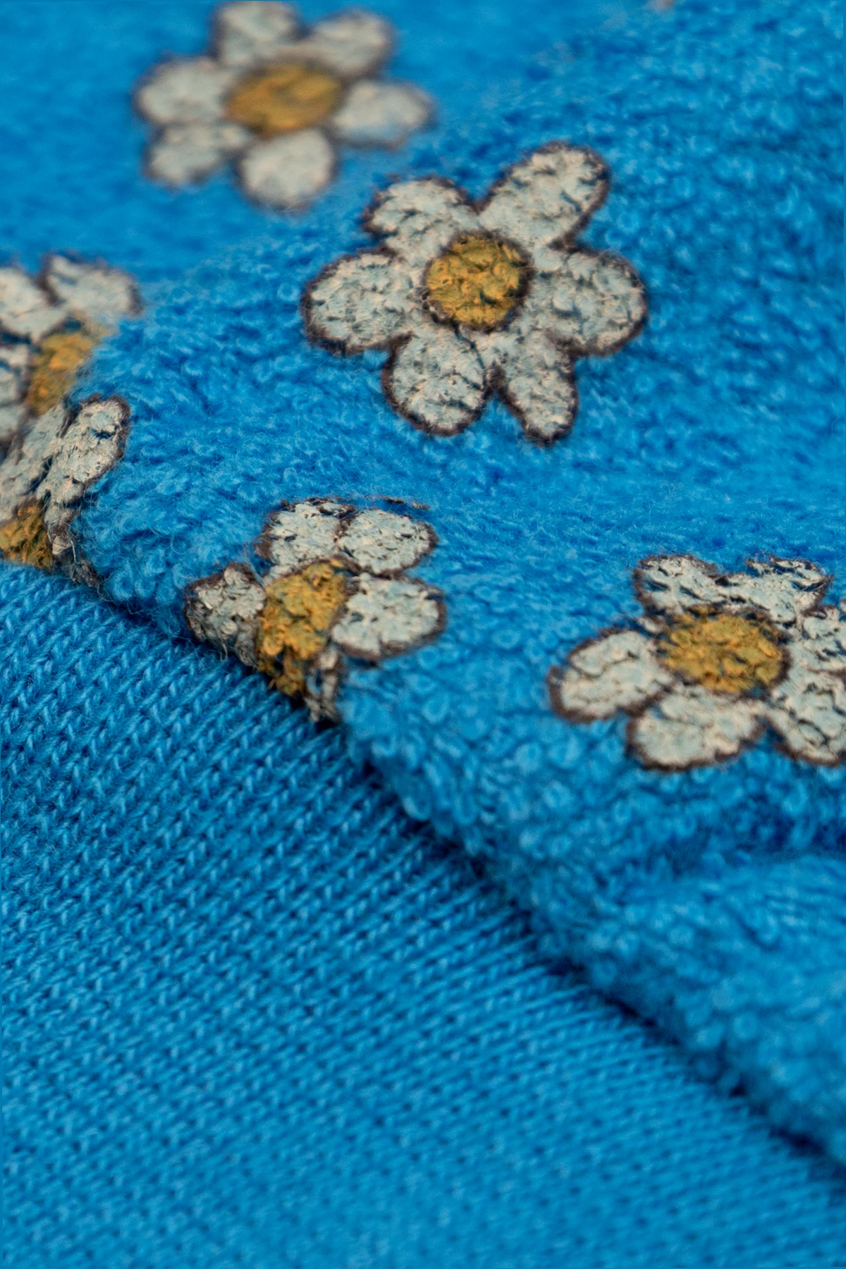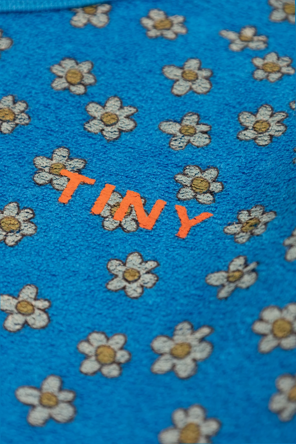 Das Muster des Kleides besteht aus kleinen weißen Blumen mit gelben Mittelpunkten, die einen Kontrast zur dominierenden blauen Farbe des Stoffes bilden und ihm einen fröhlichen und mädchenhaften Charakter verleihen. Auf der Brust befindet sich der Schriftzug „ TINY “ in kontrastierendem Orangeton, der die Marke hervorhebt.