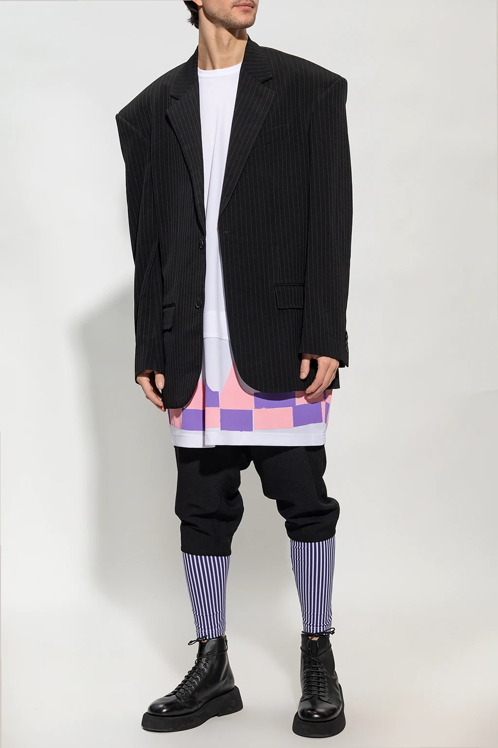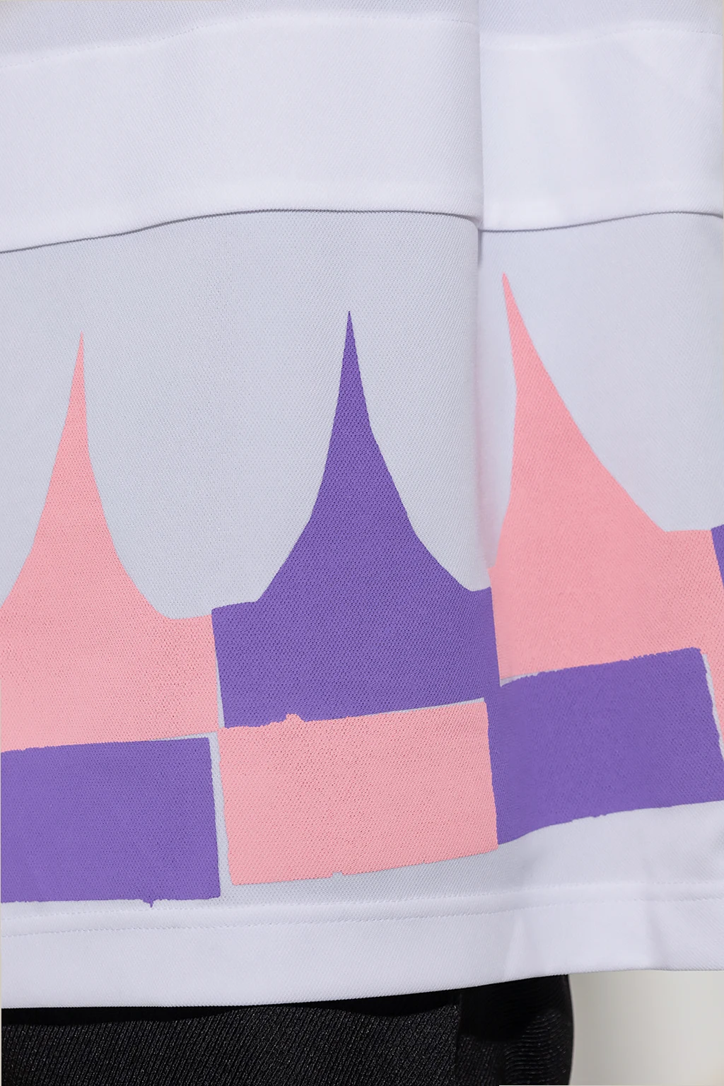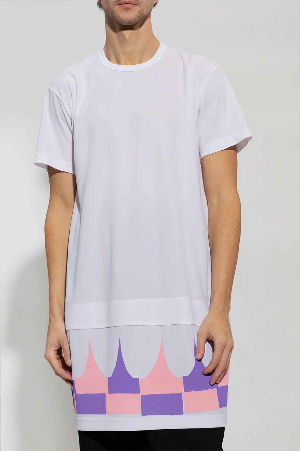 White crewneck T-shirt with short sleeves from Comme des Garcons Homme Plus. Cut with a long fit, this style features a pink and purple graphic at the hem and an attached velcro strap.