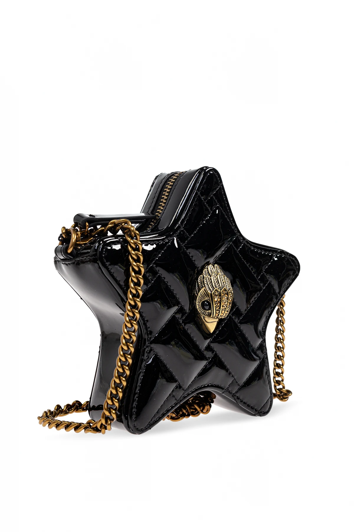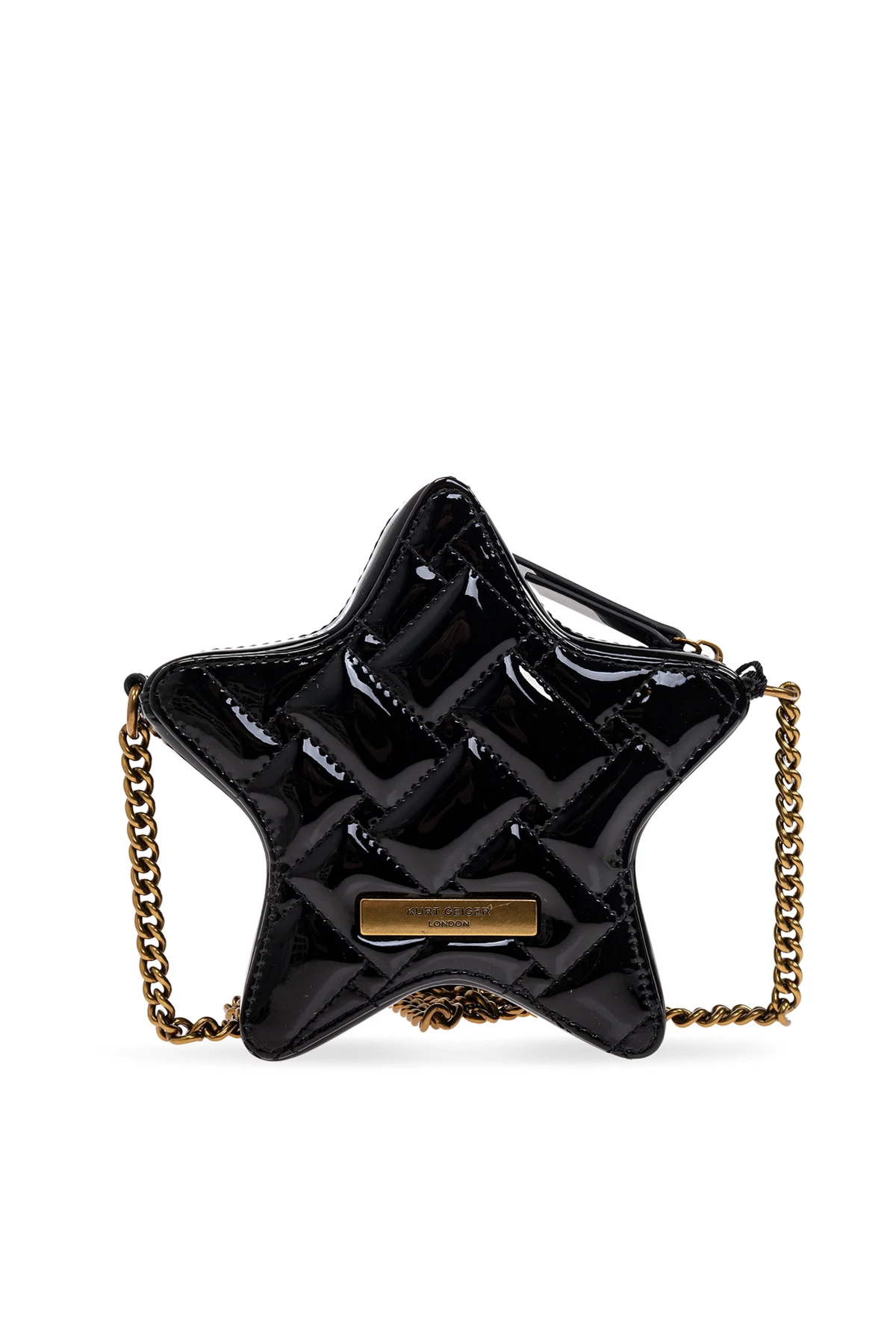 Wir präsentieren die Schultertasche 'Kensington Camera' , ein Meisterwerk der britischen Marke Kurt Geiger . Diese exklusive Tasche zieht mit ihrer einzigartigen Sternform die Blicke auf sich, gefertigt aus hochwertigem schwarzem, lackiertem Leder, das ihr ein elegantes und glänzendes Aussehen verleiht.