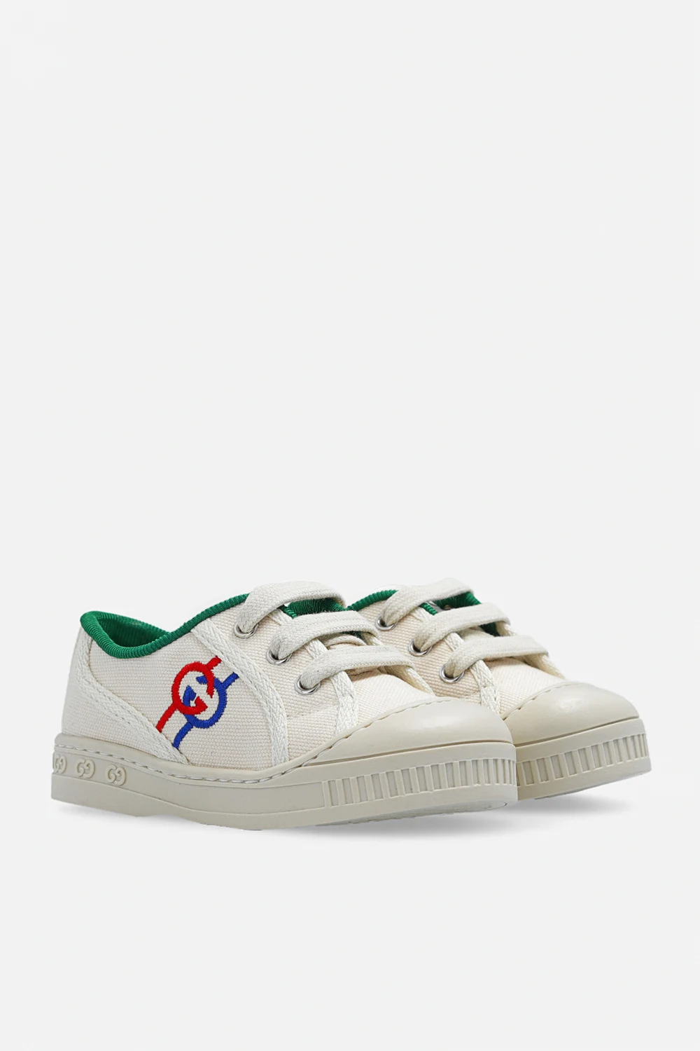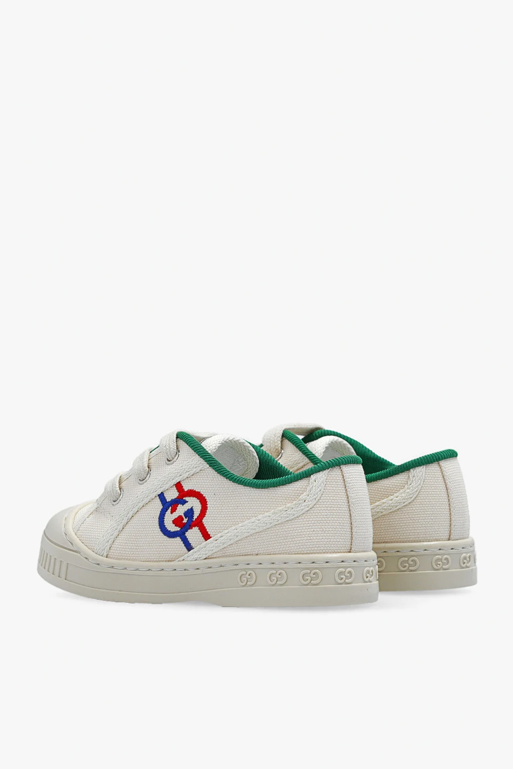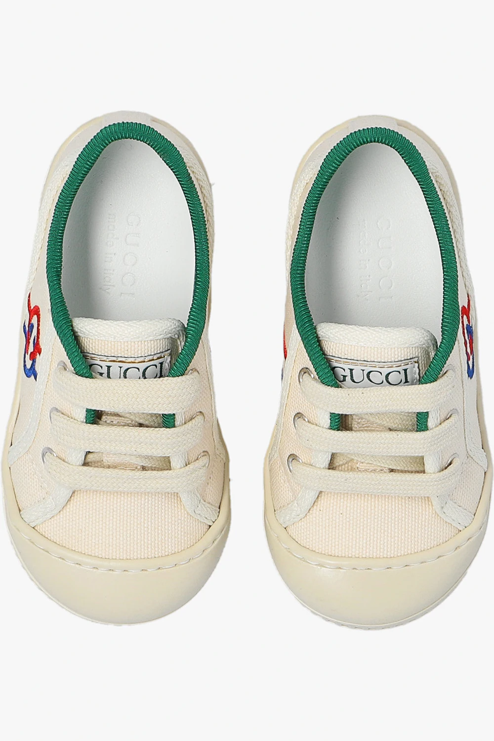 Cream and green ‘Tennis 1977’ boots from Gucci Kids. Made of canvas, this lace-up pair features a logo patch on the tongue, navy and red Interlocking G embroidery and cream rubber sole.