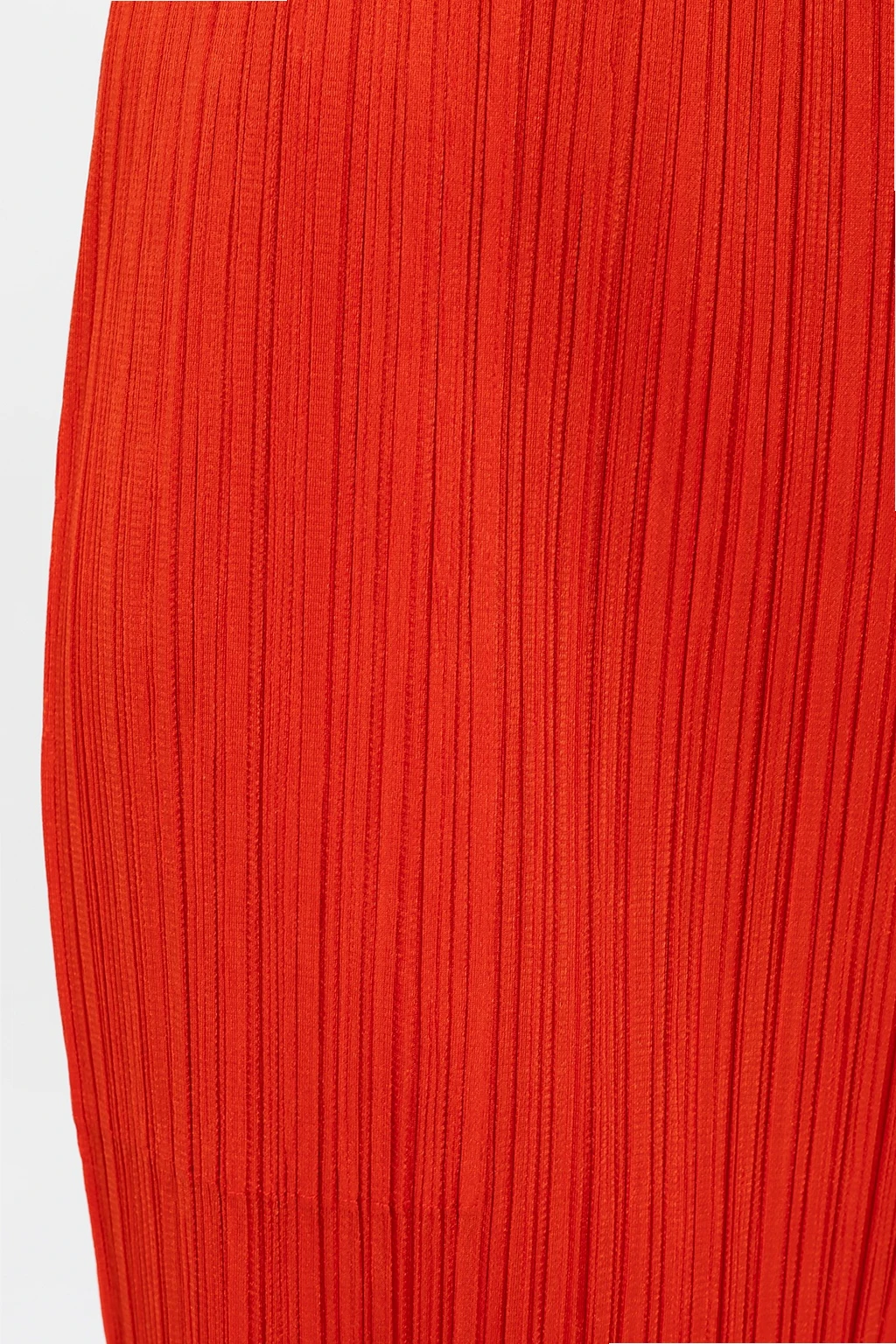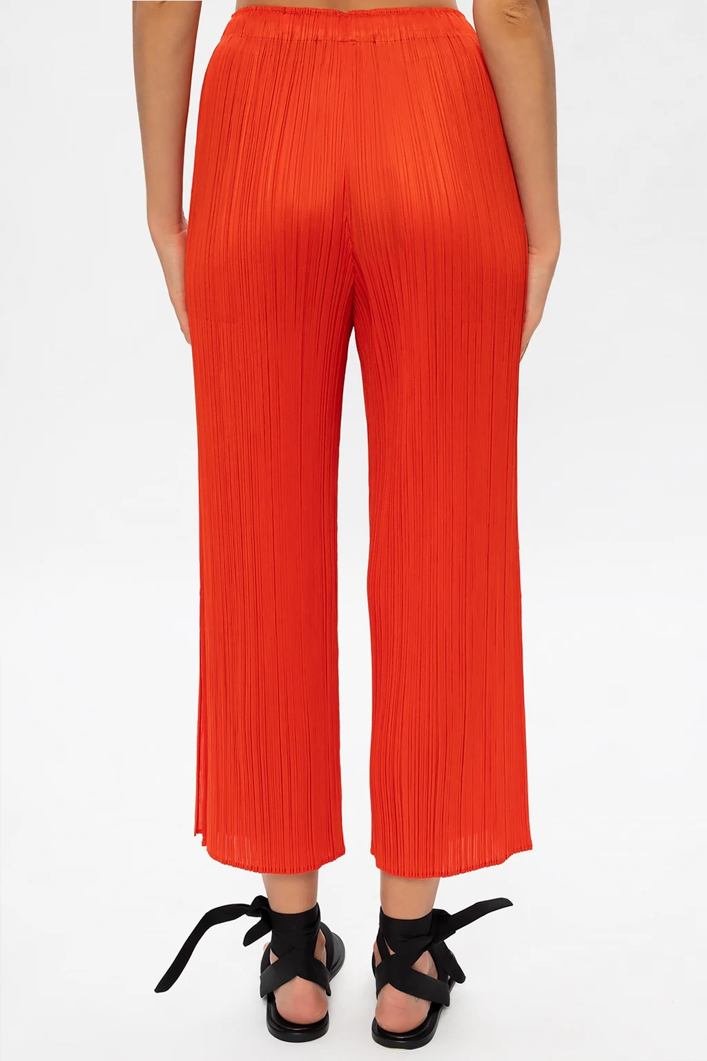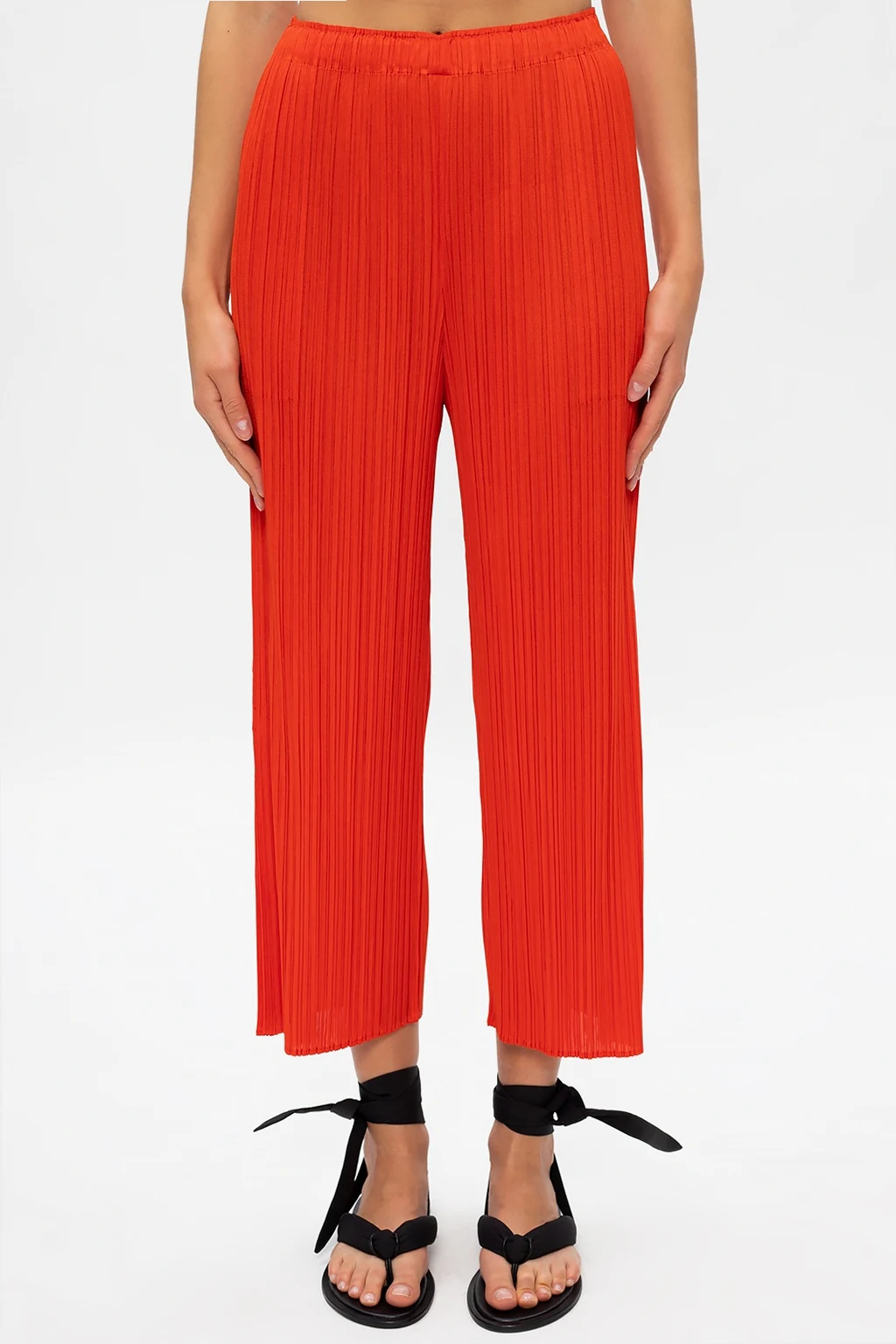 Red trousers from Issey Miyake Pleats Please. Arrayed with the label's signature pleating, this pair has an elasticated waistband and straight, cropped legs with vents at leg openings.