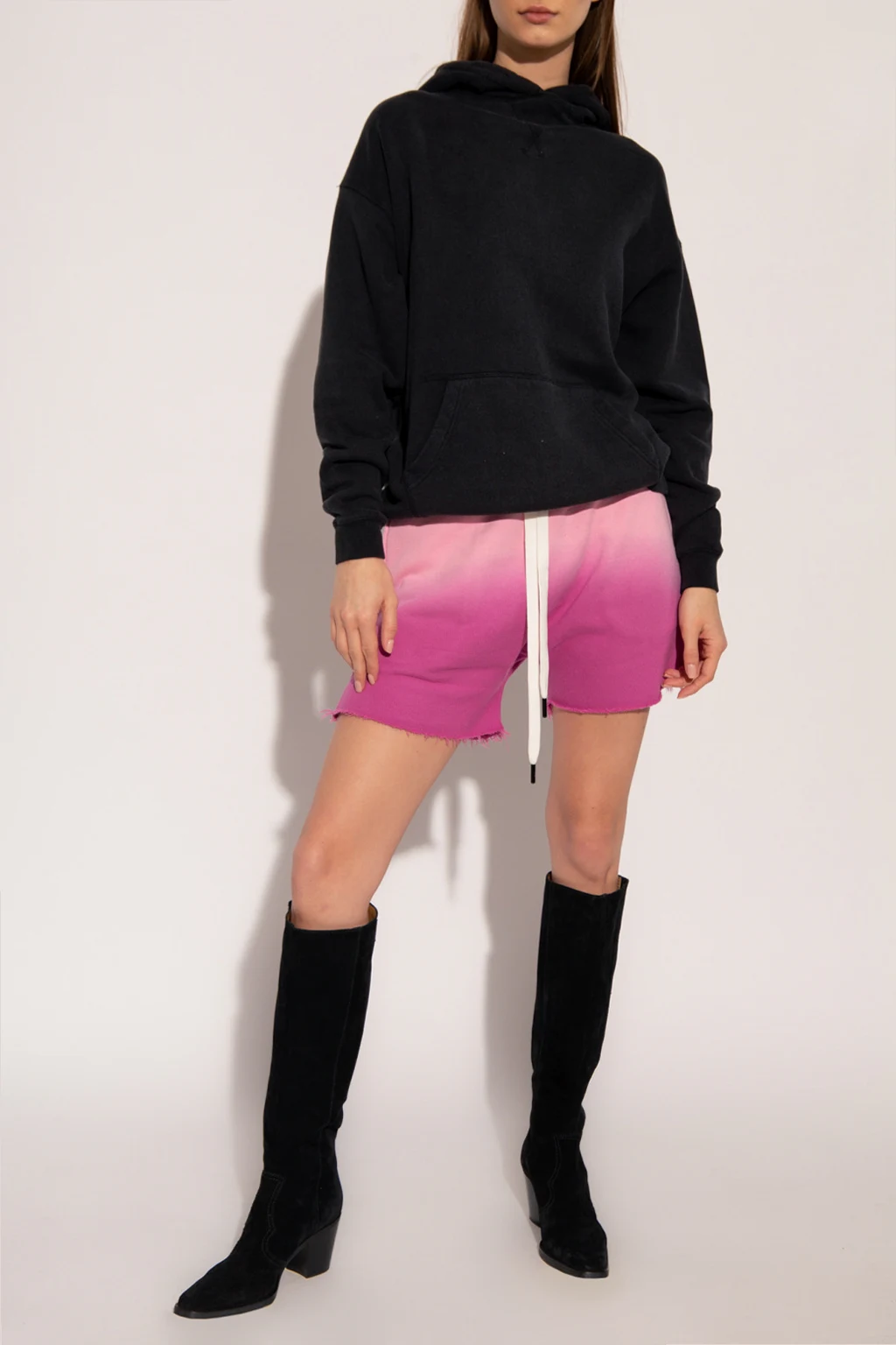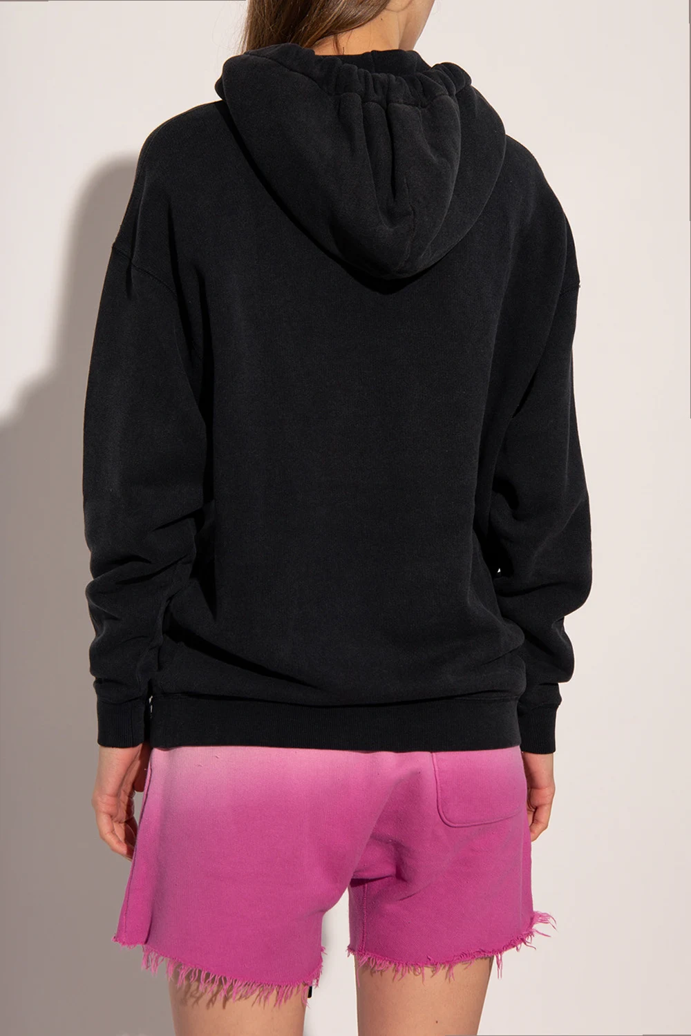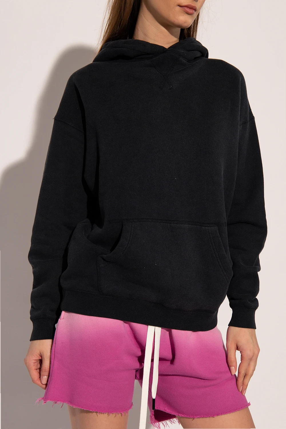 Black hoodie from R13. Crafted from cotton jersey, this style features distressed detailing, a black and white logo patch, a kangaroo pocket and ribbed trims on the bottom hem and cuffs.