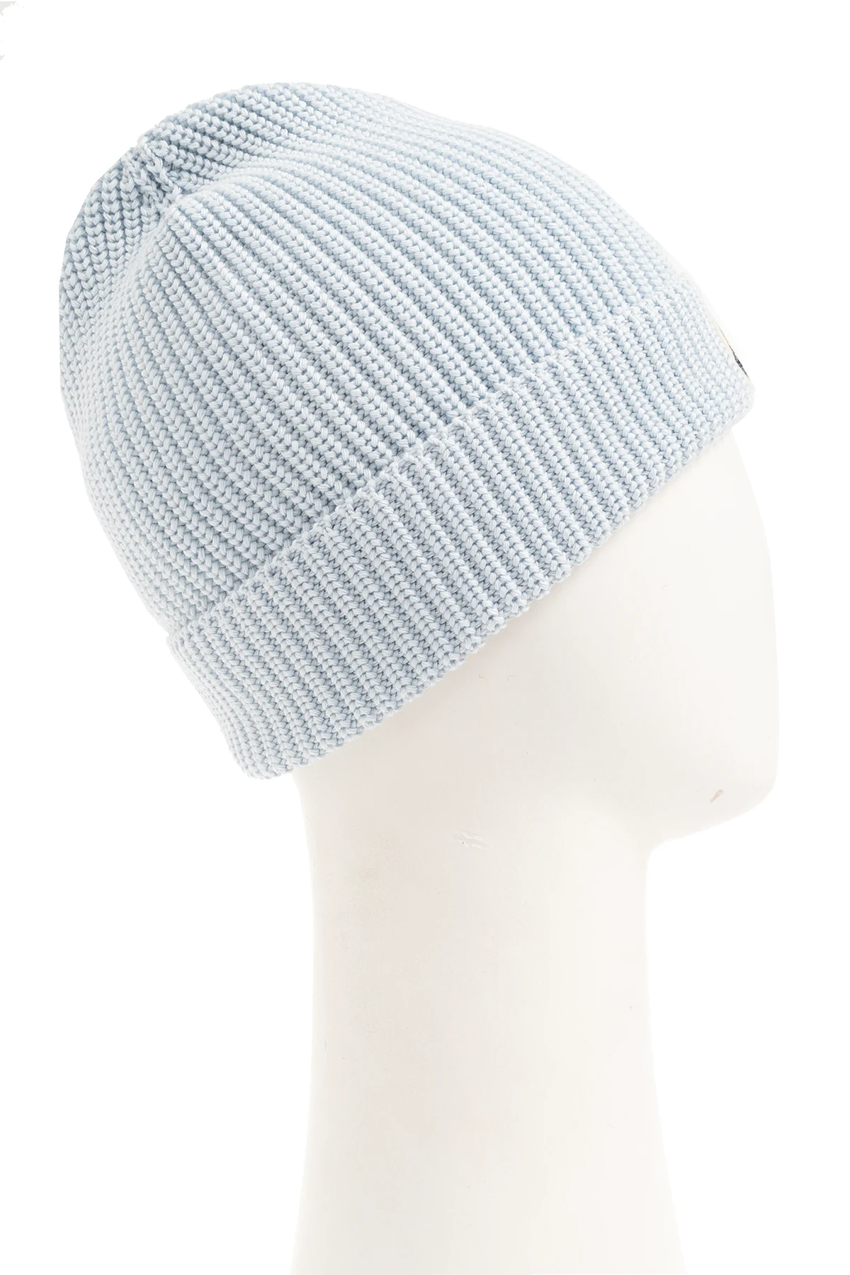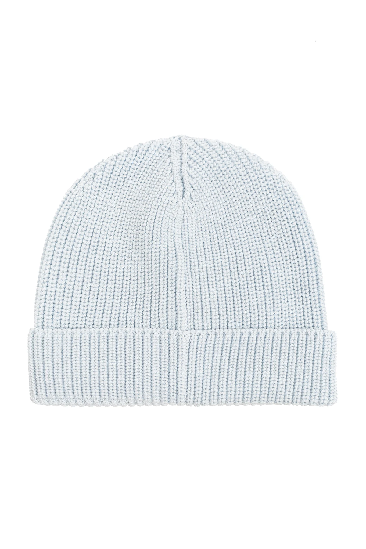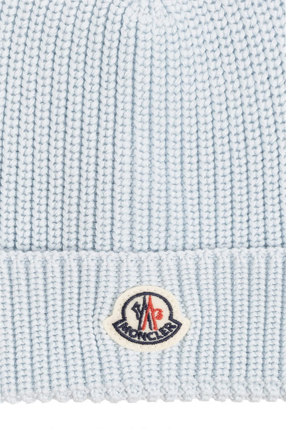 Blue knit beanie from Moncler Enfant. Made of cotton, this item features a cream logo-embroidered patch in red and navy.