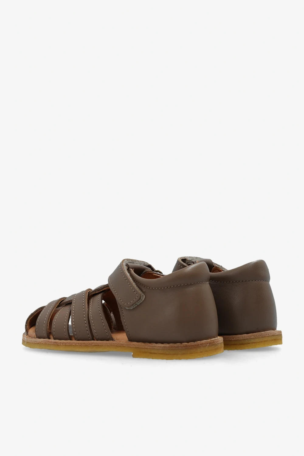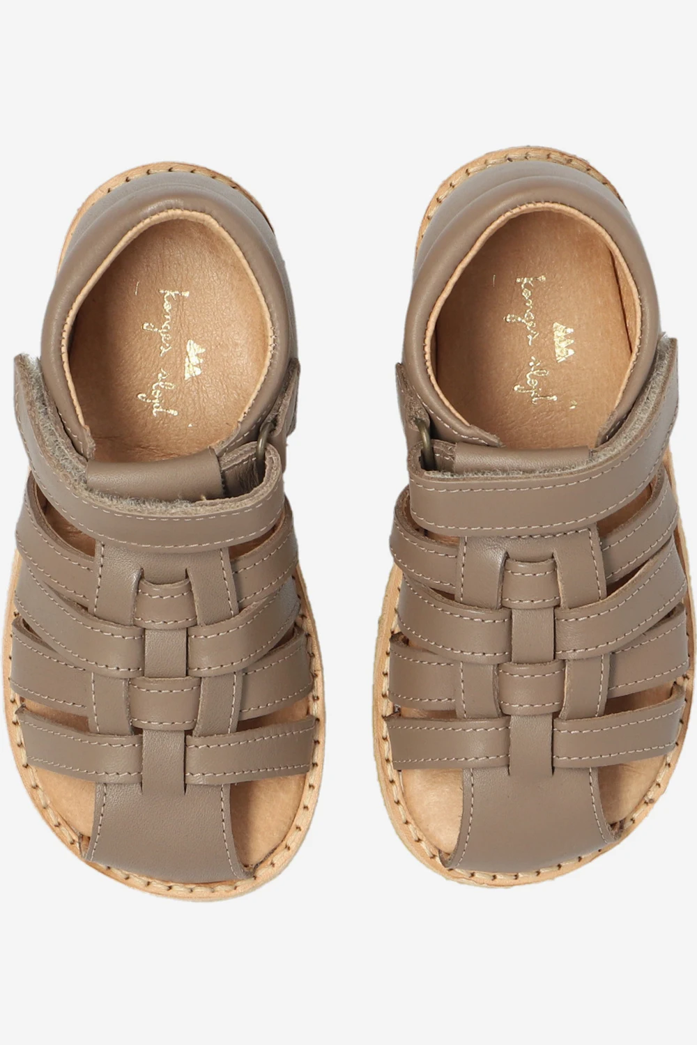 Brown and grey ‘Lapinou’ sandals from Konges Slojd. Made of leather. Fastened with velcro, this pair features decorative woven straps and beige rubber sole.