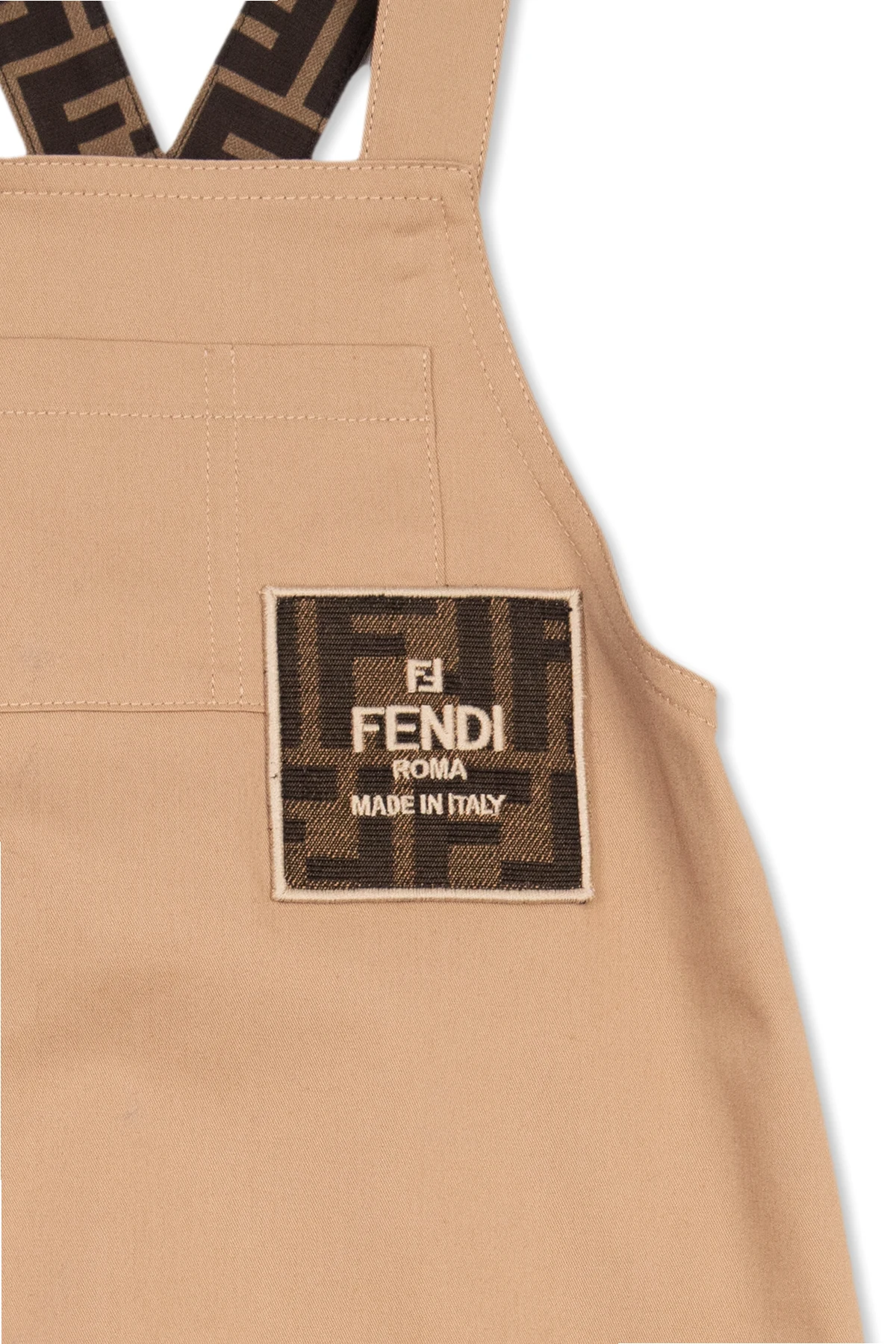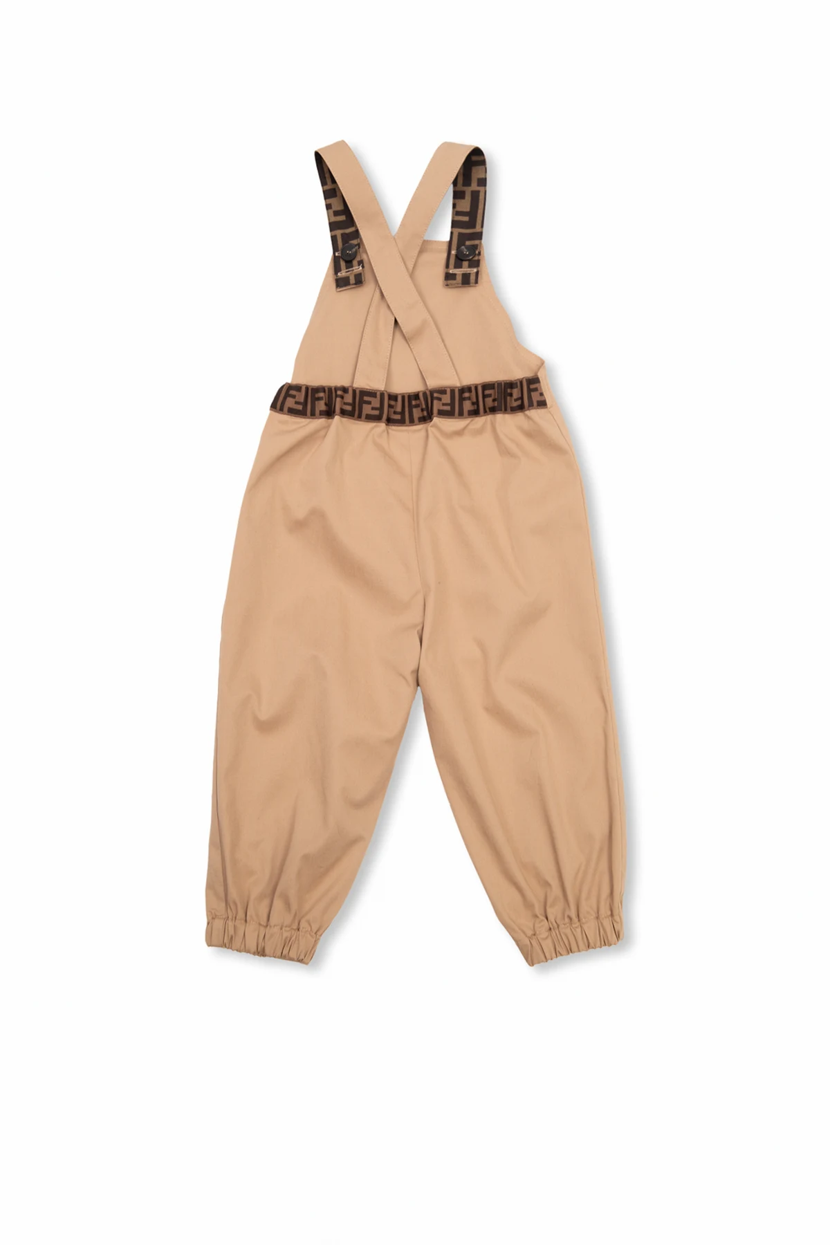 Beige jumpsuit from Fendi Kids. Made of cotton, this style is embellished with a logo patch and features one slip pocket, buttoned shoulder straps and elasticized cuffs.