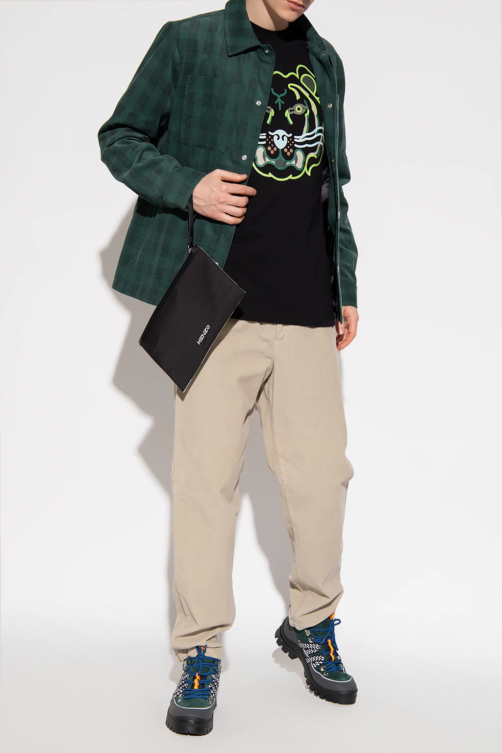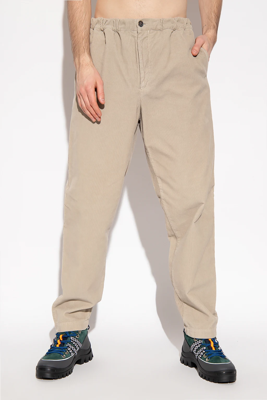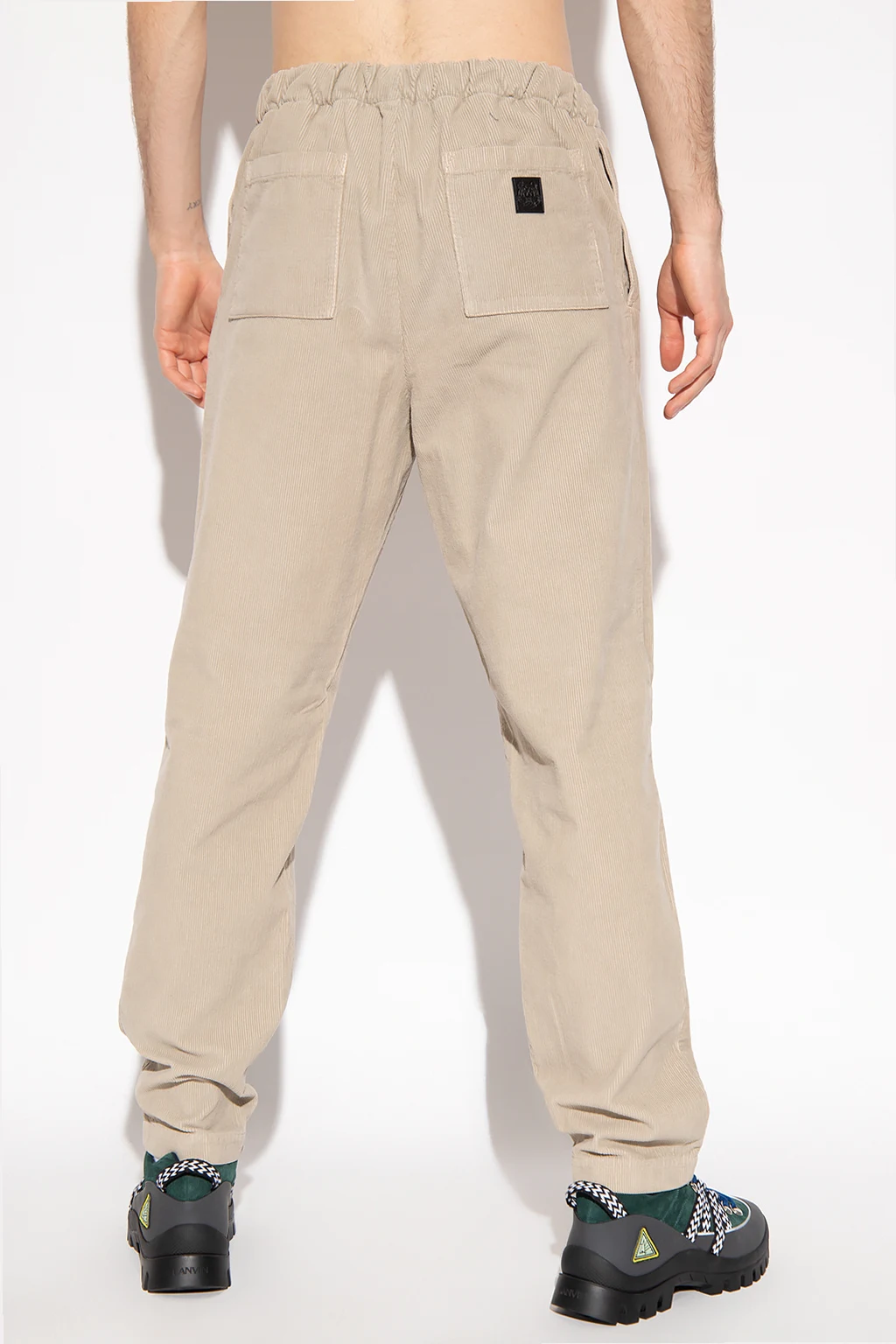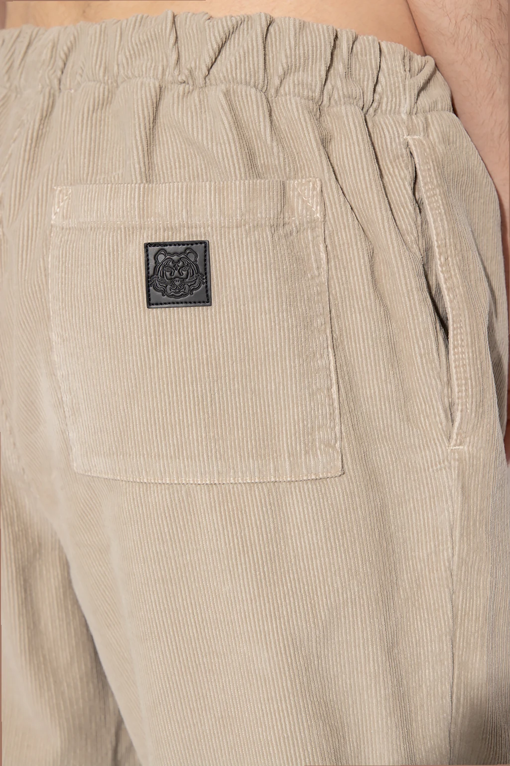 Greyish-beige corduroy joggers from Kenzo. Falling with straight legs, this pair features an elasticated waistband, a zip fly with a button, four slip pockets and a black patch with an embossed tiger motif.