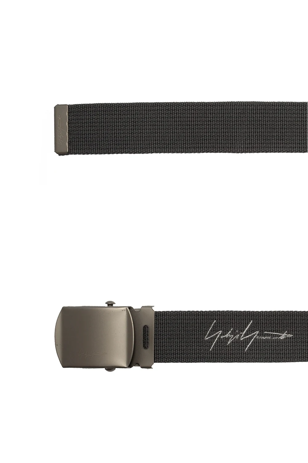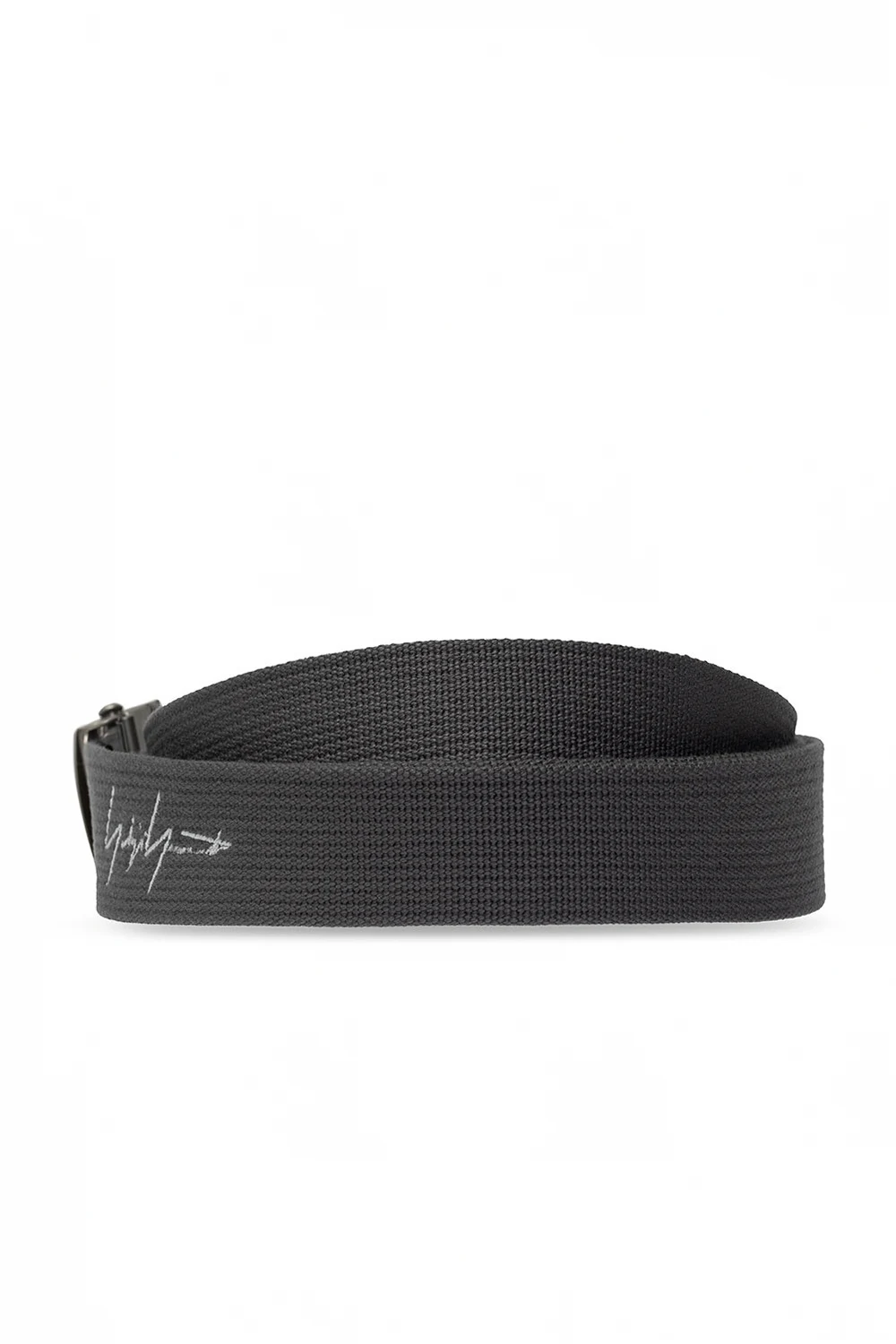 Grey belt from Yohji Yamamoto. Embroidered with the brand's logo in white, this item features silver-tone metal hardware.