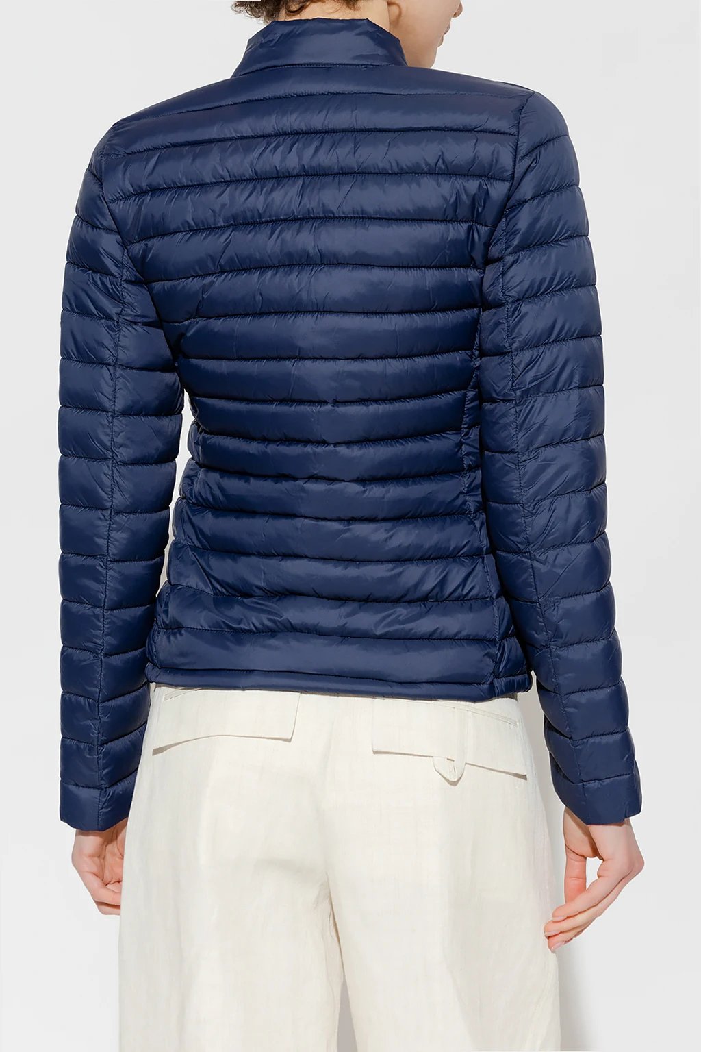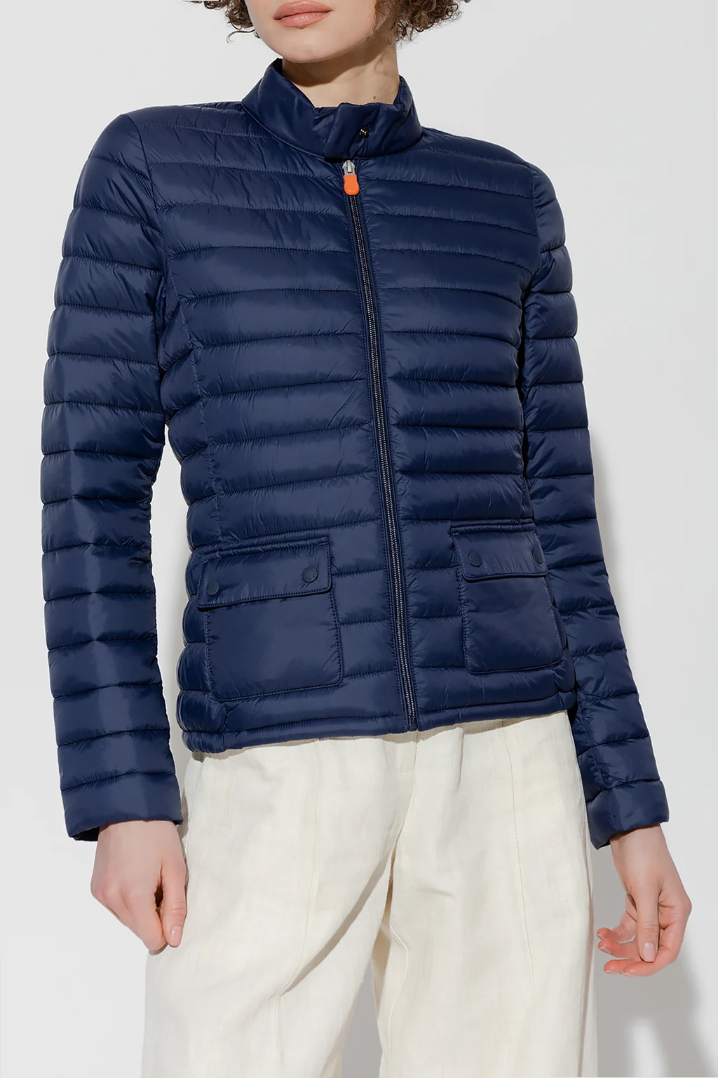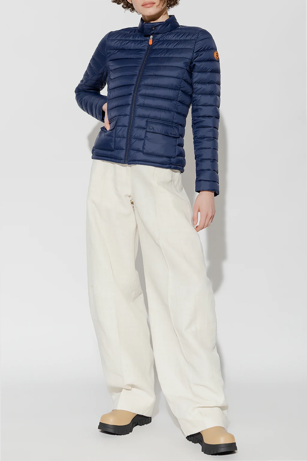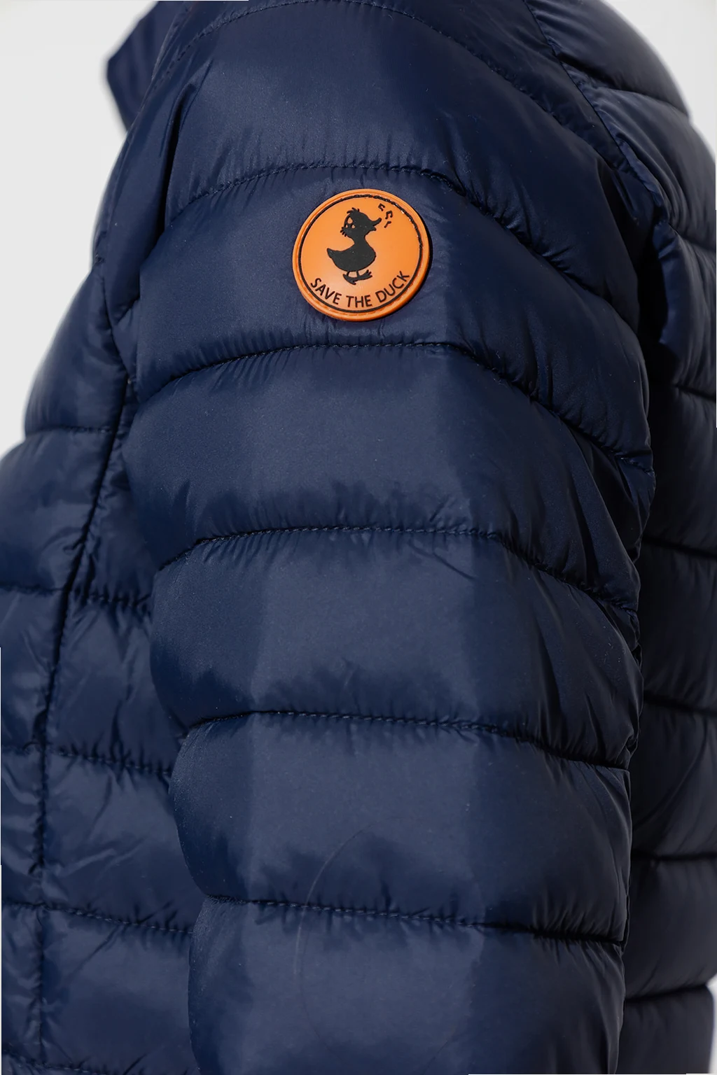 Navy blue quilted jacket from Save The Duck. Emblazoned with an orange and black logo patch, this style features a zip fastening, long sleeves and two flapped pockets.