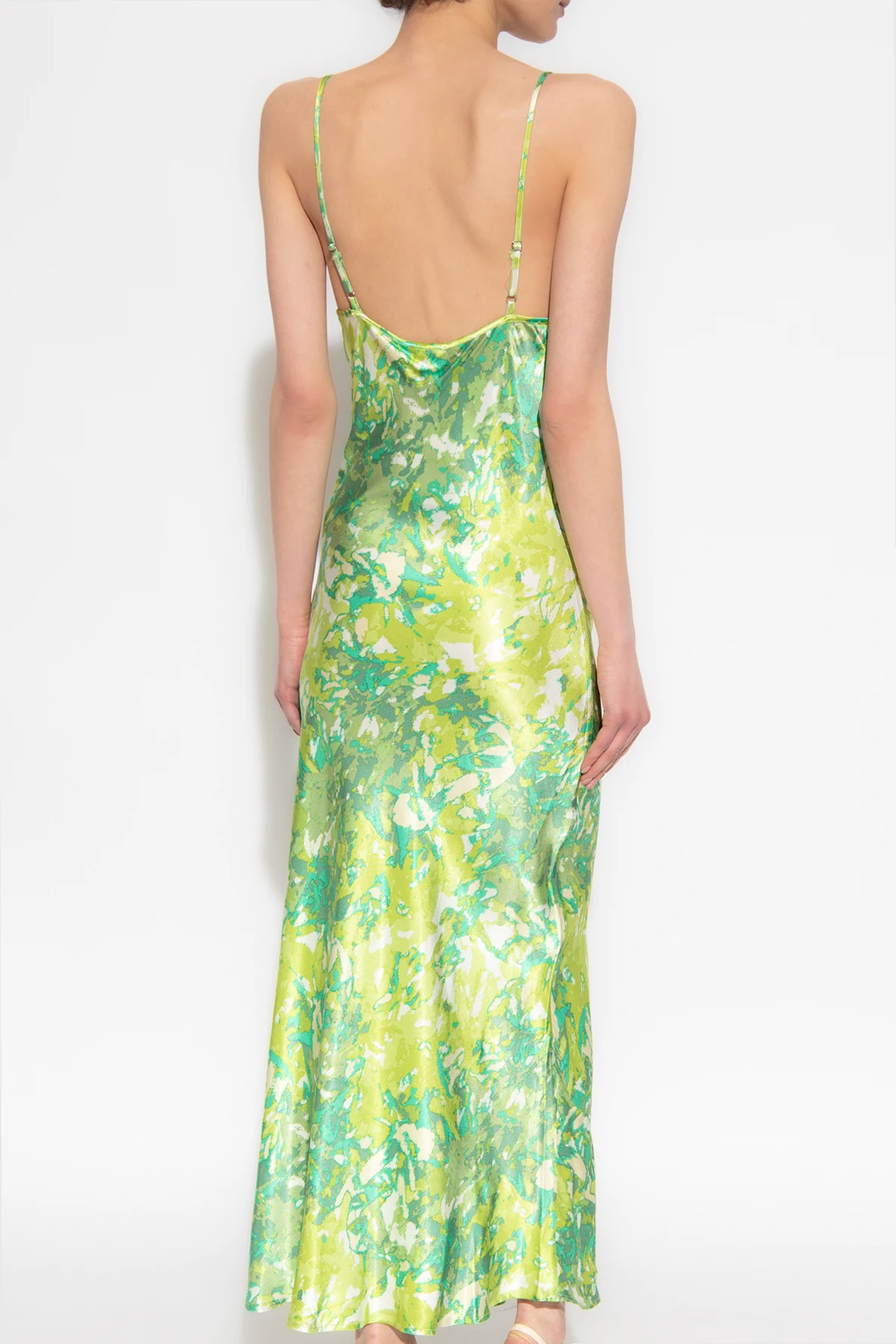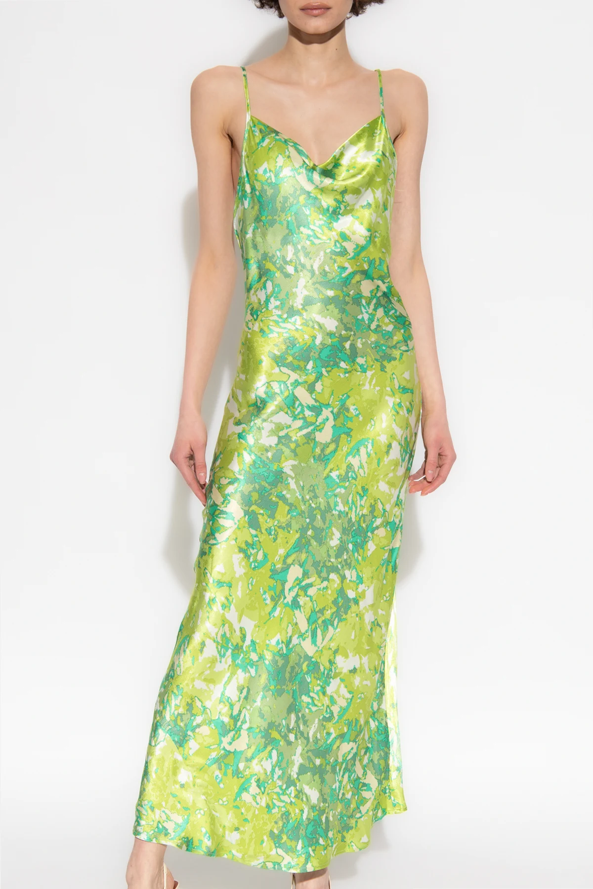 Green ‘FuriaGZ’ satin dress with adjustable shoulder straps from Gestuz. Crafted in part from LENZING™ECOVERO™, this style features a form-fitting silhouette with a colourful graphic pattern and a cowl neckline.