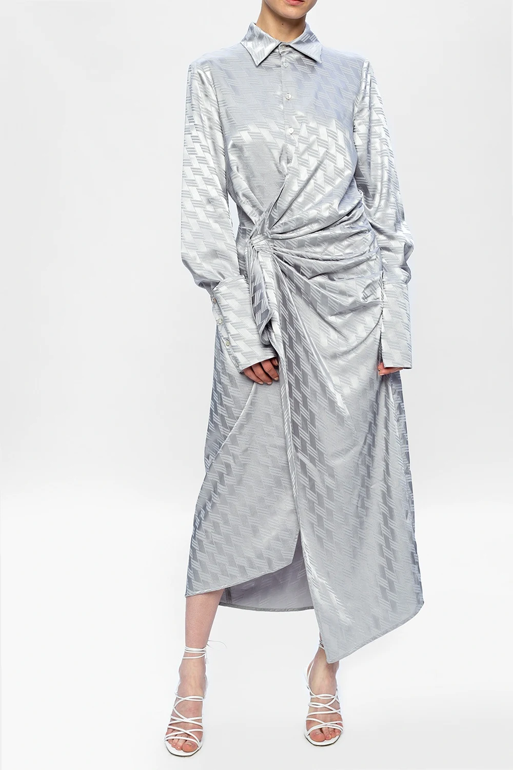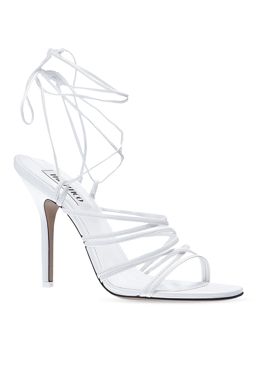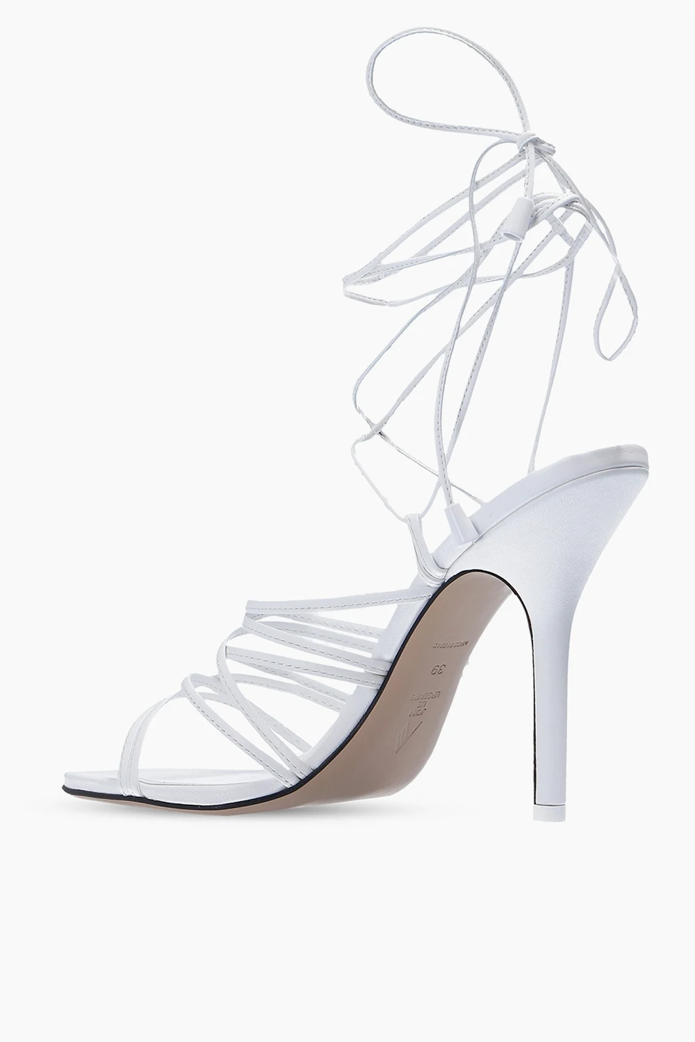 White ‘Fiona’ heeled sandals from The Attico. Crafted from leather, this design features tie fastening at the ankle and a beige leather sole.
