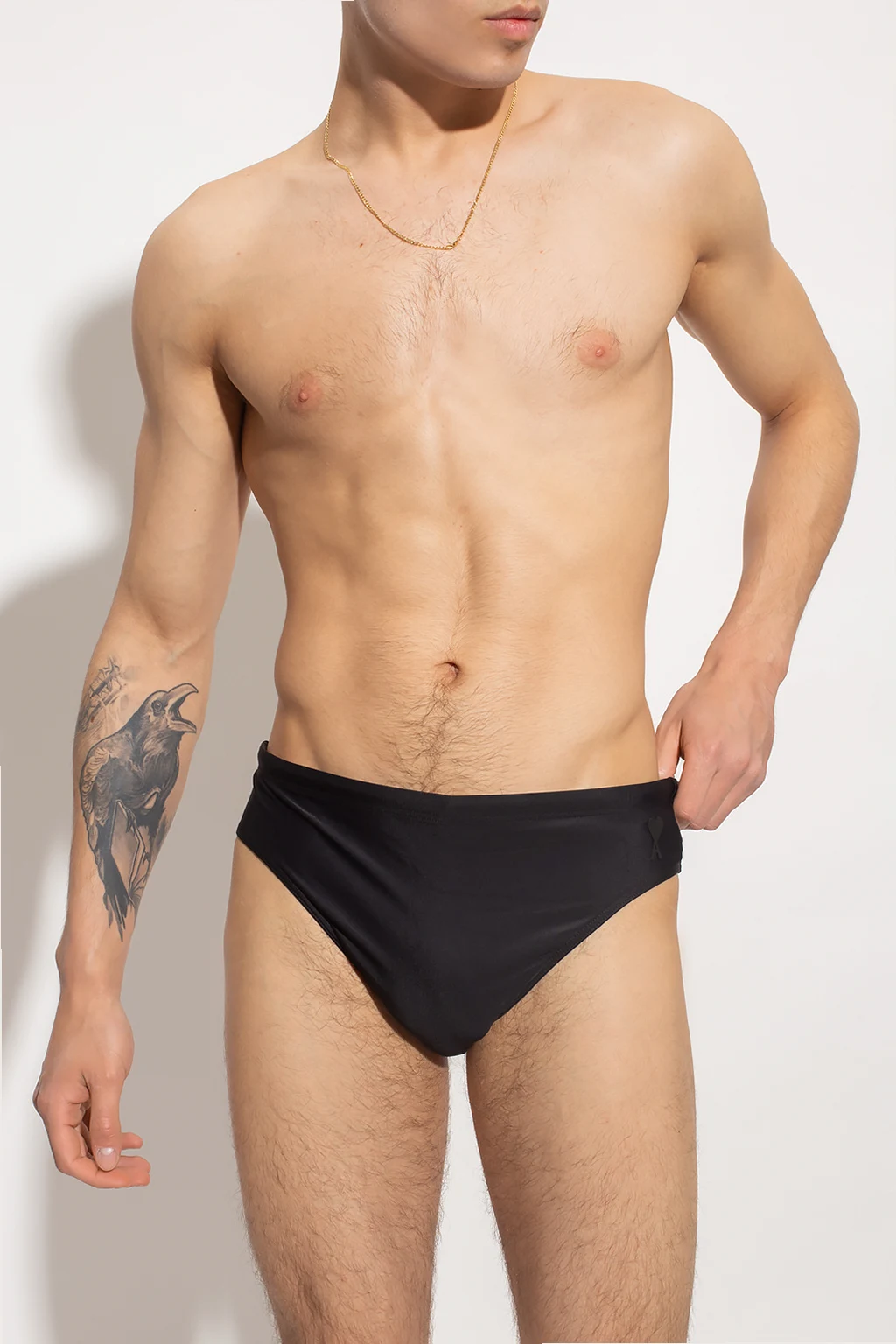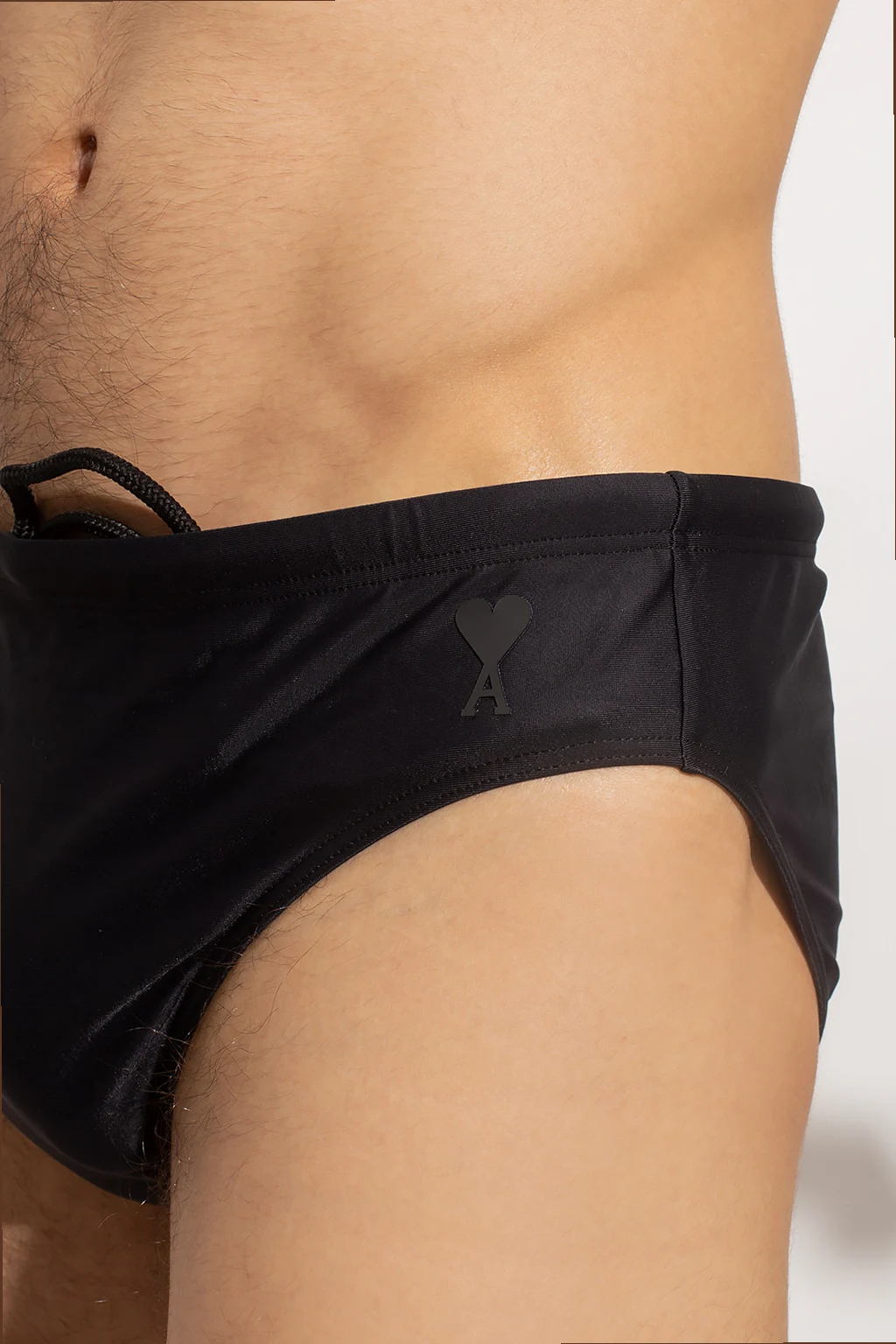 Black swim shorts from Ami Alexandre Mattiussi. This pair features an elastic waistband with drawstrings and raised ‘Ami de Coeur’ logo.