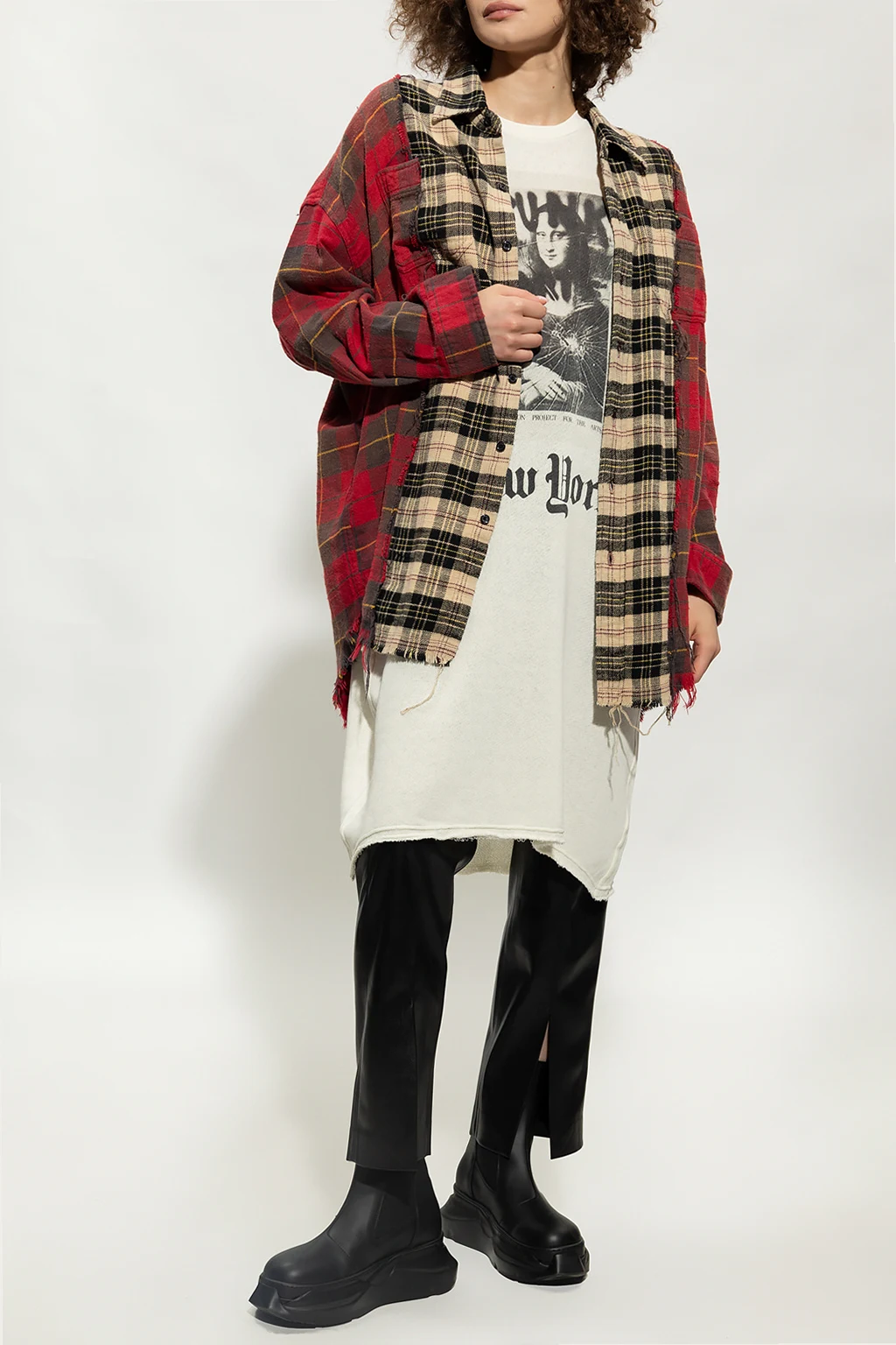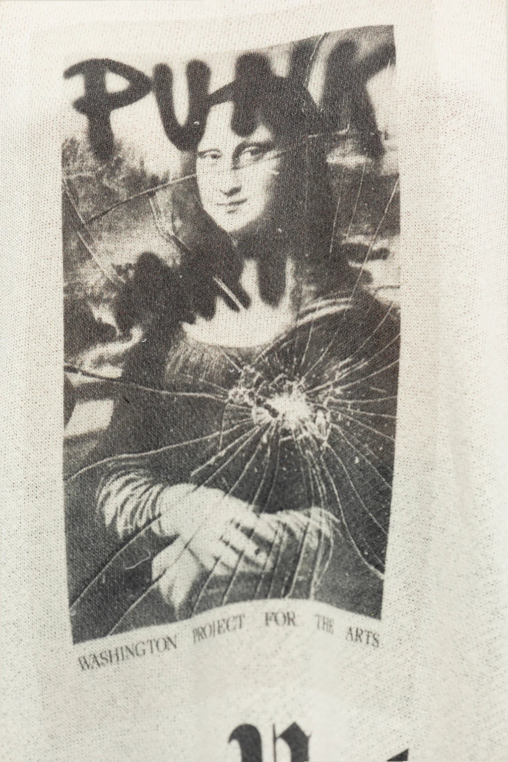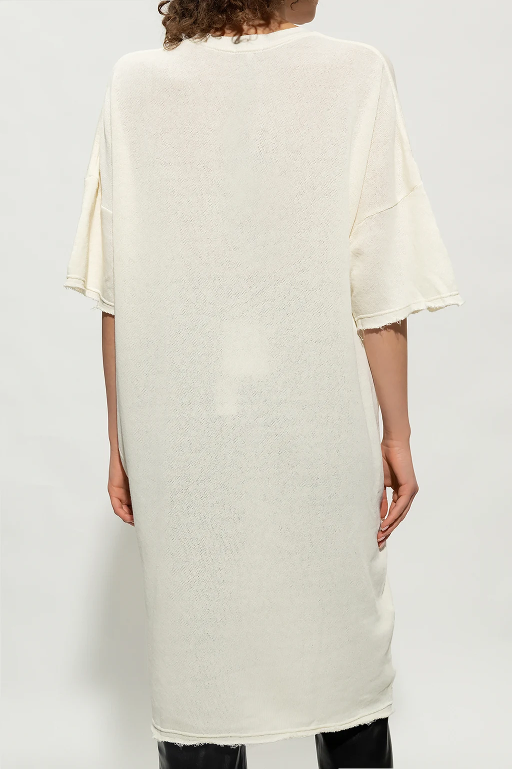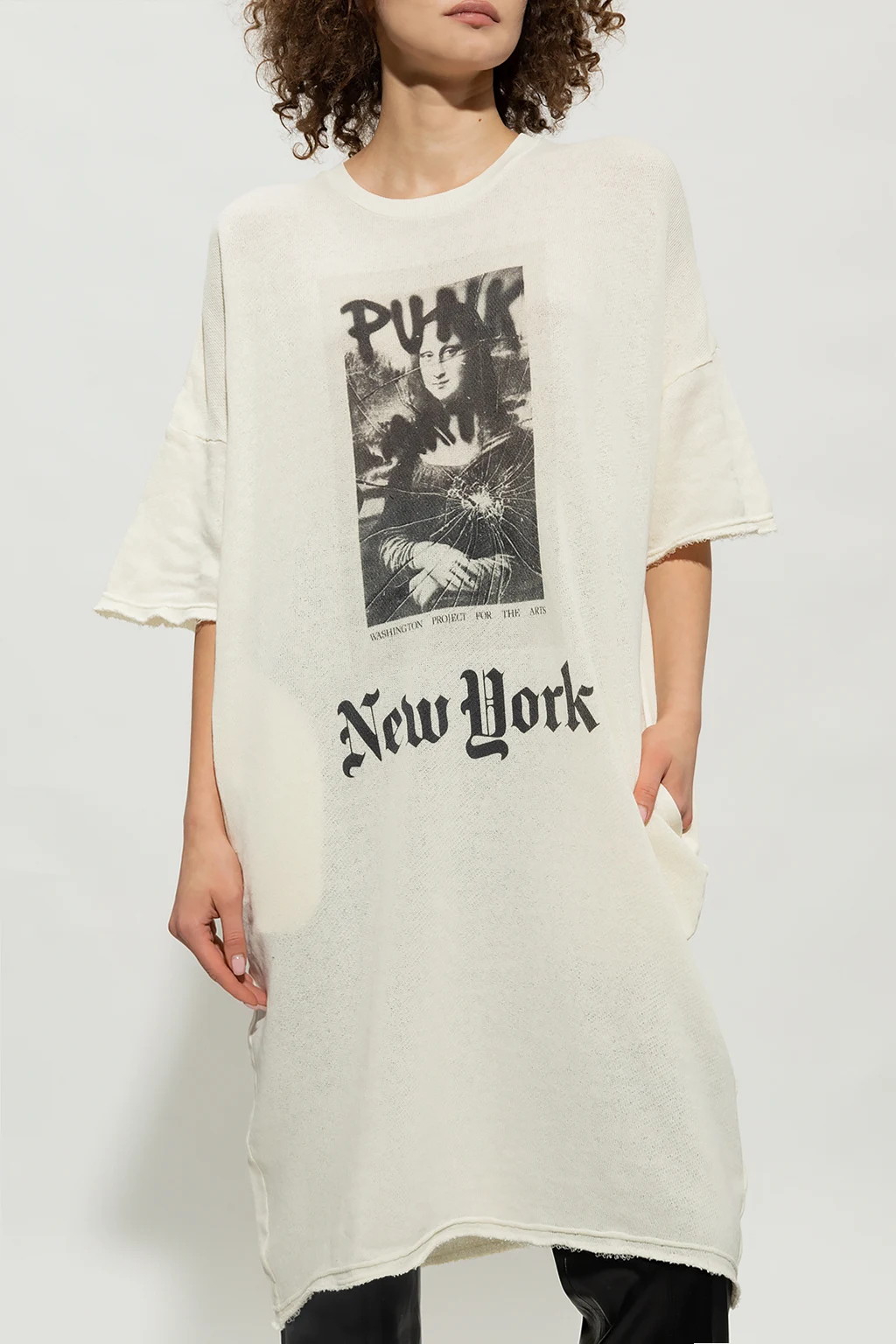 Cream dress from R13. Crafted from cotton with an oversize fit, this style showcases a graphic print with Leonardo Da Vinci's ‘Mona Lisa’ painting on the front, an elasticated collar, dropped shoulders, short sleeves, two slip pockets and a vintage effect throughout.
