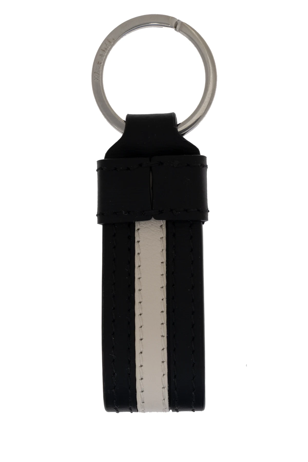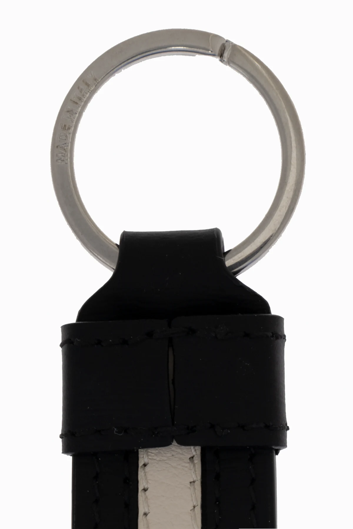 Das Design dieses einzigartigen Accessoires zeichnet sich durch Einfachheit gepaart mit Raffinesse aus. Der Hauptteil des Anhängers besteht aus einem Lederriemen, bereichert durch einen metallischen Ring zum Tragen von Schlüsseln sowie einem zusätzlichen Metallelement, das dem Ganzen Charakter verleiht. Die zweifarbige, schwarz-cremefarbene Farbgebung zusammen mit dem subtilen Bally -Logo, geprägt auf dem Leder, erhöht den Prestige und die Einzigartigkeit des Produkts.