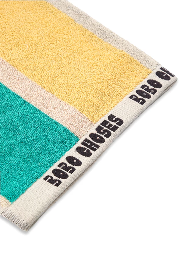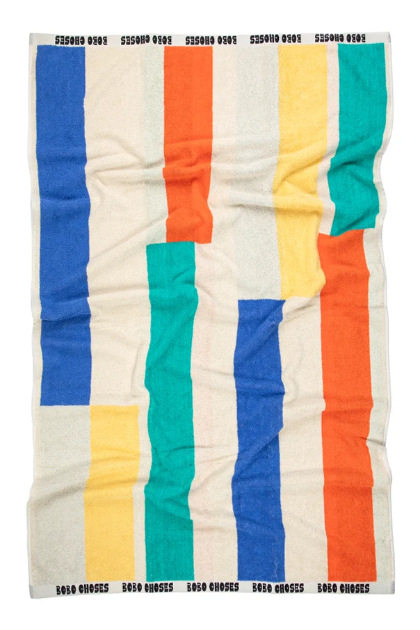 Gefertigt aus weichem, saugfähigem Frottier aus Baumwolle, bietet es unvergleichlichen Nutzungskomfort. Die präzise eingefassten Kanten zeugen von außergewöhnlicher Langlebigkeit und höchster Sorgfalt für feinste Details. Ein dekorativer, heller Streifen mit dem deutlichen schwarzen Aufdruck „BOBO CHOSES“ ist ein ausdrucksstarkes Kennzeichen dieser besonderen Kollektion der spanischen Marke, die auf Freude und Kreativität von Kindern Wert legt.