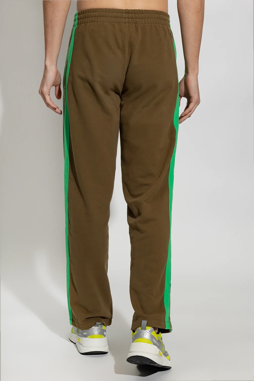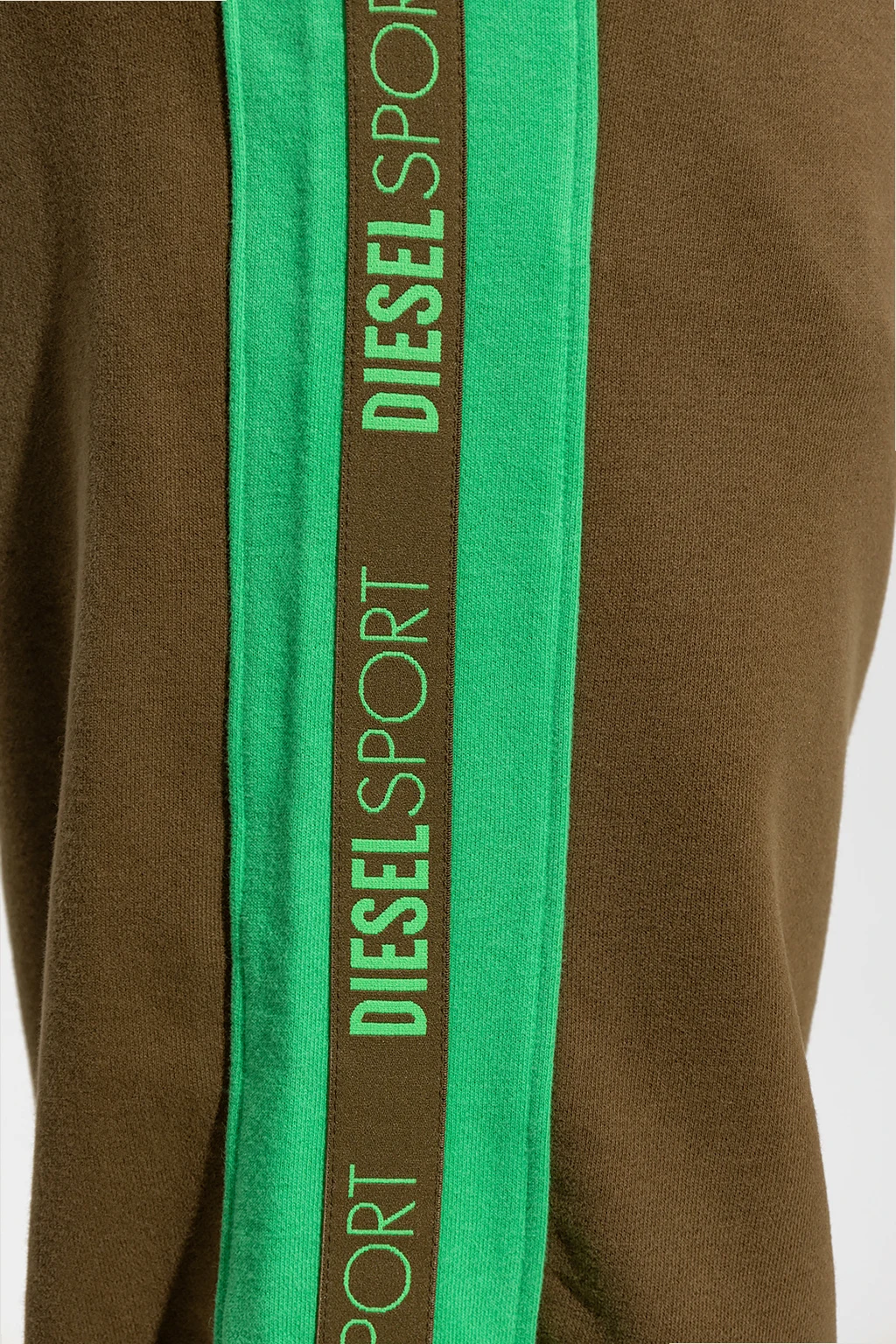 Green and dark brown 'AMSB-JAGER-HT33' sweatpants from Diesel, the ‘DIESEL SPORT’ collection. Enriched by branded panels down the sides, this pair falls with straight legs and features a drawstring waistband, two slip pockets and a white and black logo patch at the back.