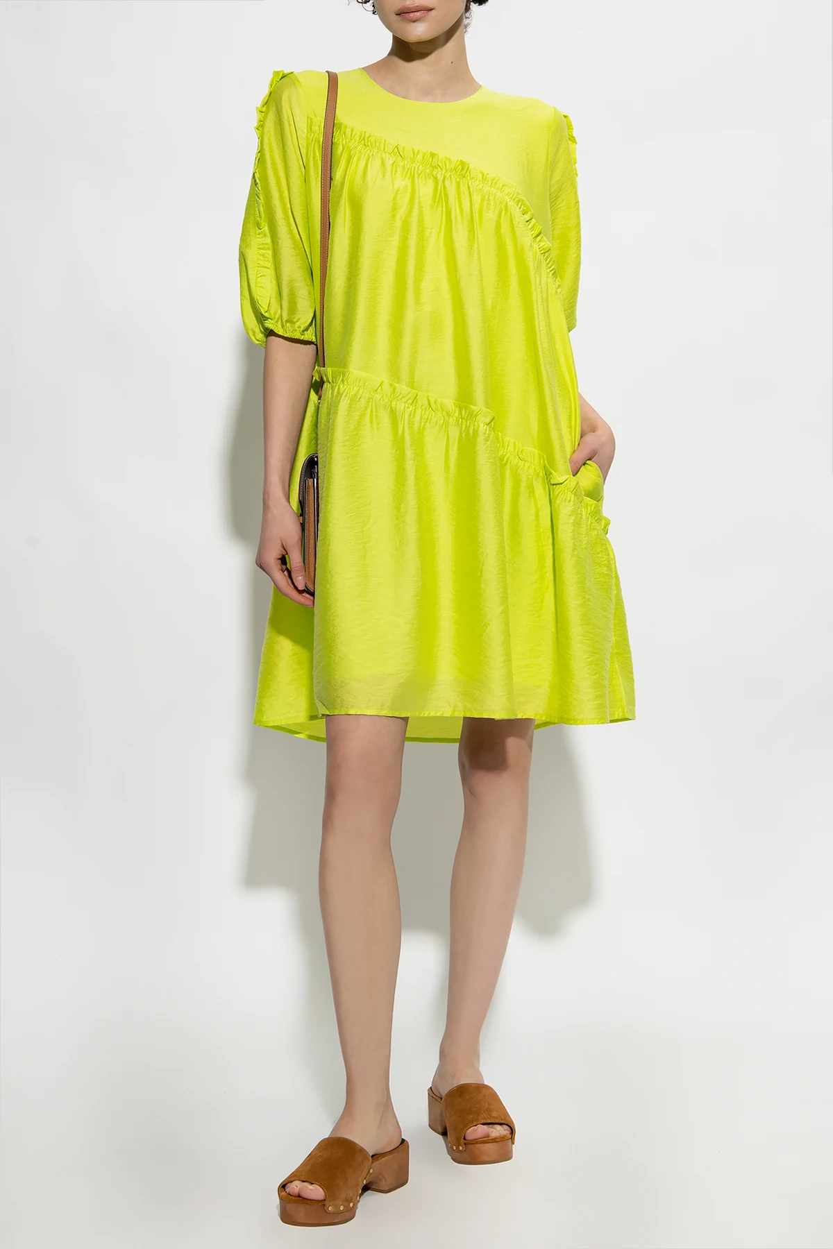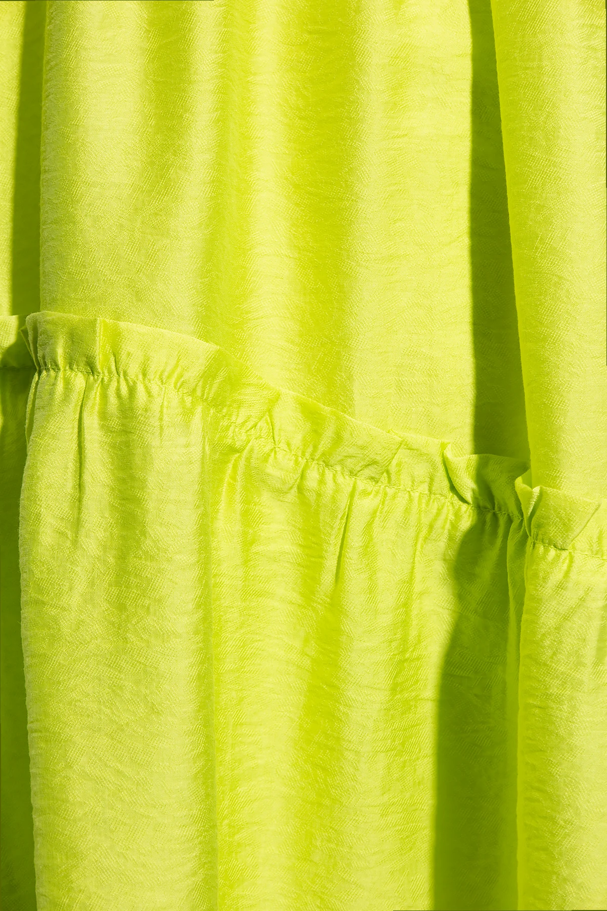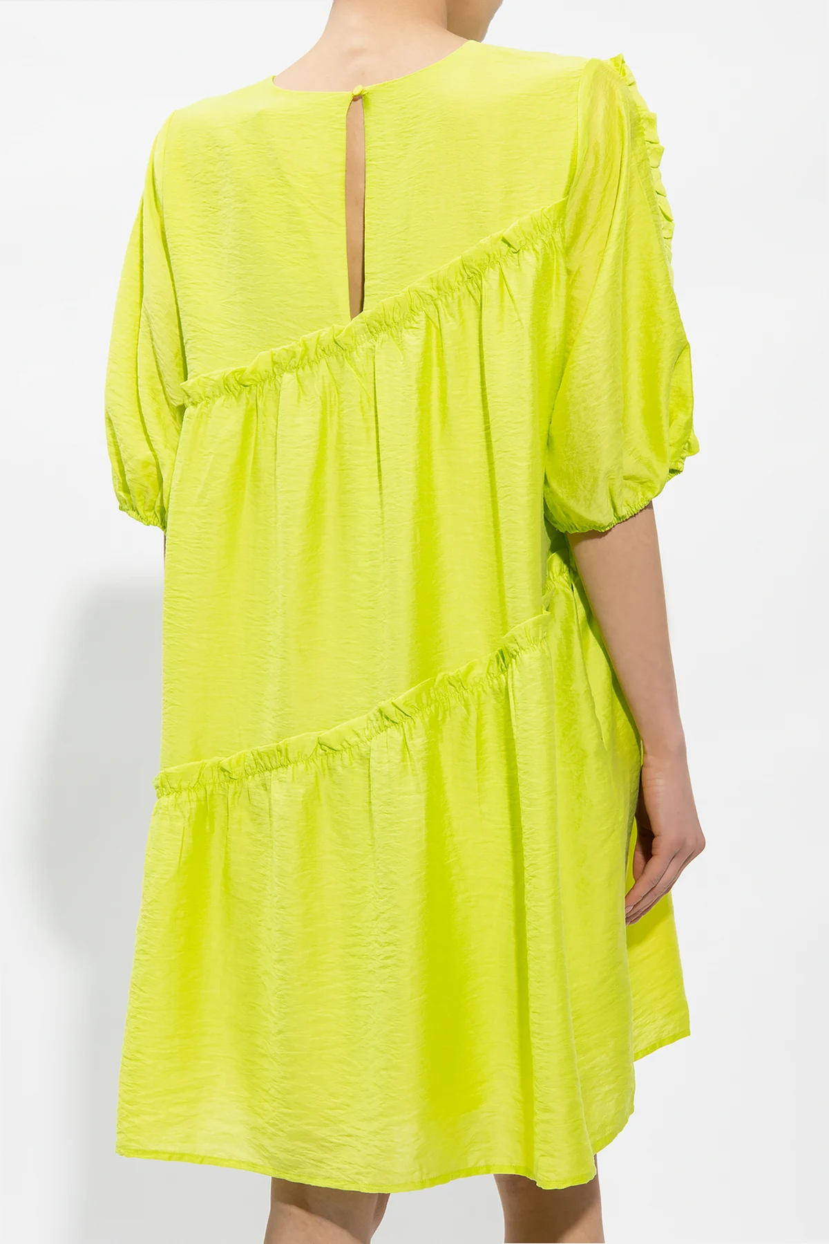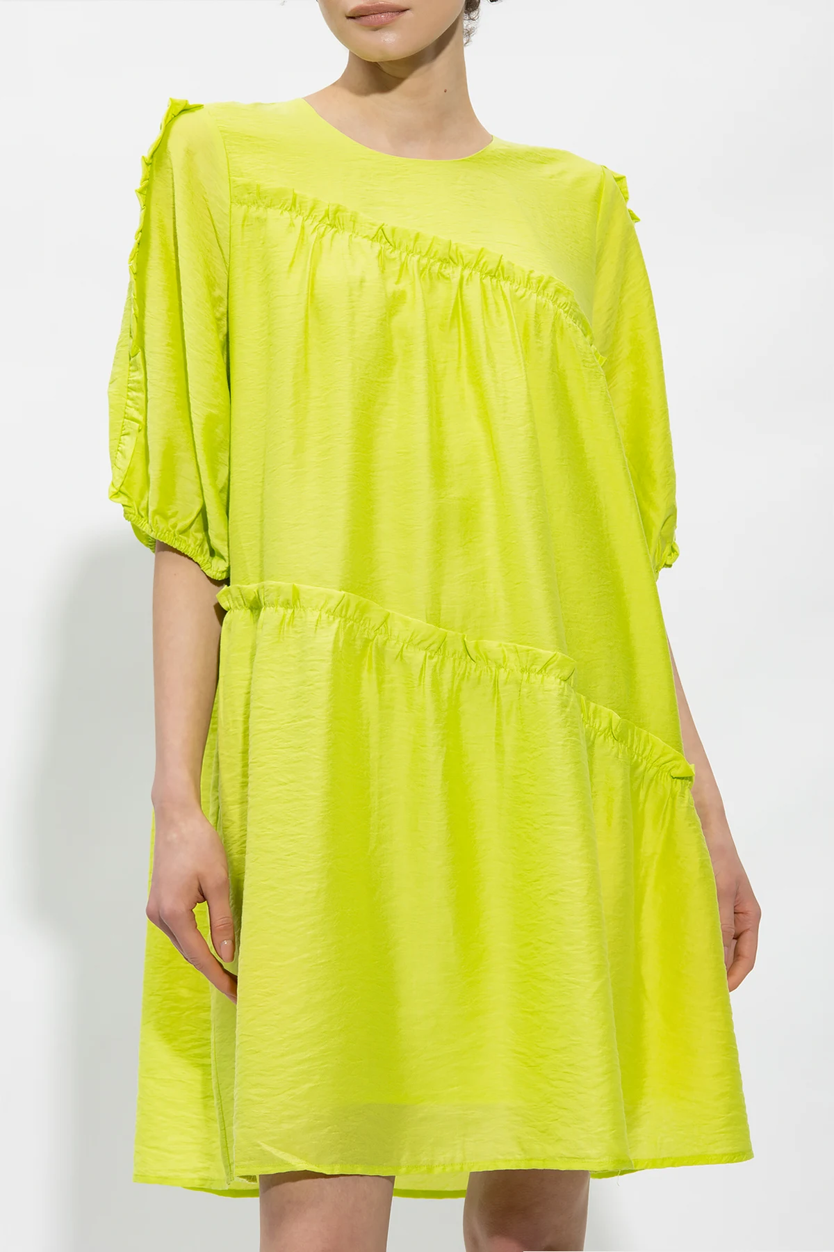 Light green ‘TheaGZ’ mini dress from Gestuz. Crafted from textured LENZING™TENCEL™ lyocell with a relaxed fit, this style features a back button closure, asymmetrical ruffle detailing, puff sleeves with elasticated cuffs and a flared hem with two slip pockets.