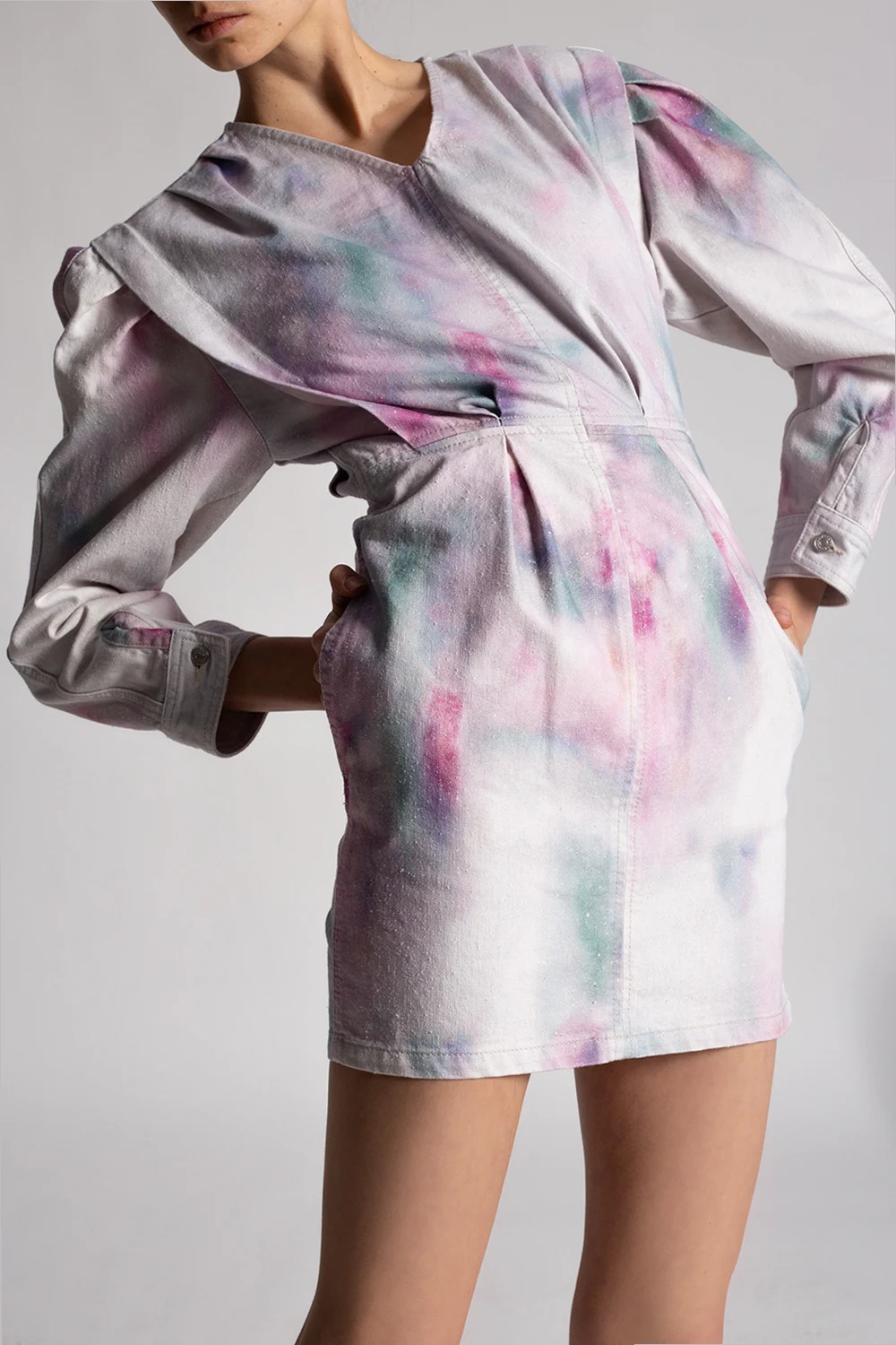 Multicolored denim dress from Isabel Marant Étoile. Fastened at the back with a zip, this flared design is complete with a printed pattern, V-neck and long sleeves with button cuffs.