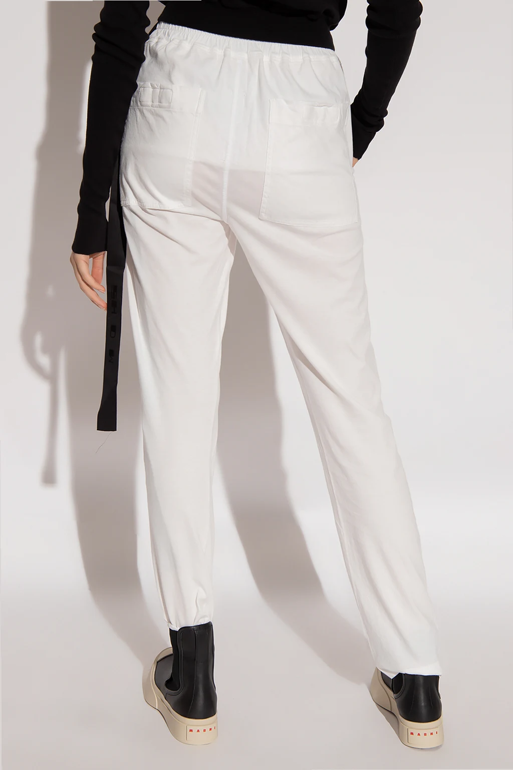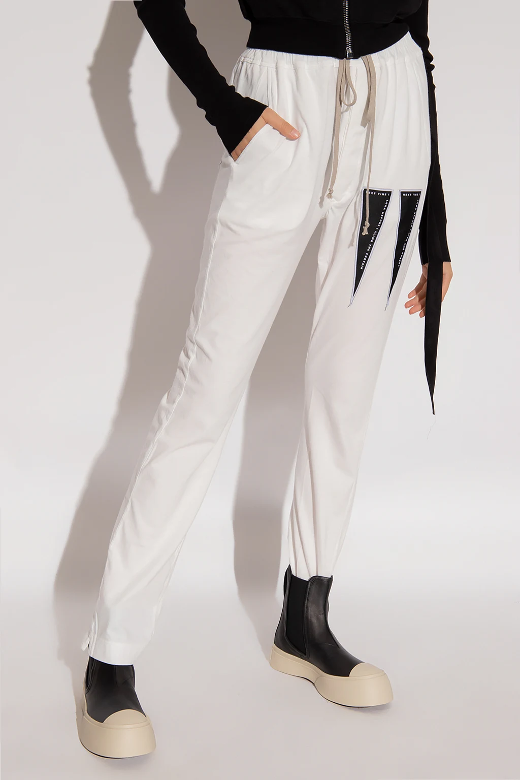 White sweatpants from Rick Owens DRKSHDW. Made of cotton, this pair features an elastic waistband with drawstrings, black patches, two front pockets, two velcro-fastened back pockets and slightly tapered legs.