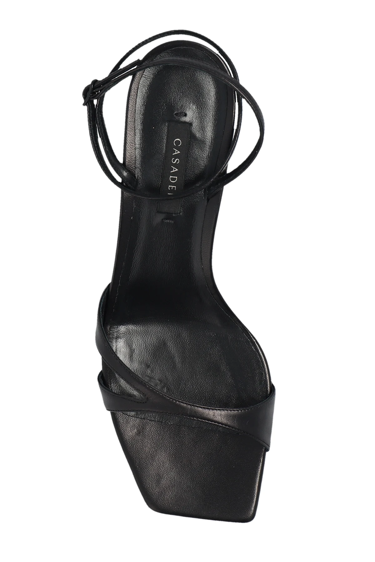 Black heeled sandals from Casadei. Made of leather, this pair features an adjustable buckled ankle strap, cut-out on the front, square toe and black leather sole.