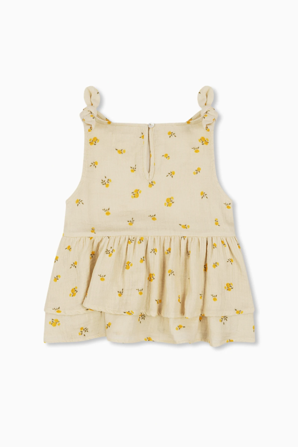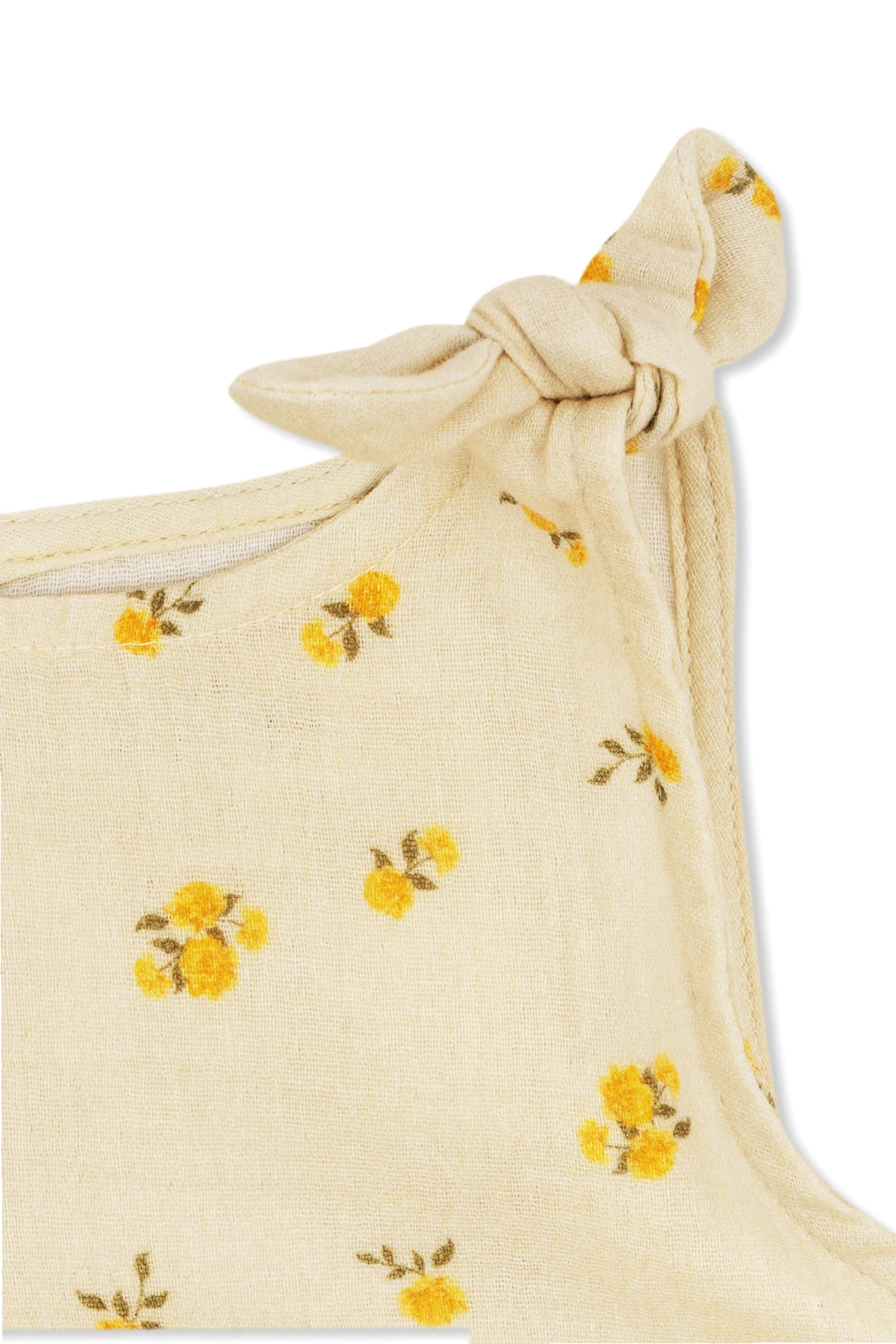 Details wie kleine Schleifen an den Trägern und eine subtile Verschlussart hinten mit einem kleinen Perlenknopf und einer Schlaufe unterstreichen die Einzigartigkeit des ‘Coco’ Tops. Ein rechteckiger Rückenausschnitt verleiht ihm Einfachheit, während der leicht geraffte untere Teil eine zarte Rüsche bildet, die dem Produkt Volumen verleiht.