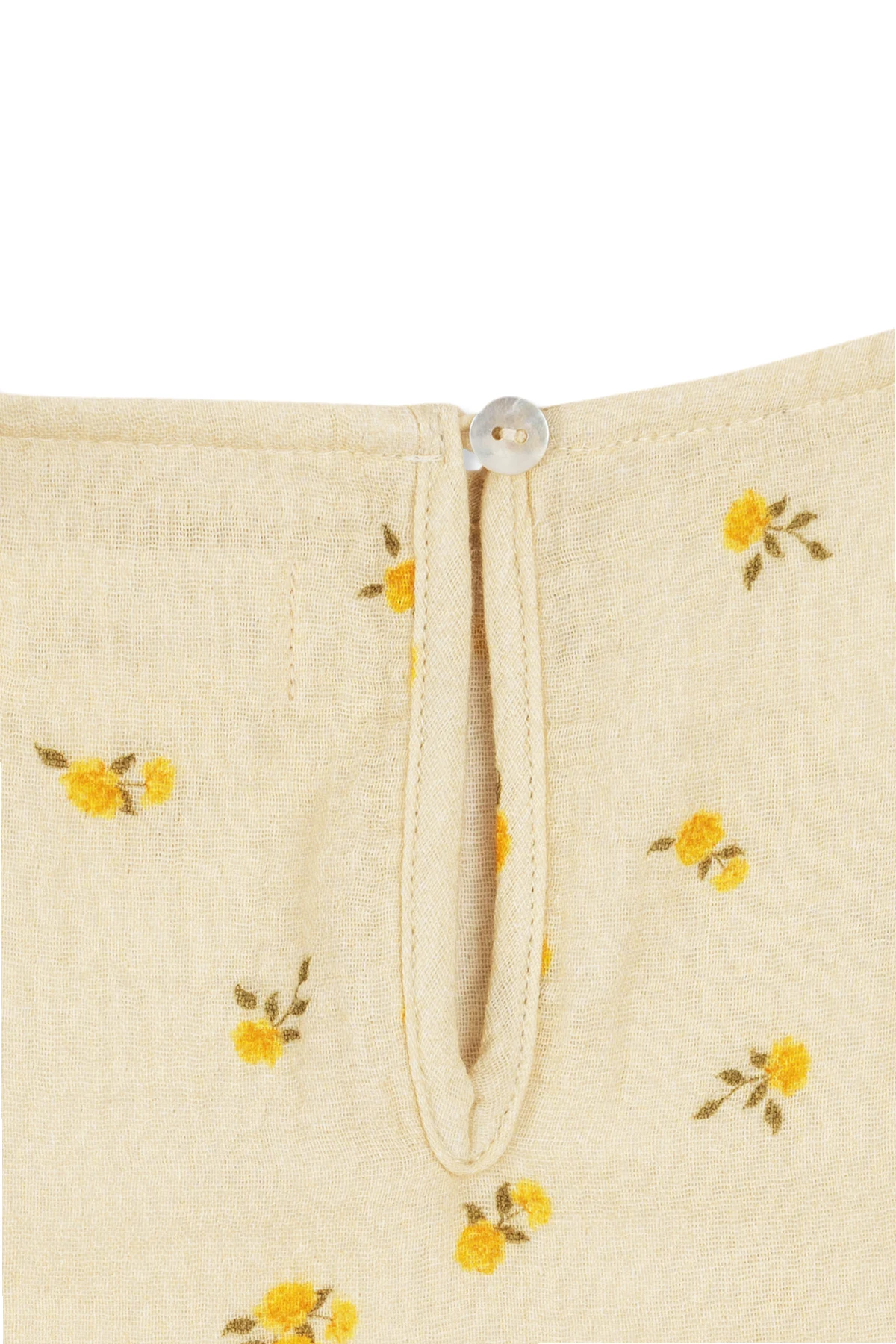 Das Produkt zeichnet sich durch einen lockeren, bequemen Schnitt mit einem ausgestellten unteren Teil aus, der ihm Leichtigkeit und eine ungezwungene Grazie verleiht. Es besteht aus hochwertiger 100% biologischer Baumwolle , die nicht nur Tragekomfort bietet, sondern auch haut- und umweltfreundlich ist. Vor dem Hintergrund des blassgelben Materials entfalten sich kleine Blumenmotive in Gelb- und Braunnuancen, die ein Muster voller Charme und Zartheit kreieren.