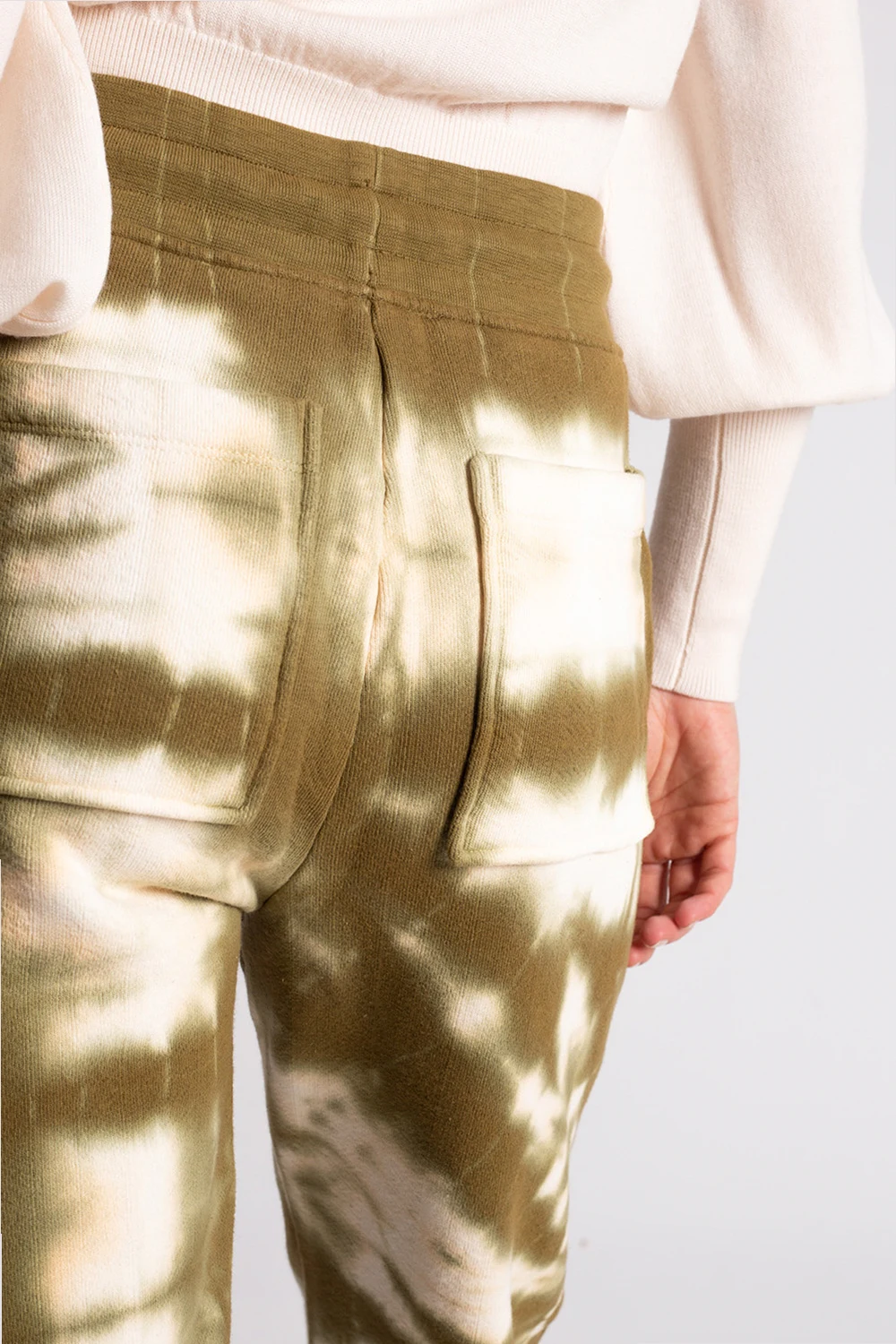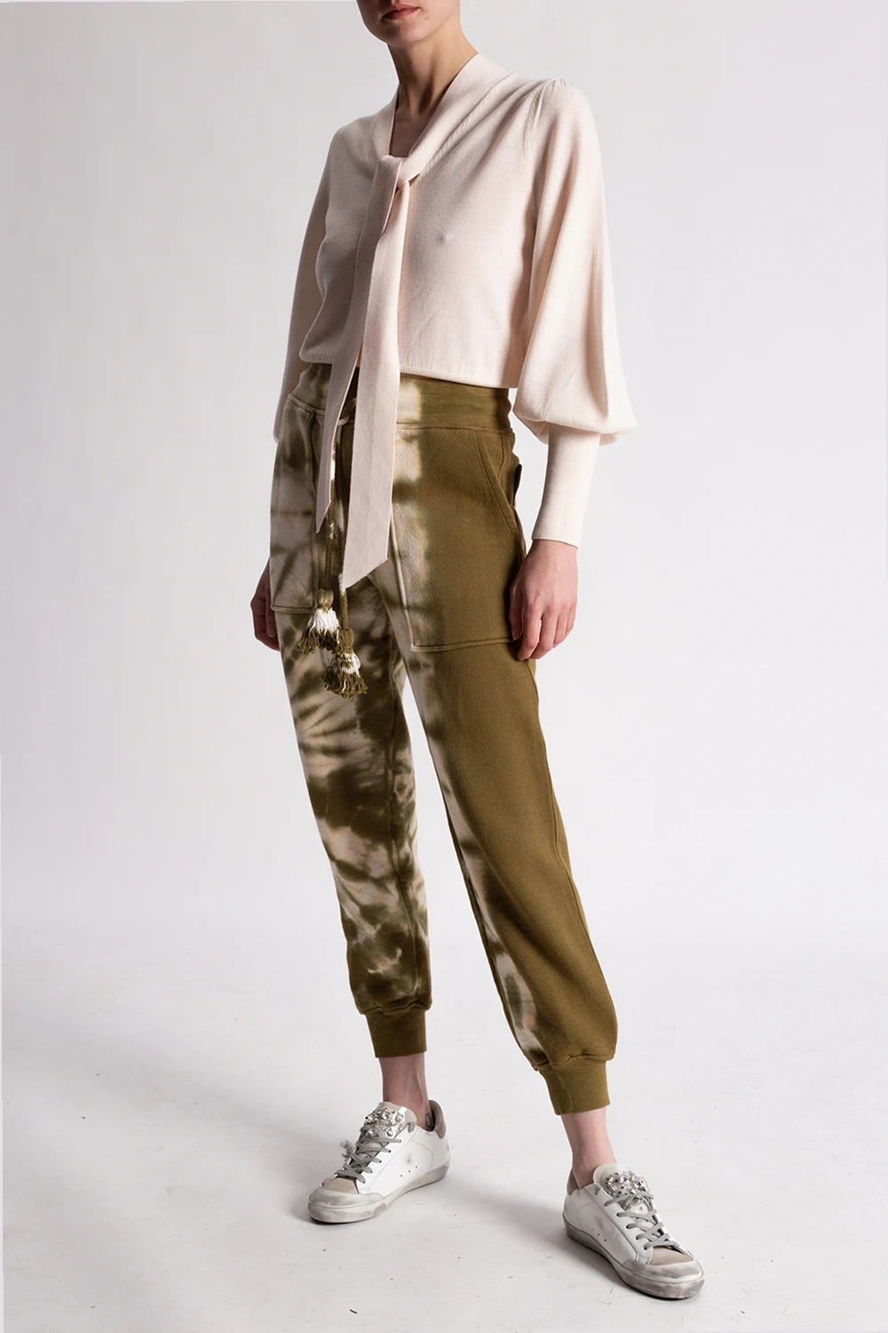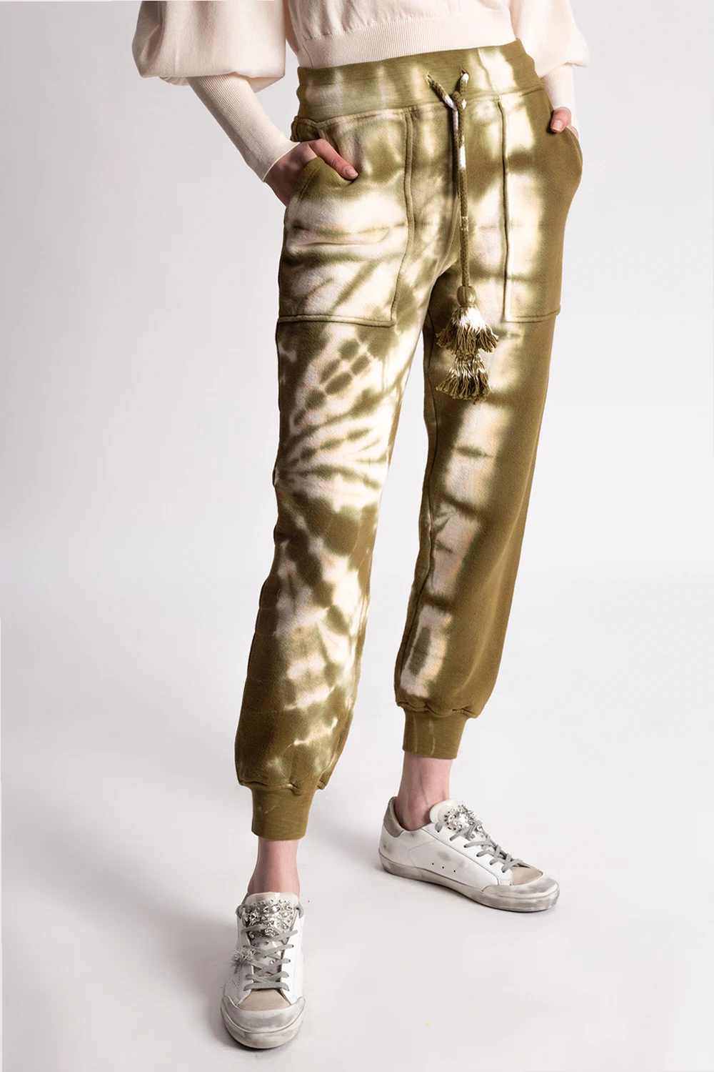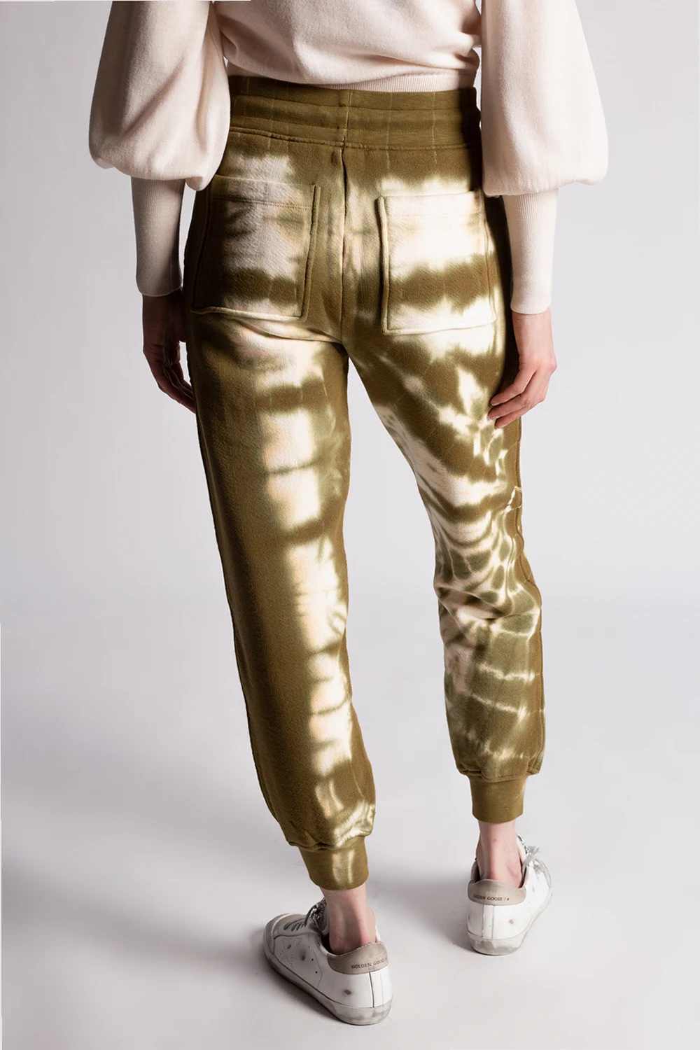 Green and cream ‘Charley’ sweatpants from Ulla Johnson. Embellished with a tie-dye treatment, this pair features an elasticated waistband with a drawstring fastening, four slip pockets and tapered legs with ribbed cuffs.