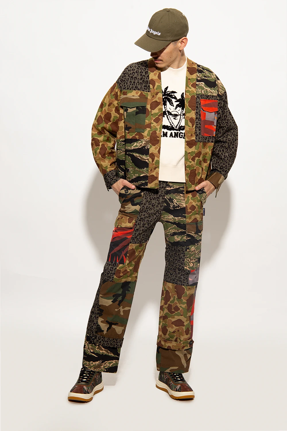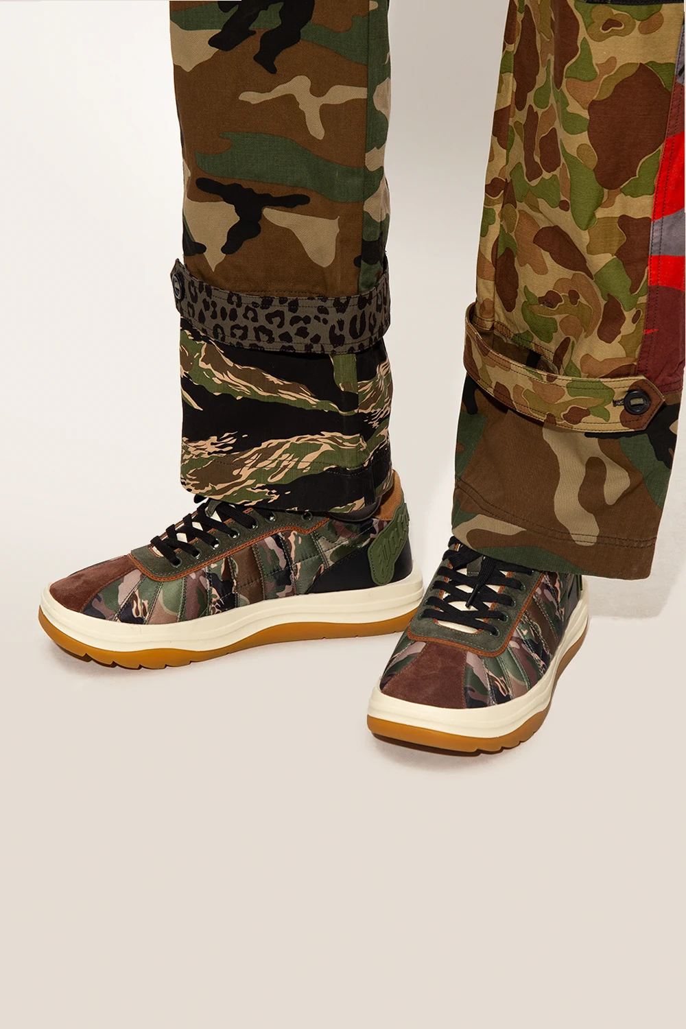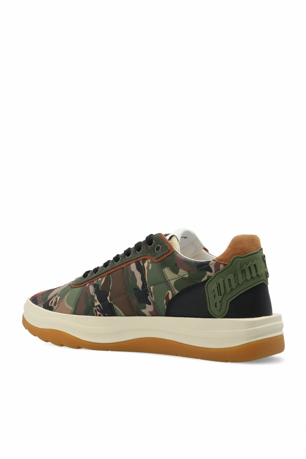 Brown, beige and green sneakers from Palm Angels. Crafted from leather and fabric, this lace-up pair features a camo pattern, logo appliqué and beige rubber sole.
