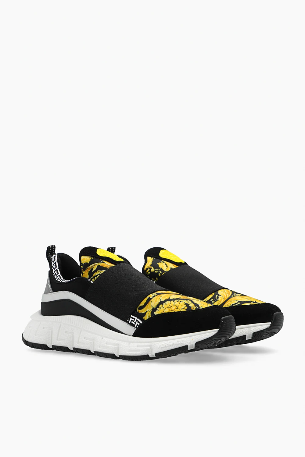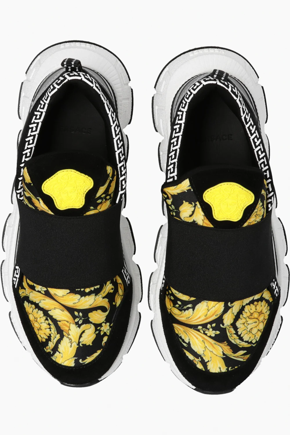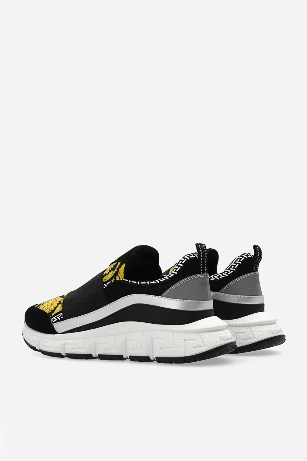 Black ‘Trigreca‘ sneakers from Versace Kids. Resting on a white rubber sole with the Greca pattern, this slip-on pair features an elastic strap, yellow and brown Barocco pattern, white La Greca pattern, rubber tongue patch with the iconic Medusa head in yellow, reflective elements and white rubber sole with the Greca pattern.