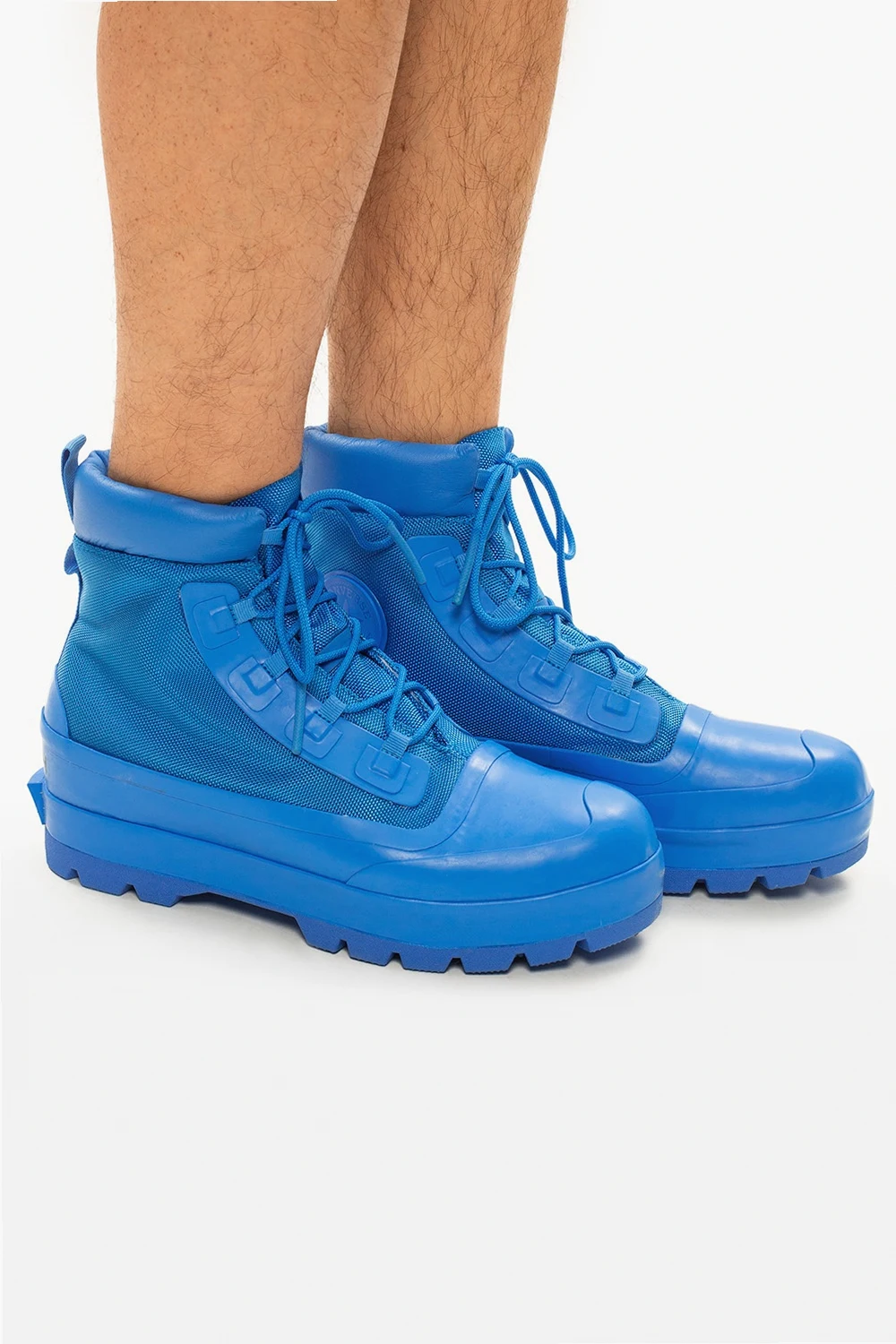 Blue ‘CTAS Duck Boot’ sneakers from Ambush x Converse. Boasting a high-top silhouette, this lace-up pair sits on a blue lug rubber sole and showcases black logo print at the heel and rubberised toe, mudguard and eyelets.