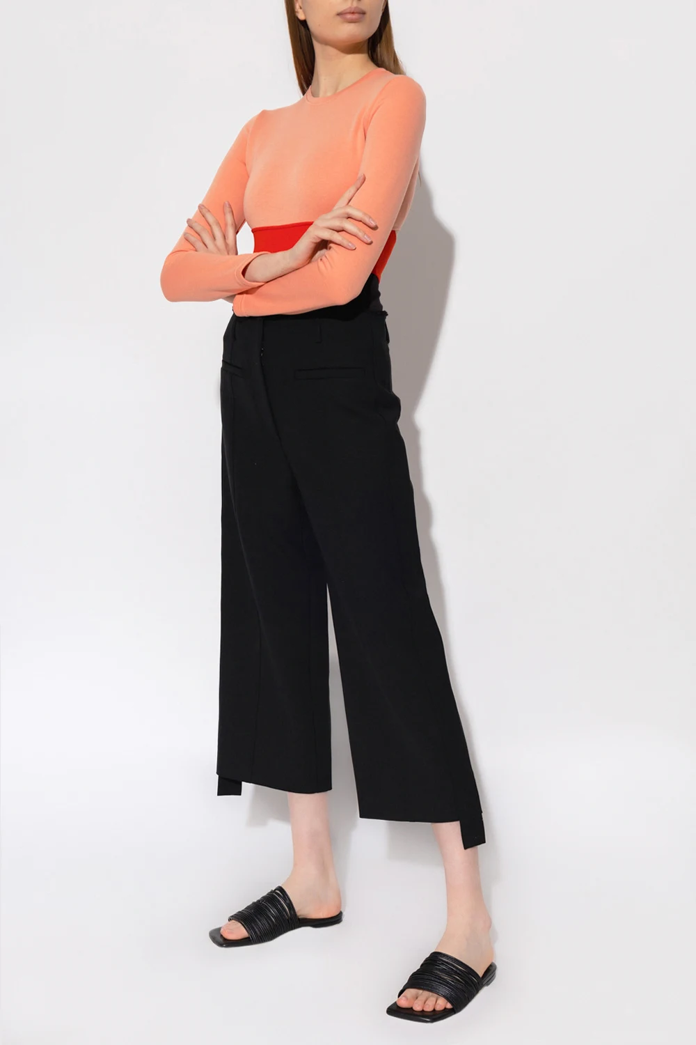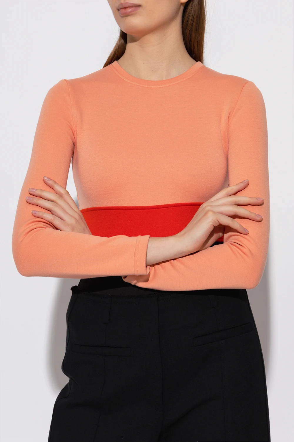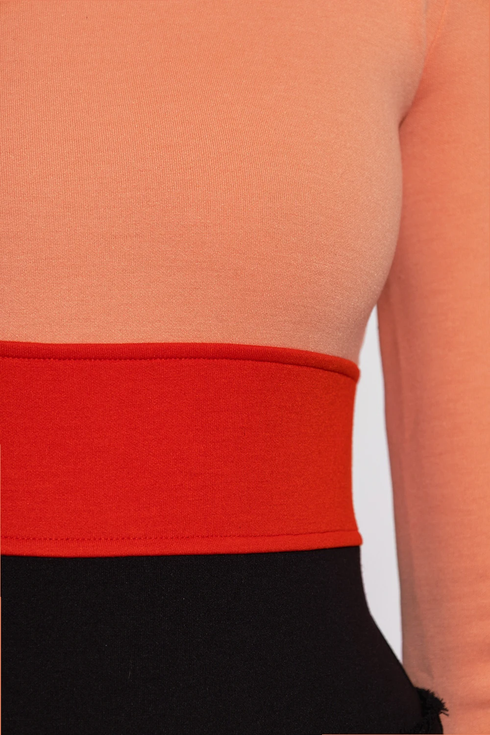 Light orange, red and black bodysuit from Proenza Schouler White Label. Distinguished by a denuded back, this style features a round neck, long sleeves and a triple snap closure at the crotch.