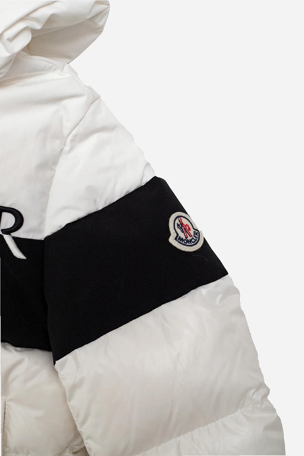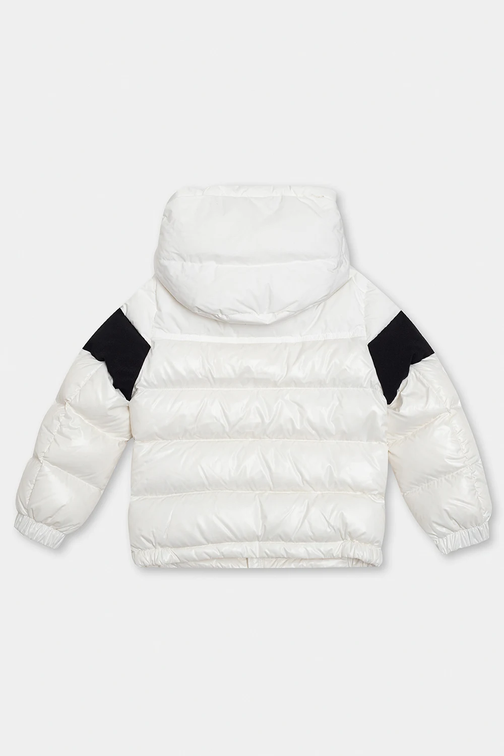 White and black hooded quilted down jacket from Moncler Kids. Fastened with a zip, this garment features a logo embroidery, sleeve patch with a logo, two snap-fastened pockets and ribbed trims at the hem and cuffs.
