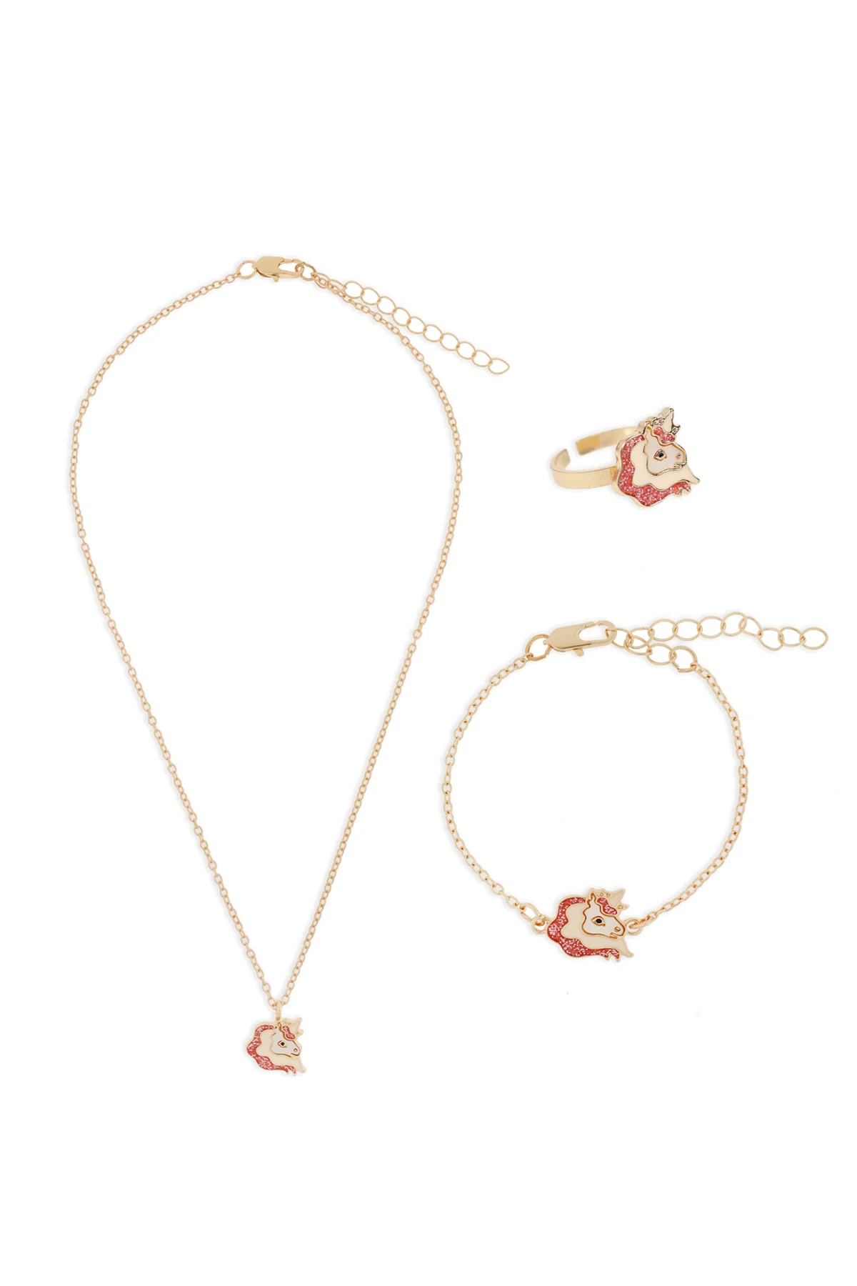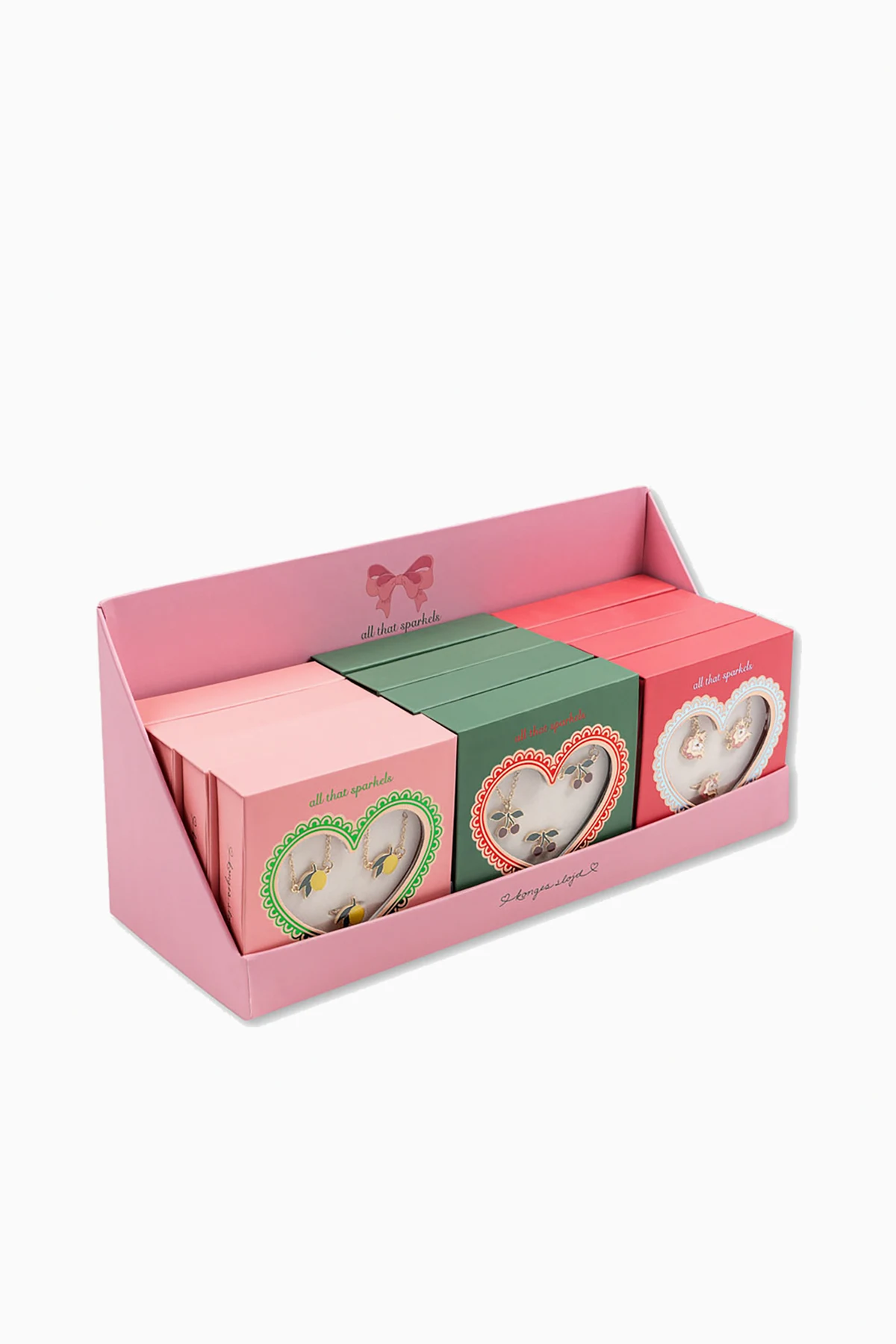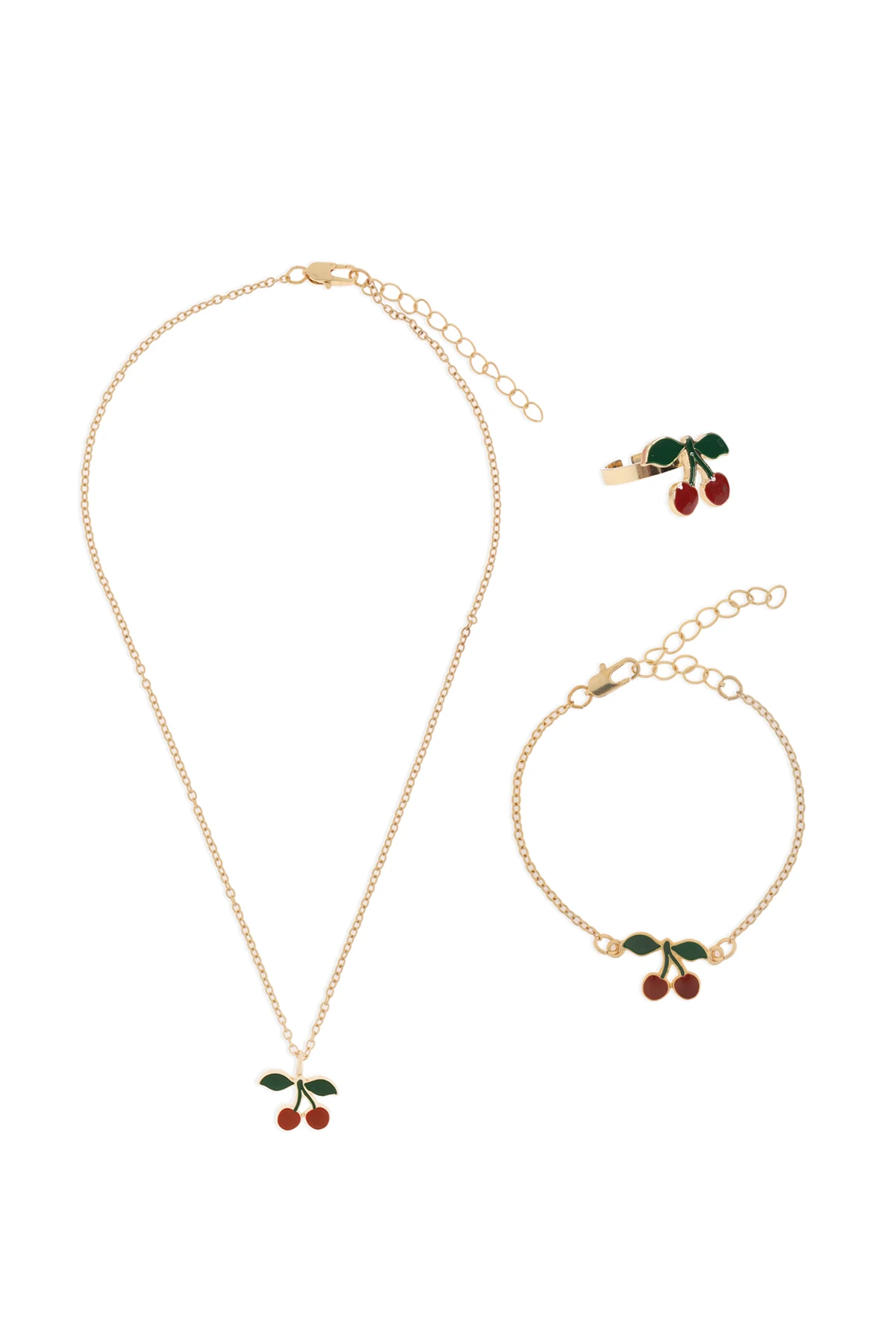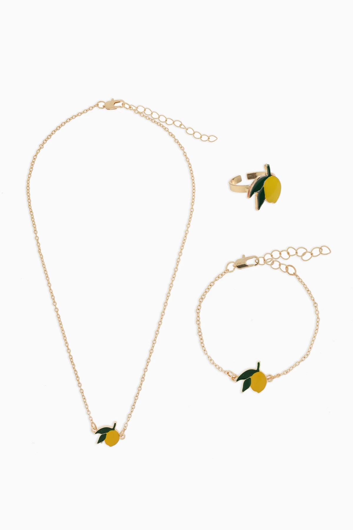 Wir präsentieren Ihnen raffinierte Kinderschmuck-Sets , entworfen von der renommierten dänischen Marke Konges Sløjd . Jedes Set enthält eine Halskette, ein Armband und einen Ring, die in drei einzigartigen Motiven erhältlich sind: Zitrone, Rose und Kirsche.