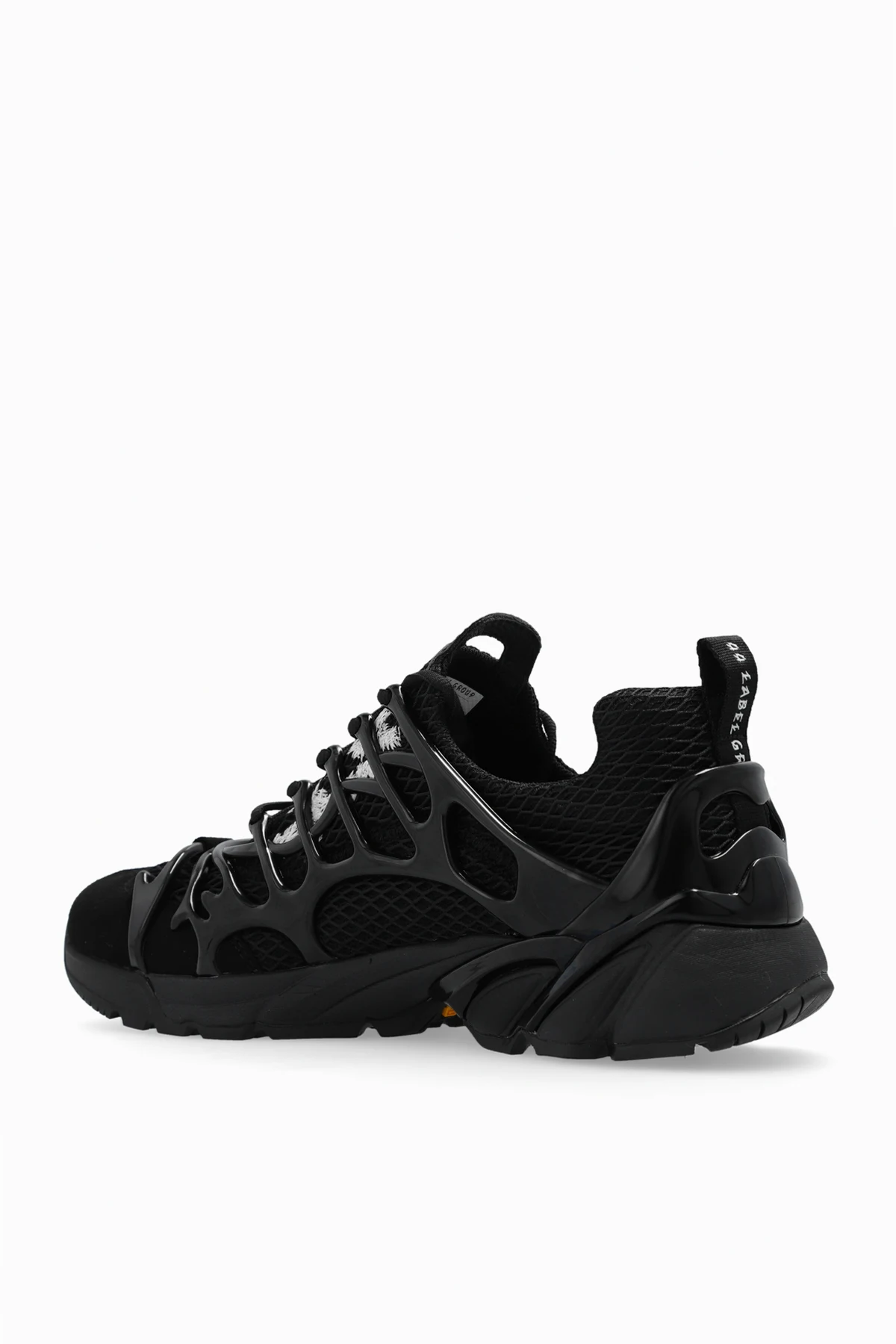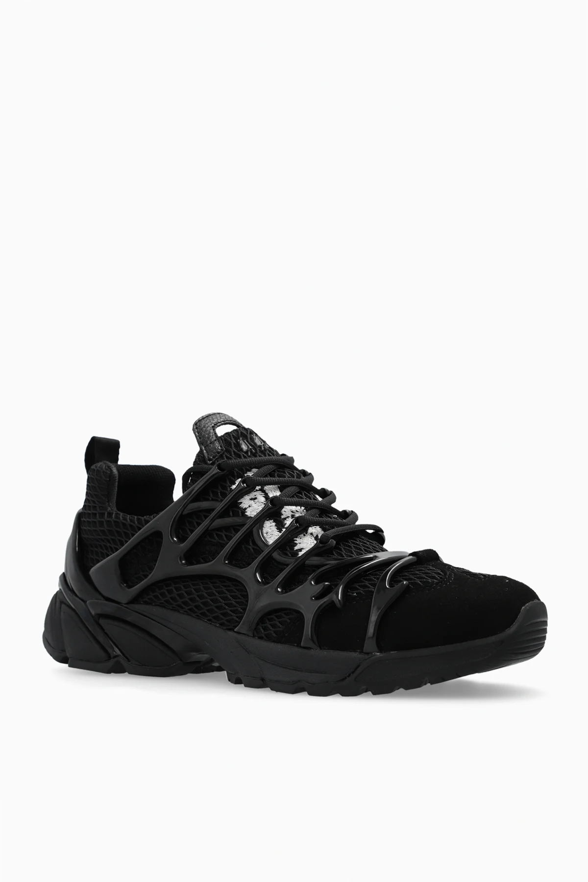 Black sneakers from 44 Label Group. Rendered in mesh with a slip-on silhouette, this lace-up model sits on a black rubber sole and features decorative rubber elements and white logo embroidery on the front.