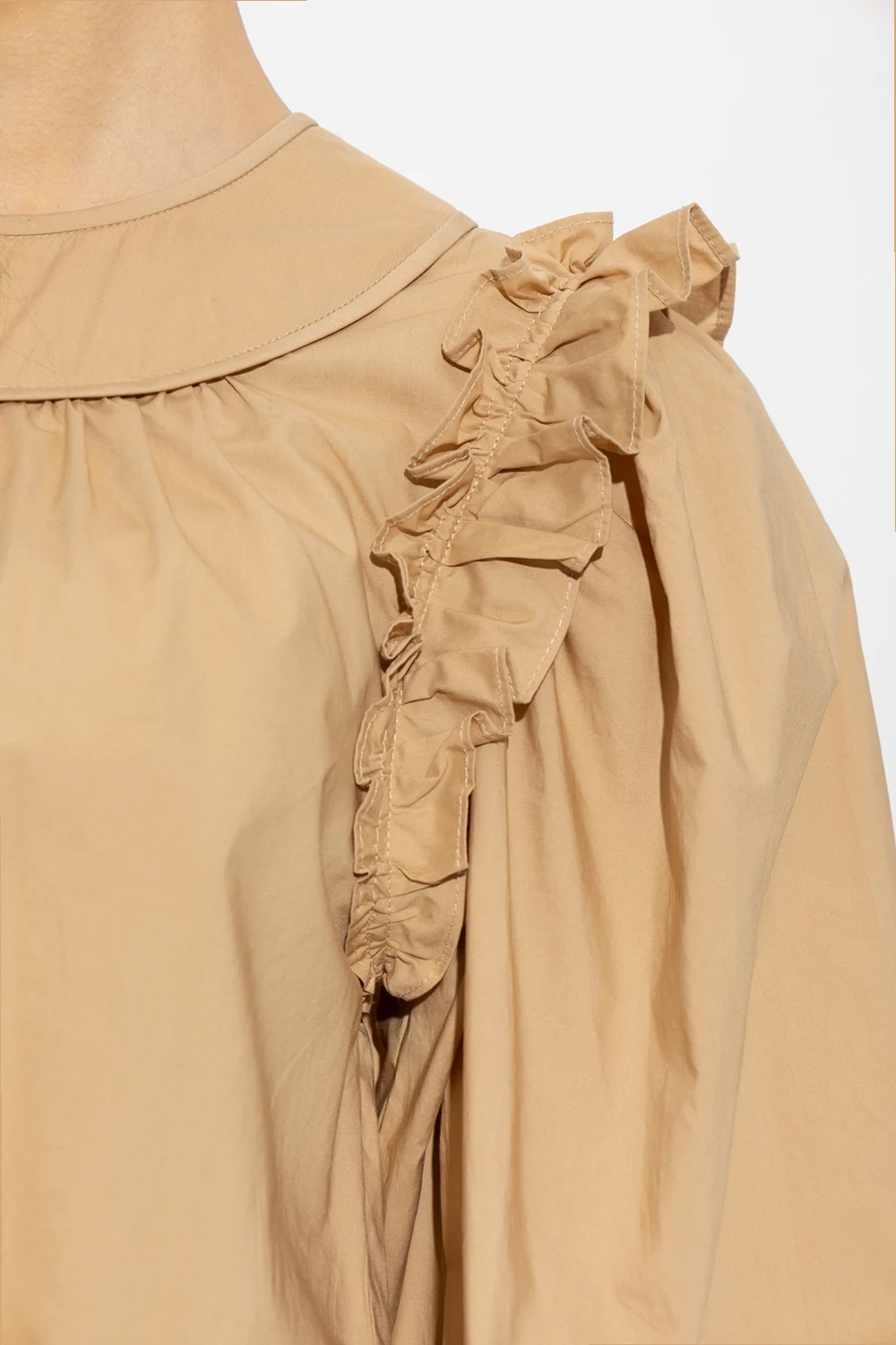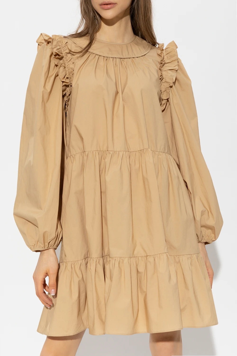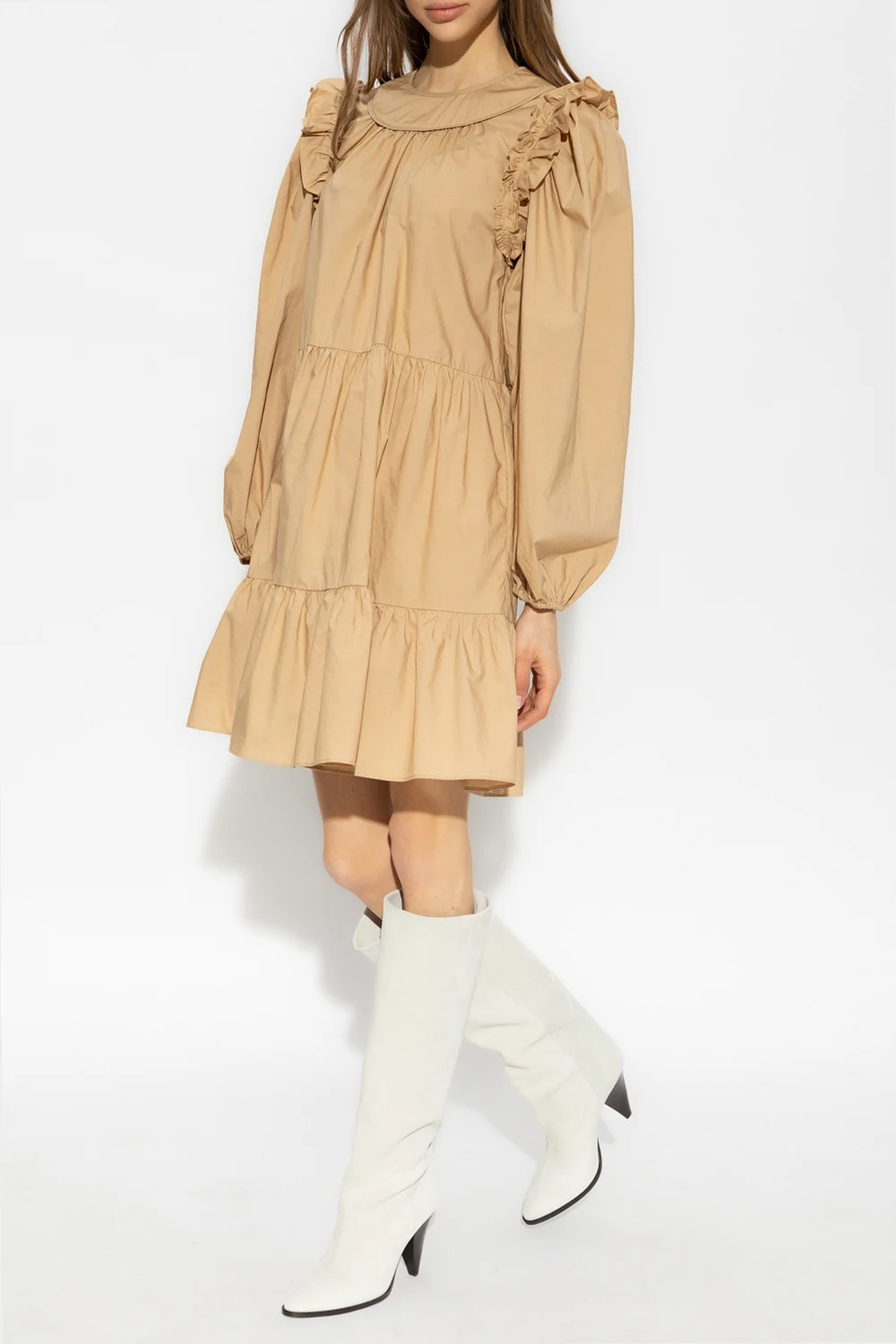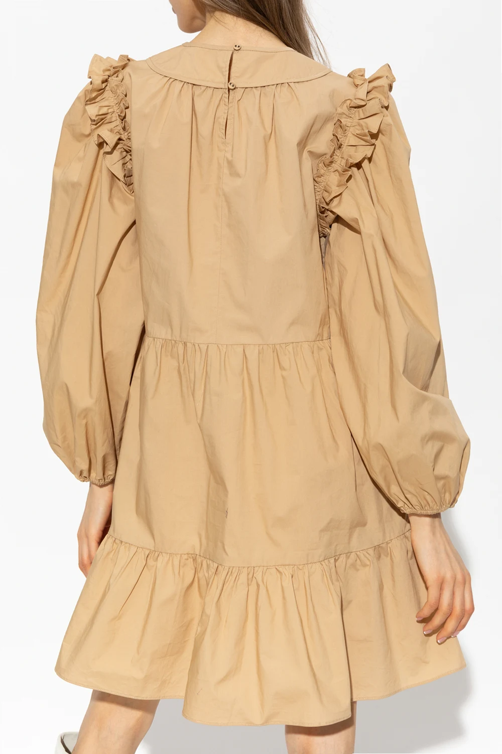 Beige ‘Rhea’ mini dress from Ulla Johnson. Crafted from cotton, this loose-fitting design features button fastenings at the back, round neck, ruffles and long puff sleeves with elasticated cuffs.