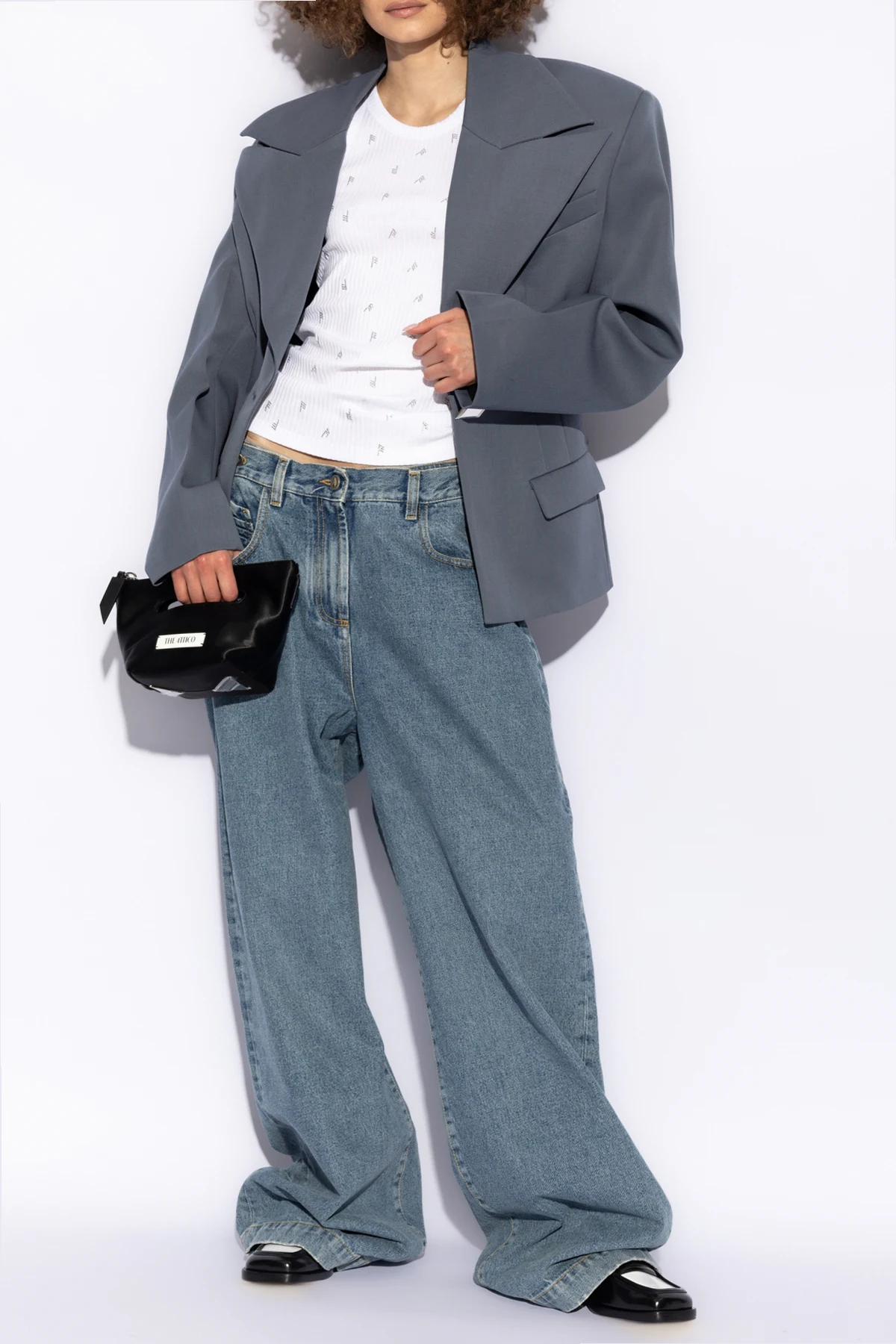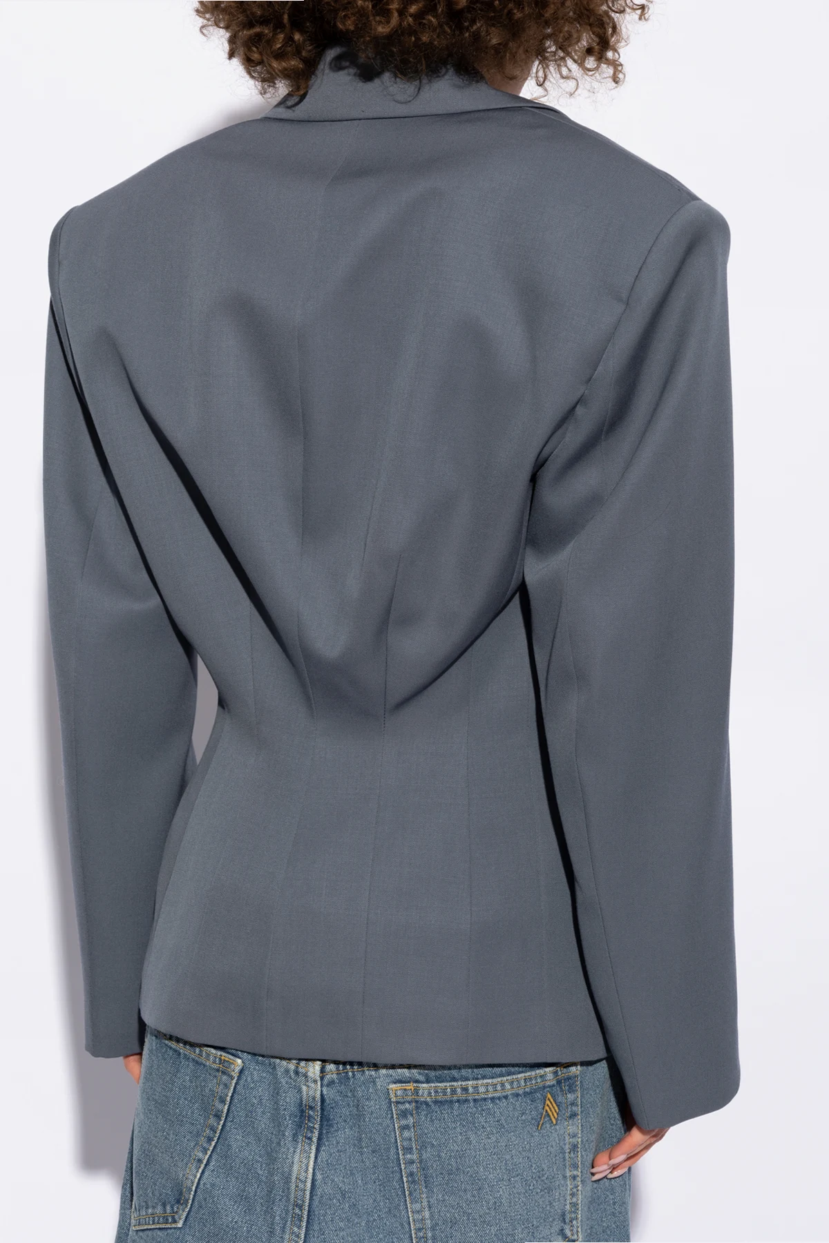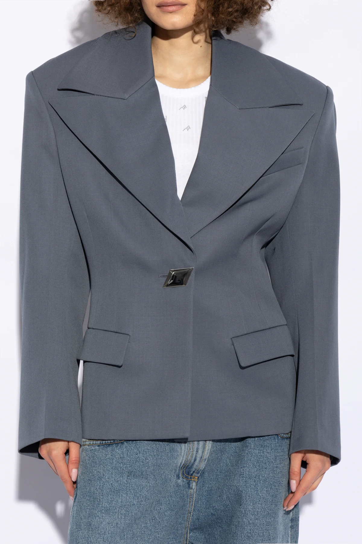 Wir präsentieren Ihnen eine äußerst elegante Wolljacke von der renommierten Marke The Attico , die den Inbegriff raffinierten Stils und unbestrittener Qualität darstellt. Dieses Einreiher-Modell zeichnet sich durch eine subtile, fast blaugraue Farbe aus, die ihm einen modernen Charakter und Vielseitigkeit verleiht. Verlängerte Revers, sorgfältig geformte Linien und ein einzigartiger Knopf in der Taille betonen die Silhouette und verleihen ihr Schlankheit und Eleganz.
