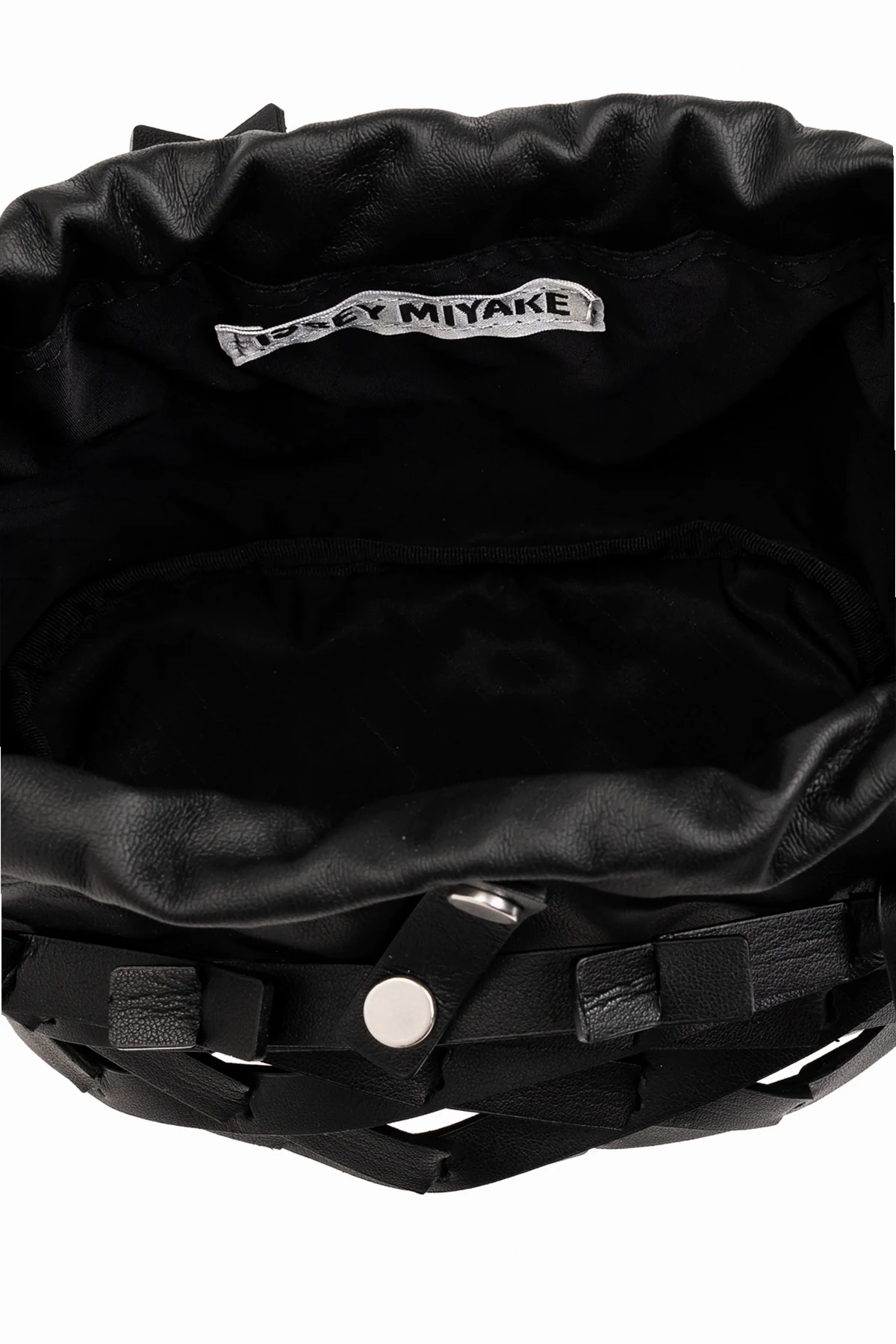Zarte Metallakzente, wie Nieten und Verschlüsse, runden das Ganze ab, wobei der minimalistische Stil und Eleganz bewahrt bleibt. Der Name der Marke Issey Miyake, sichtbar auf dem Etikett im Inneren der Tasche, unterstreicht den exklusiven Charakter dieses Accessoires.