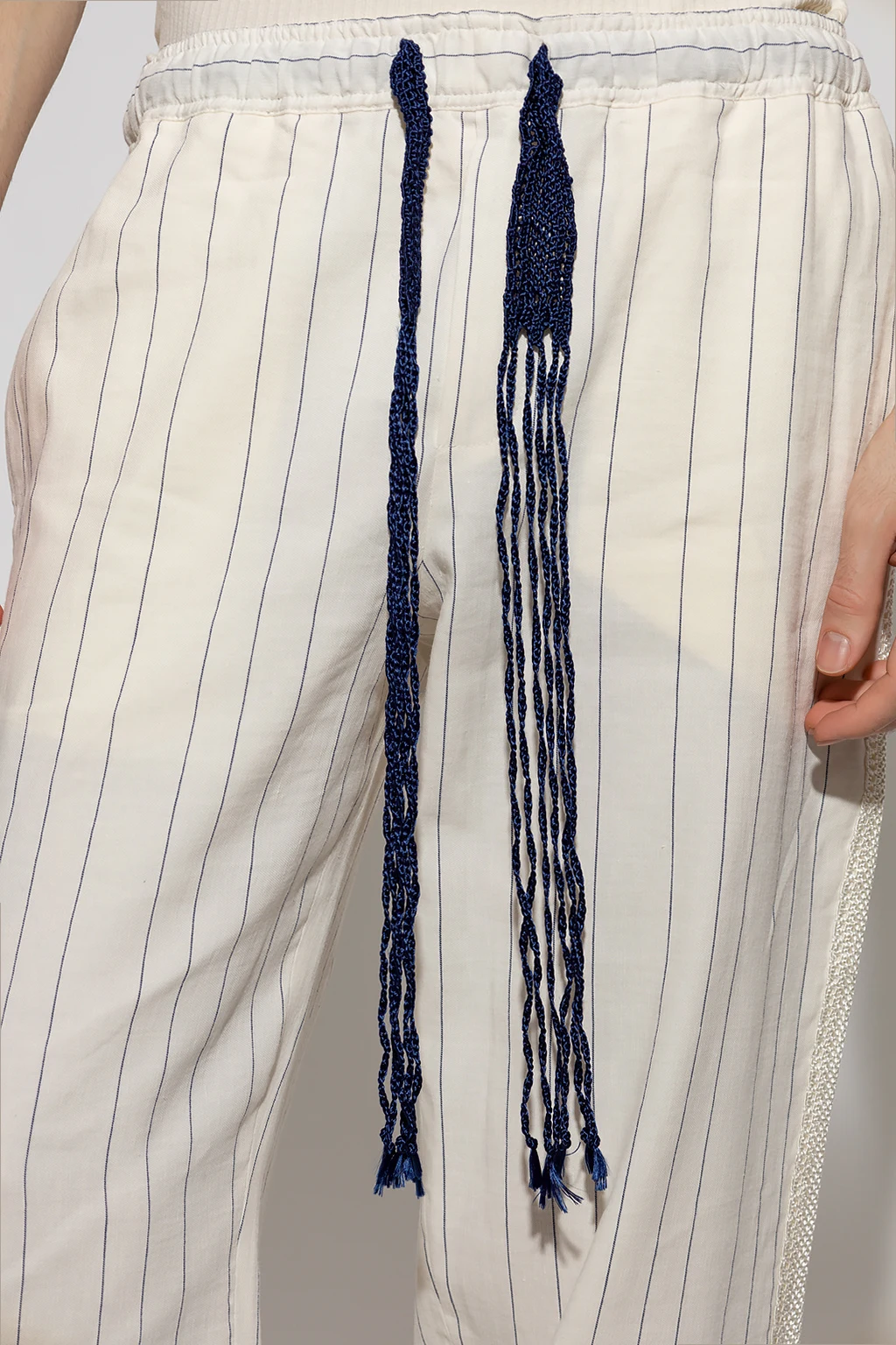 Cream ‘Soul’ trousers from Wales Bonner. Crafted from a linen and cotton blend, this pair features an elastic waistband, navy pinstripes, logo embroidery at the back, decorative woven side stripes and straight legs.