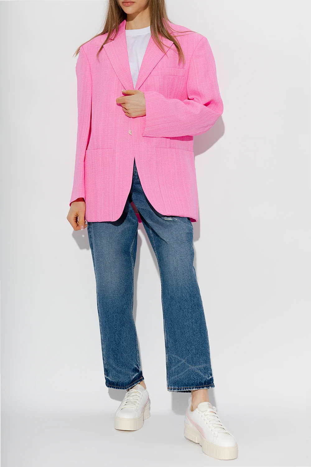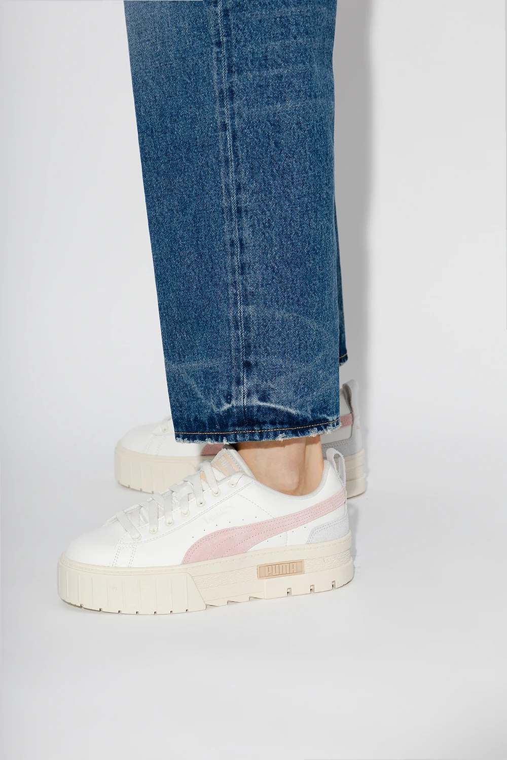 White ‘Mayze Thrifted’ platform sneakers from Puma. Crafted from faux leather, this lace-up model sits on a cream rubber sole and showcases the brand's logo and grey and pink decorative inserts.