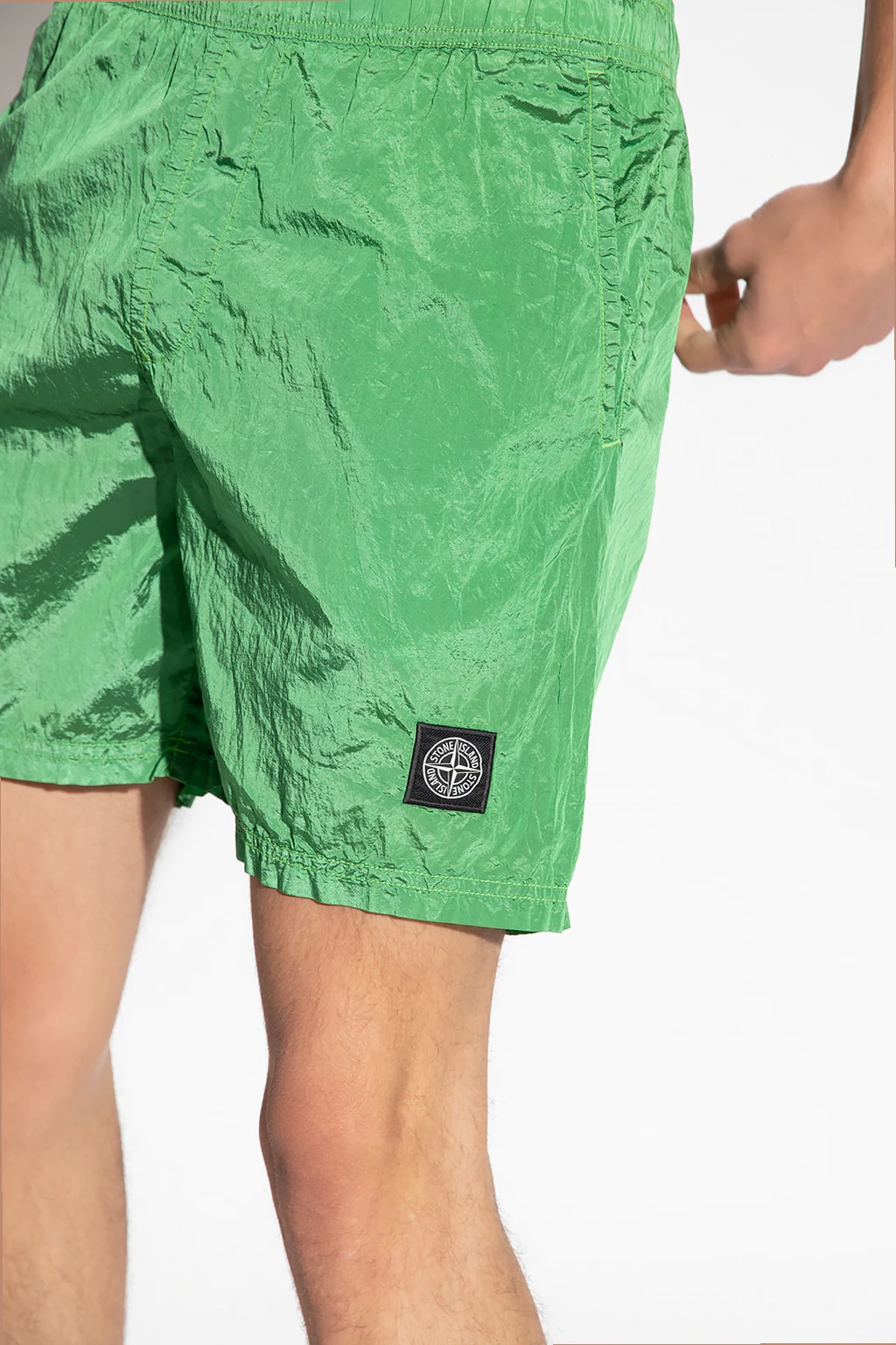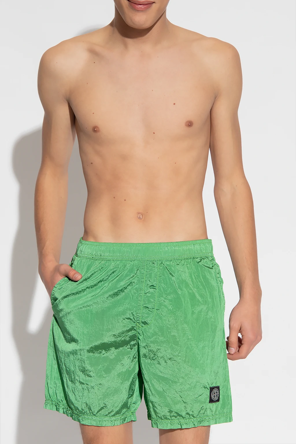 Green swim shorts from Stone Island. Made of ECONYL®, a regenerated nylon derived from ocean and land waste. Fastened with drawstrings, this pair features an elastic waistband, black and white logo print, two front pockets and one zipped back pocket.