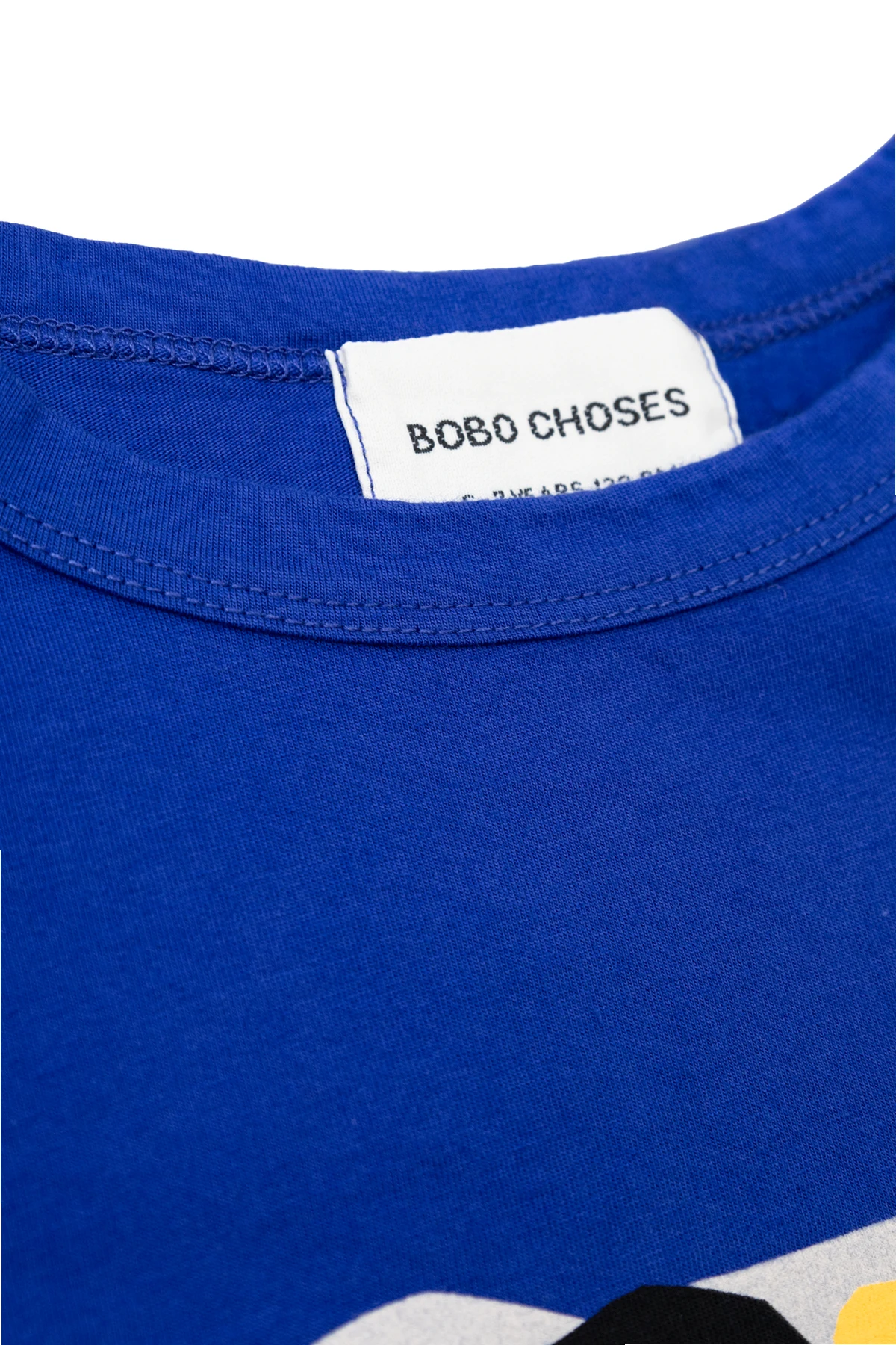 Auf der Vorderseite des T-Shirts befindet sich ein großer, bunter Aufdruck eines Hundes in Gelb- und Schwarztönen mit dem Schriftzug "BOBO CHOSES". Zusätzlich ist im Inneren des T-Shirts im Nacken ein Etikett mit dem Markennamen und der Größe (6-7 JAHRE, 116-122 CM) eingenäht.