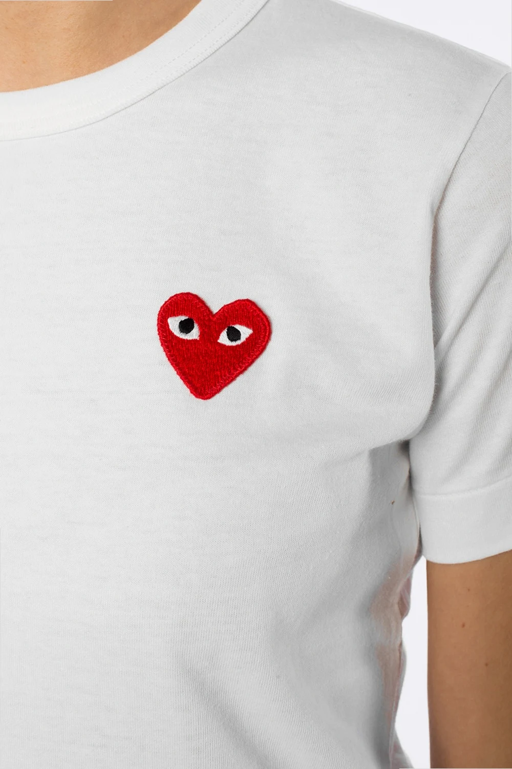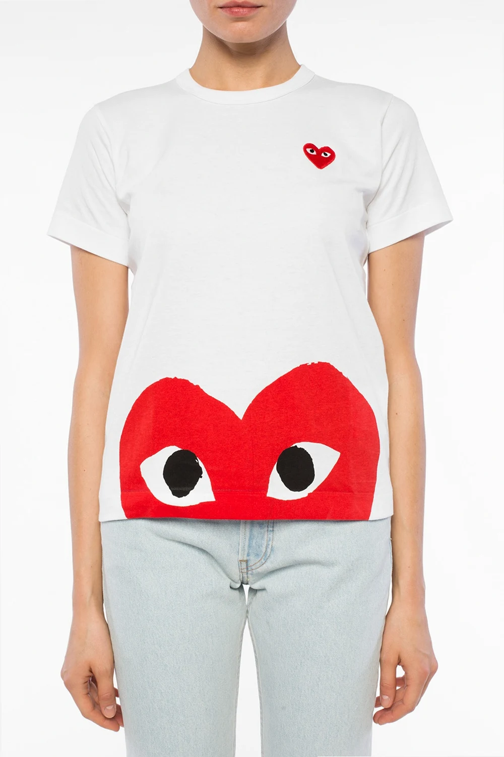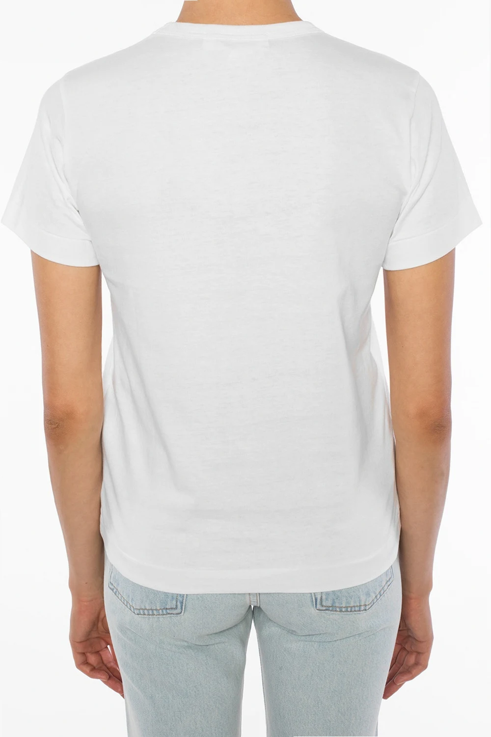 White cotton T-shirt from Comme des Garçons Play. Patch and red print with motif of heart at front. Round neck.