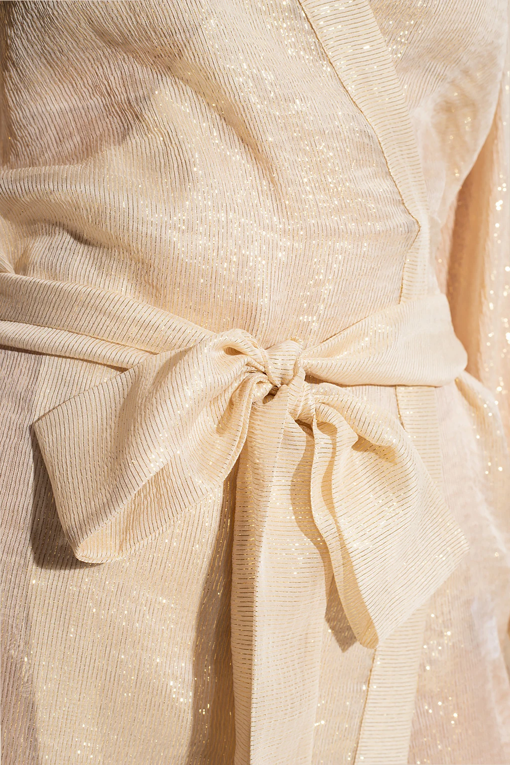Beige bathrobe from Oseree. Made of silk with a short fit, this style features lace details, stripes inlaid with gold-tone lurex yarn and a waist-cinching belt.