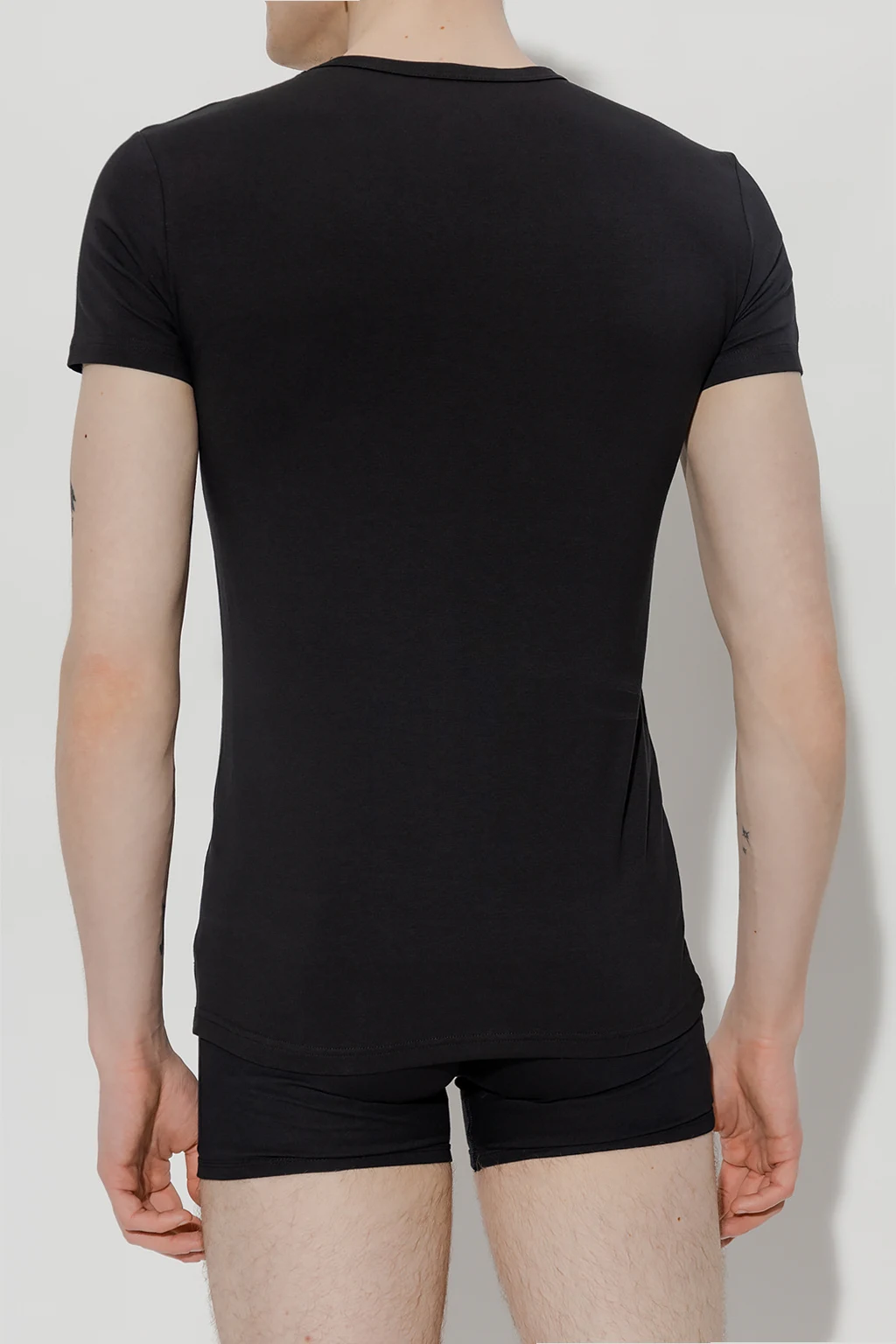 Black V-neck T-shirt two-pack from Emporio Armani, the 'Underwear' collection. Made of cotton, each item has short sleeves and a printed grey logo.